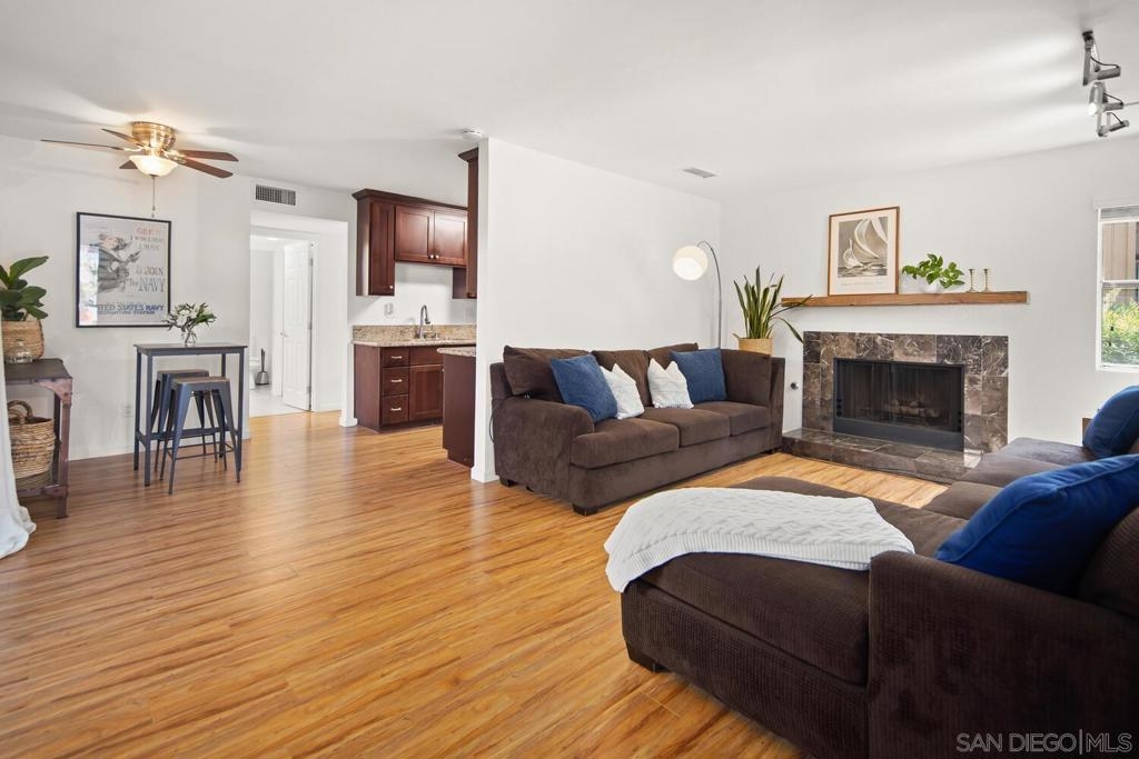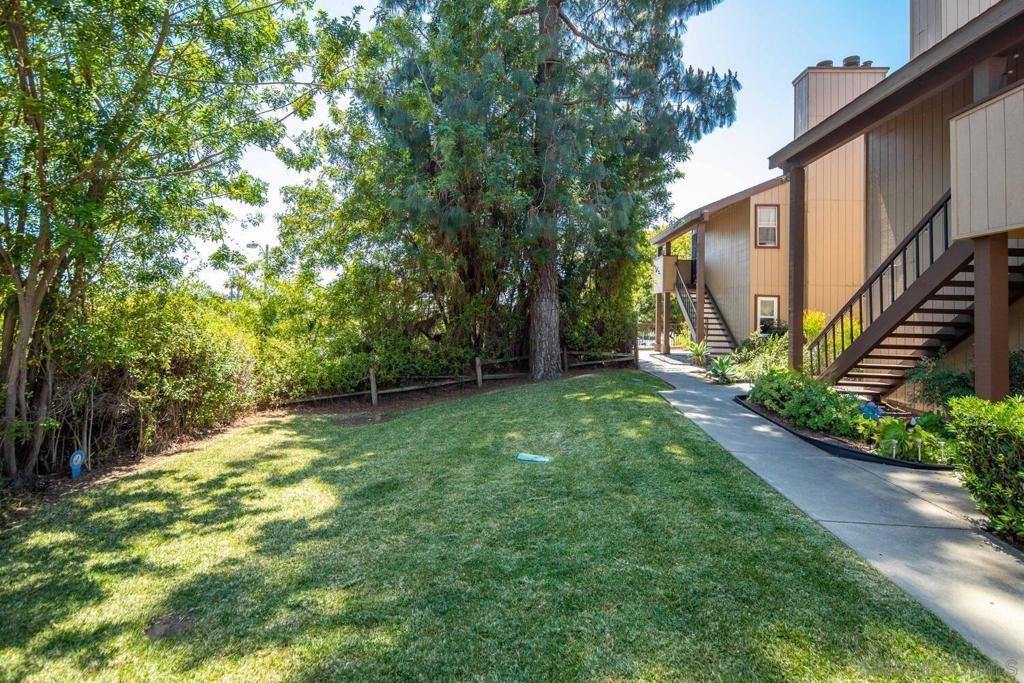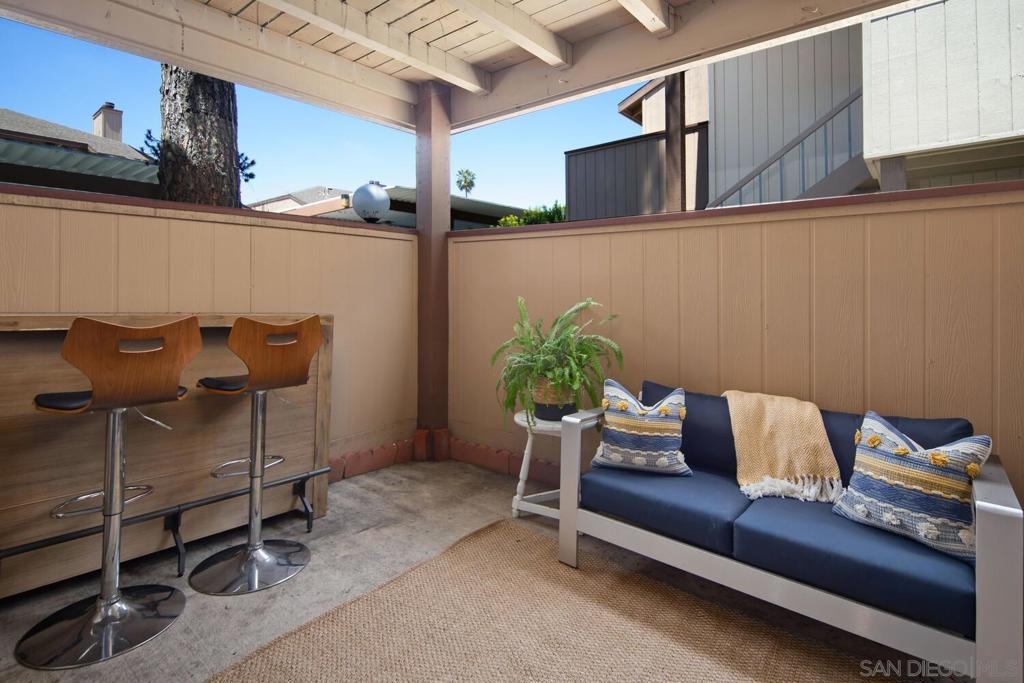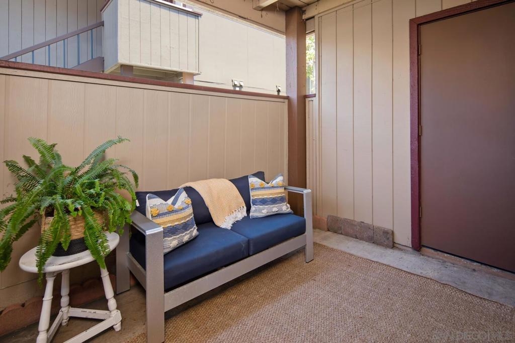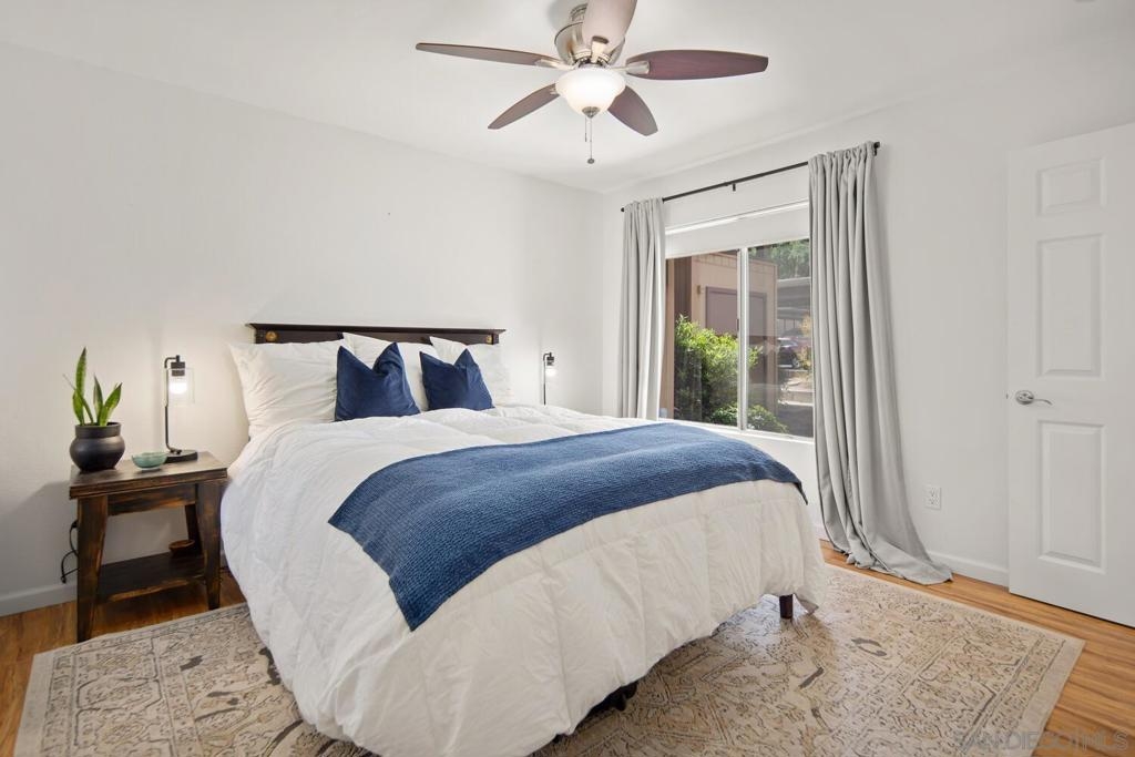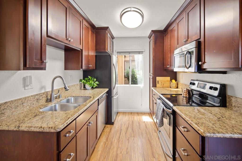 This 2 bedroom, 1.25 bath corner unit boasts expansive bedrooms and wood-like flooring throughout. The updated kitchen and bathrooms feature granite countertops and stainless steel appliances, while AC ensures year round comfort. Enjoy the convenience of having full size in unit laundry and a spacious layout that extends to a large private patio with a generous storage closet. This well maintained complex includes a pool area with a spa and a small park. This unit has an assigned covered parking spot outside the front door and ample visitor parking. This San Diego condo is well positioned just minutes from the 94 Freeway and within walking distance to Starbucks, the gym and shopping making it a great home or investment property. VA approved.