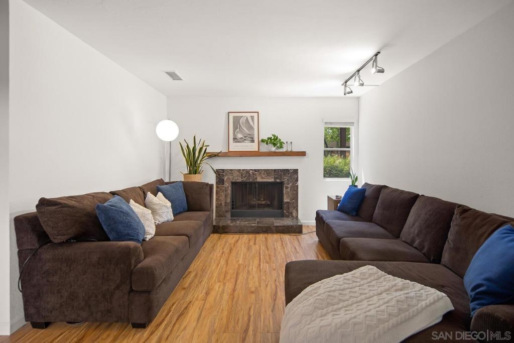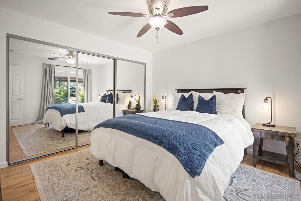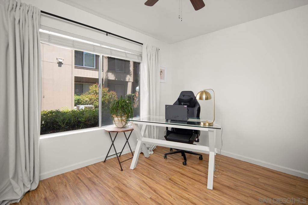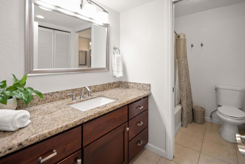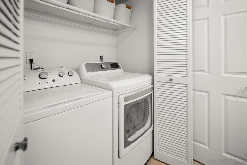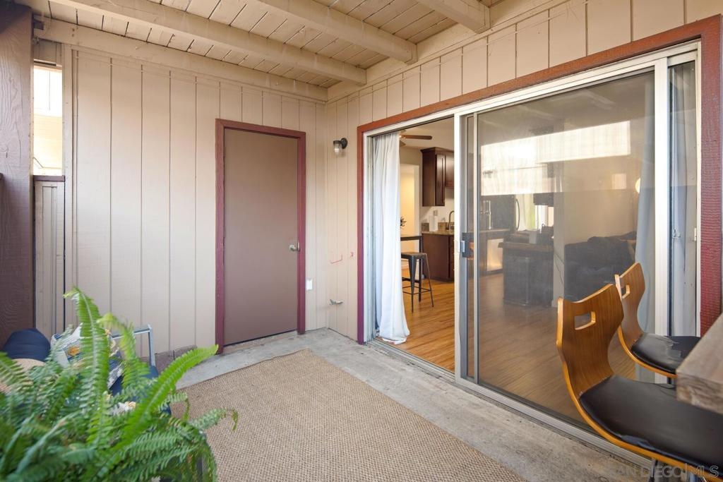 This 2 bedroom, 1.25 bath corner unit boasts expansive bedrooms and wood-like flooring throughout. The updated kitchen and bathrooms feature granite countertops and stainless steel appliances, while AC ensures year round comfort. Enjoy the convenience of having full size in unit laundry and a spacious layout that extends to a large private patio with a generous storage closet. This well maintained complex includes a pool area with a spa and a small park. This unit has an assigned covered parking spot outside the front door and ample visitor parking. This San Diego condo is well positioned just minutes from the 94 Freeway and within walking distance to Starbucks, the gym and shopping making it a great home or investment property. VA approved.