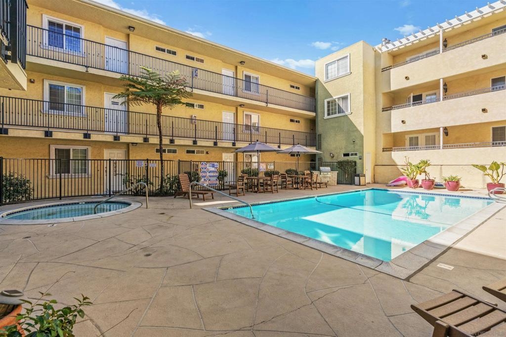 Top floor condo at Collwood Point, just 1 mile from SDSU! Quiet location in complex away from street with green treetop views from your spacious balcony. Unit offers a nice complement of upgrades including remodeled kitchen and bathroom, recessed lighting, lighting fixtures, appliances & dual pane windows. Also comes with in-unit laundry, storage room & a dedicated parking space. Complex provides a sparkling pool & spa, BBQ and fitness room with very reasonable monthly HOA Dues.