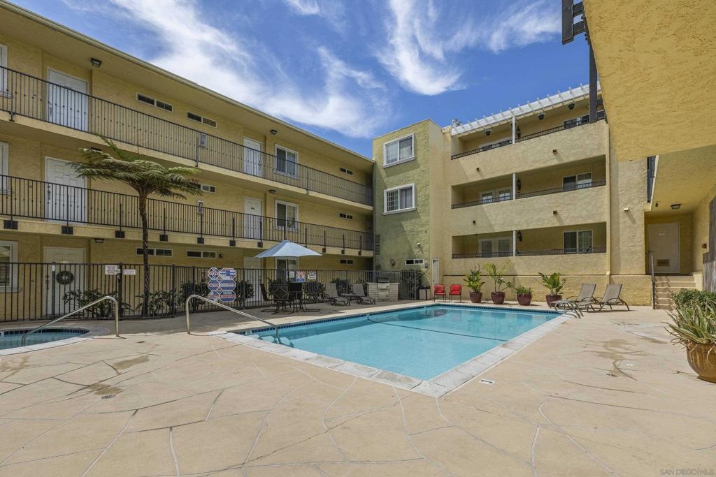 Fantastic Investment opportunity! Private corner unit with open floorplan and abundant natural light. Fresh neutral paint, wide-plank LVP, and brand new carpet accentuate the vaulted ceilings and architectural details. The updated kitchen features granite and stainless-steel appliances. Ideal for a roommate situation – the bedrooms are on opposite sides of the main living area. Primary bedroom features 2 closets, an en-suite bath, and a bonus nook that’s perfect for a study desk. The second bedroom includes a walk-in closet and built-in shelves. This move-in ready unit also includes a stacked washer/dryer, private balcony, and one assigned parking space (#59). Collwood Point amenities include gated access, a pool & spa, and an exercise room. Conveniently located close to SDSU, shopping, dining, and entertainment with close access to freeways, transportation, and the best San Diego has to offer. Complex Features: ,,, Equipment: Dryer, Washer Sewer: Sewer Connected Topography: LL