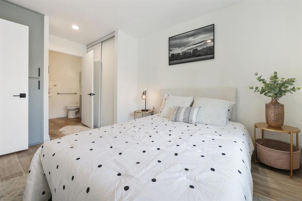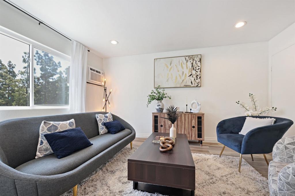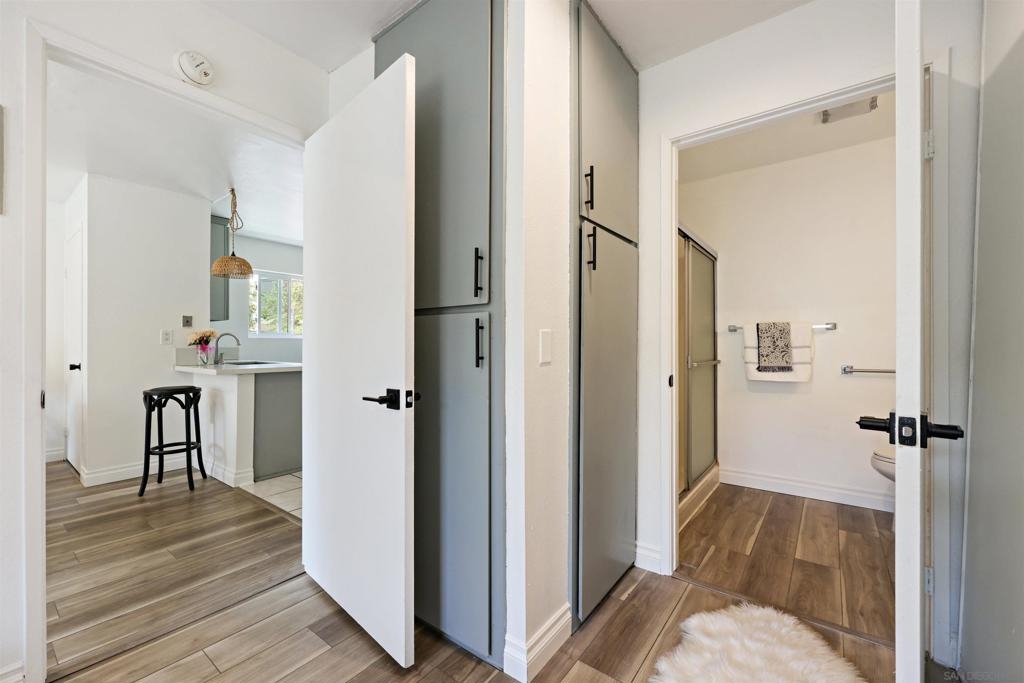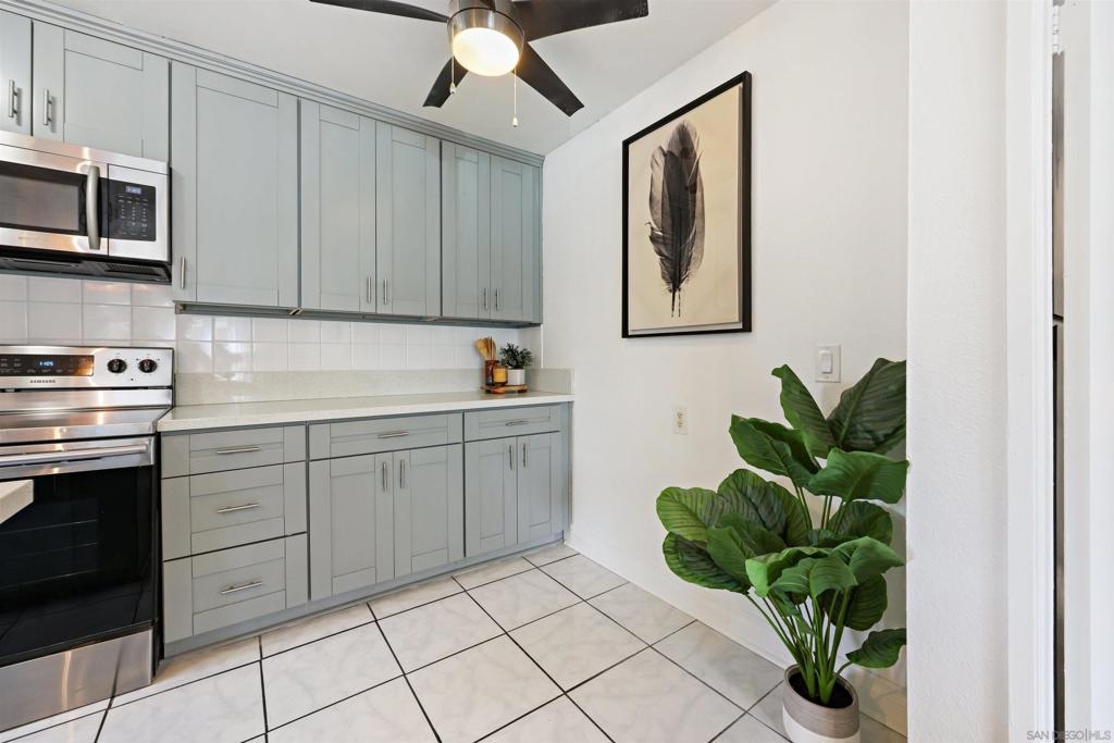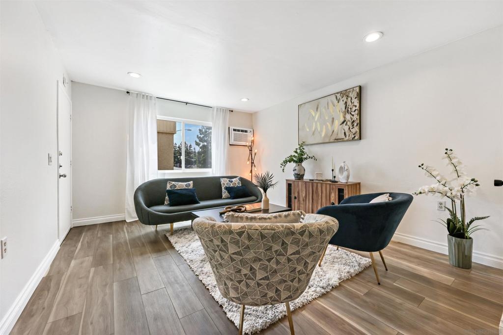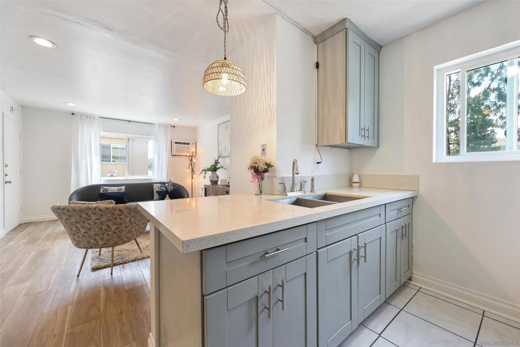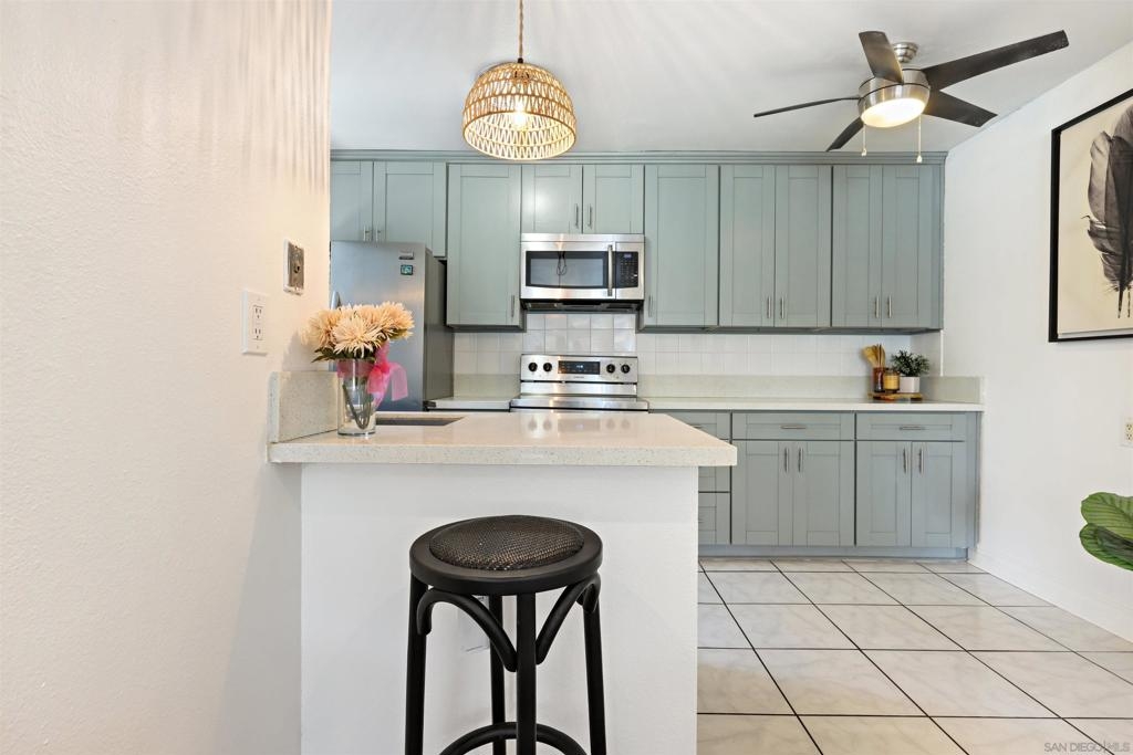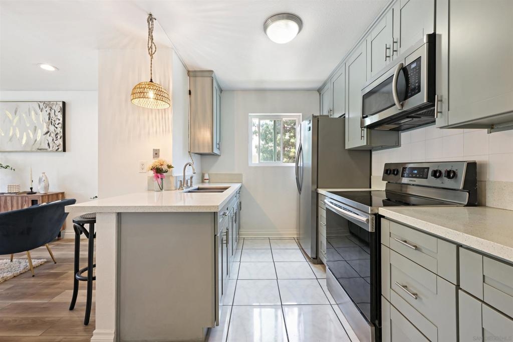 City living at its best in this 1 bedroom fully remodeled end unit with solid stone countertops and luxury vinyl wood grain flooring. Mesa Greens has some of the lowest HOA dues in the city and includes trash, water and sewer. Newer cabinets and all appliances convey, furnishings negotiable. If you love walkability to the community and the famous Kroc Center, this home is perfect. You are minutes from freeways, SDSU, downtown and beaches. You will rarely find a remodeled unit under 400k. Community laundry room nearby but with HOA approval, you could possibly add stackable unit to living room closet.