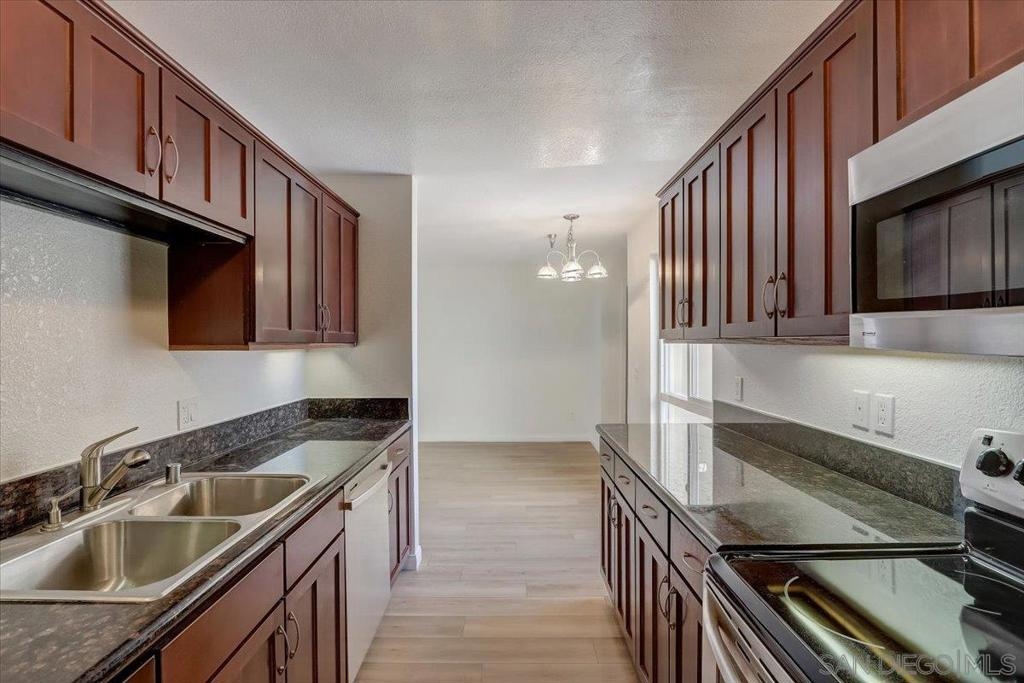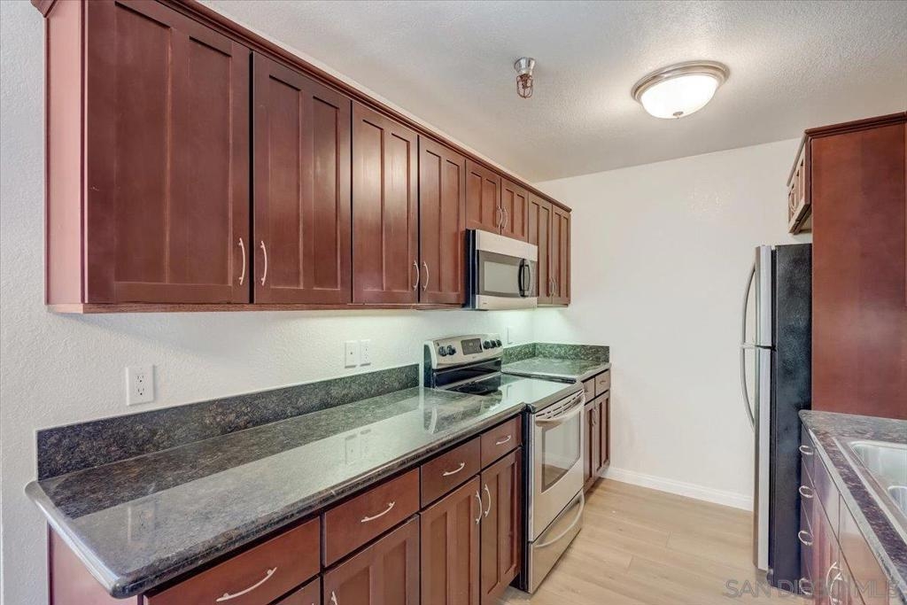 Best location in the complex! Top Floor with e-z elevator access, overlooking park, in gated complex with community pool/spa/rec room and large front patio area and balcony. Balcony overlooks Colina Park Golf Course and Tennis Center with views of city lights. Close to SDSU, Talmadge, shopping and restaurants. Freshly painted w/brand new vinyl plank floors throughout. Washer/Dryer in unit. Stainless appliances, granite countertops, oversized closet & pantry. Quick freeway access. Great income property potential! Pets ok w/restrictions. 1 uncovered parking space. PROBATE listing.