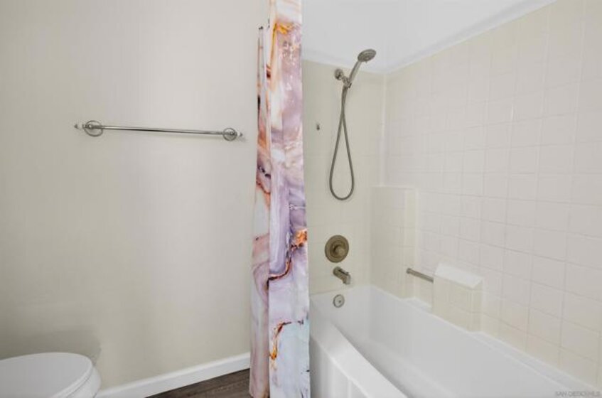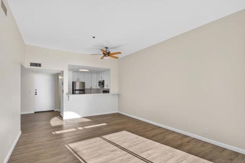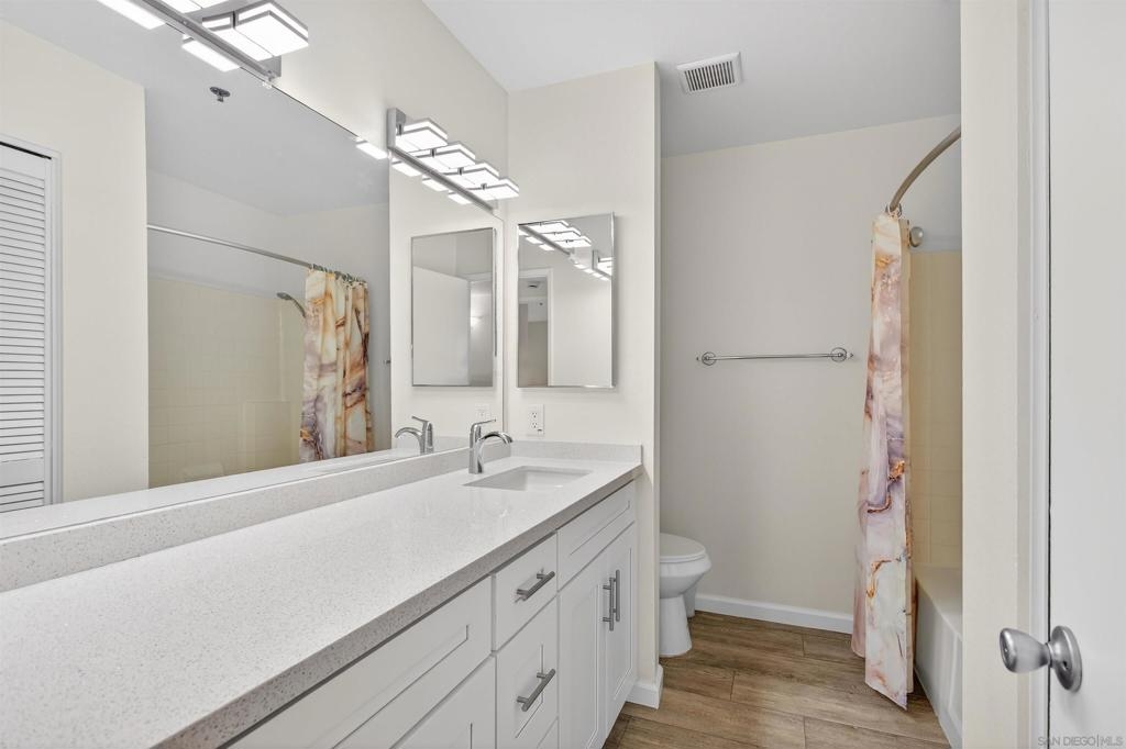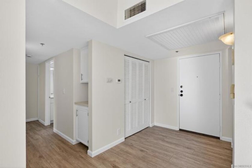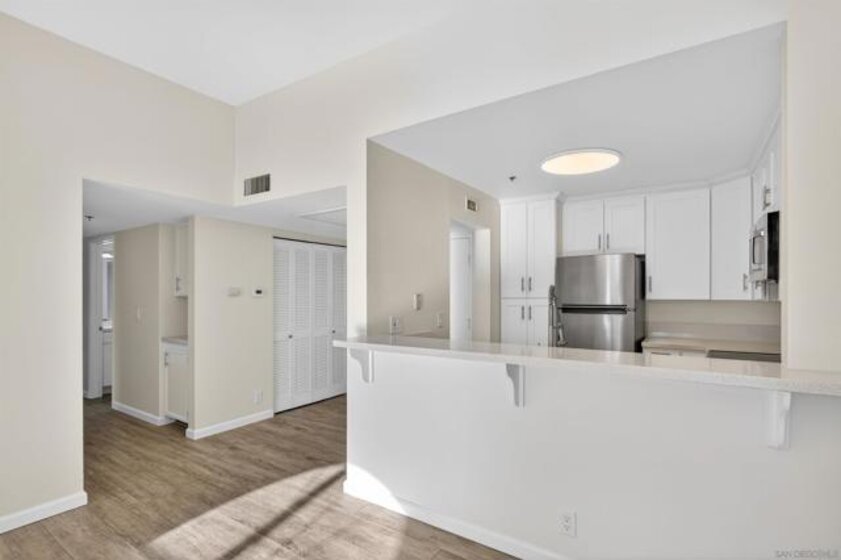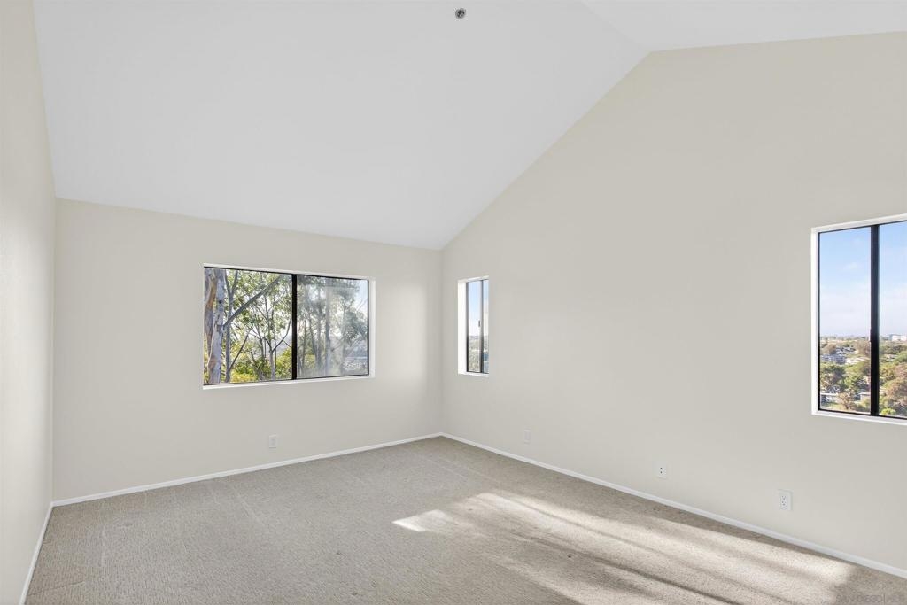 Enjoy panoramic views from every room, including fireworks at Sea World, in this fully renovated top floor corner unit condo with vaulted ceilings. The open floor plan features a breakfast bar and spacious living room and large bedrooms. This unit is move-in ready and very private with only 1 shared wall. Your private patio offers outdoor entertaining & dining space, expansive views and a large storage closet.