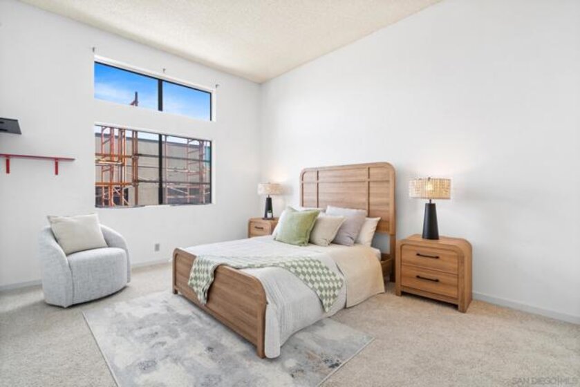 Welcome home to this bright and stylish 2-bed, 2-bath condo on the top (4th) floor, offering vaulted ceilings, abundant natural light, and no neighbors above you for added privacy and quiet. Enjoy freshly painted designer cabinets, updated fixtures, wood-style flooring, new carpet in bedrooms and tile in kitchen and bathrooms, plus in-unit laundry and extra balcony storage. The spacious primary suite features high ceilings, double closets, and a generous vanity. **Newer Heater & AC system** (installed 2023) and **secure gated parking**. The building exterior is currently undergoing renovation, adding fresh curb appeal and long-term value to the property. Anticipated completion by the end of 2025. Conveniently located near SDSU, freeways, shopping, and dining, just 20 minutes to the beach, downtown, and naval bases. Perfect for first-time buyers, military families, students, professionals, or investors seeking a move-in-ready home in a quiet, improving community.