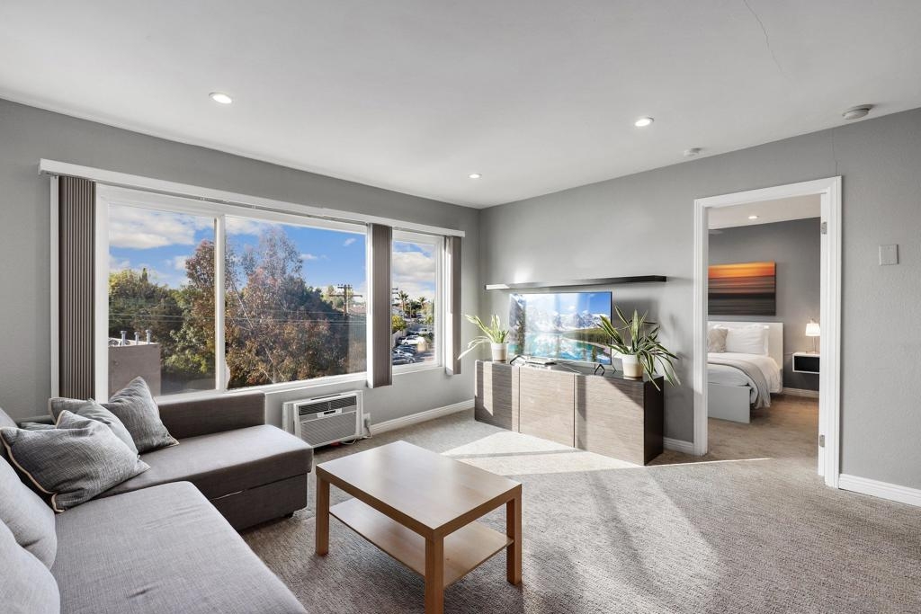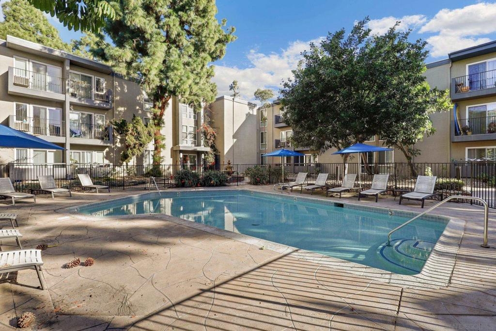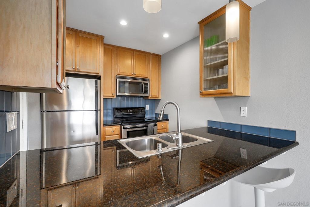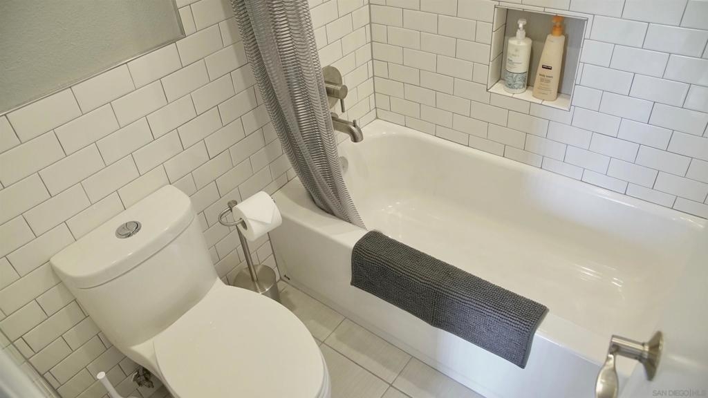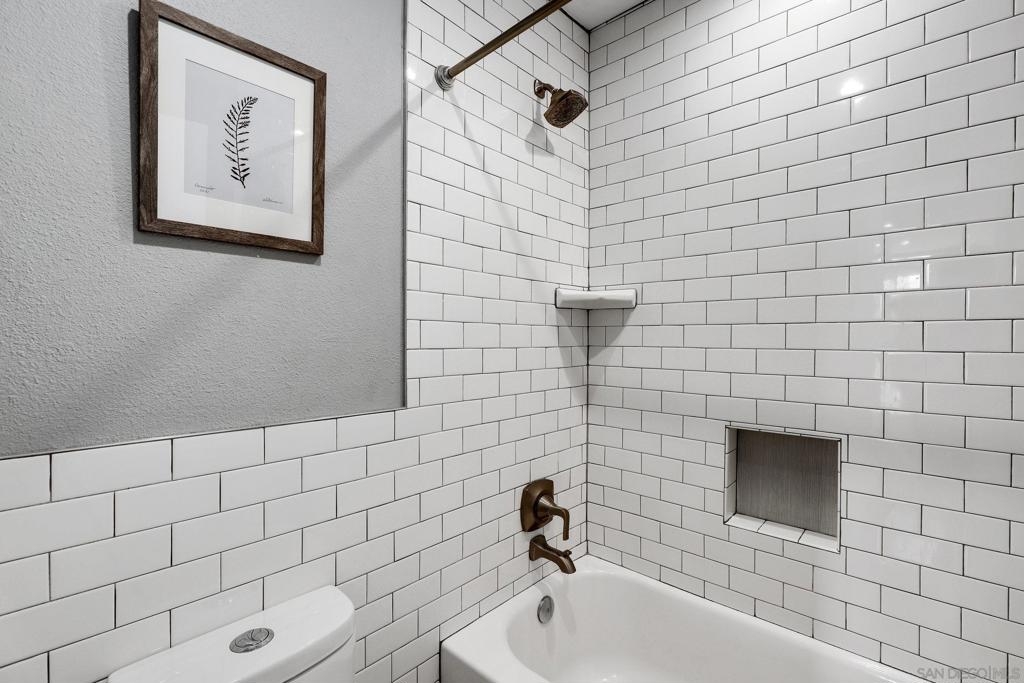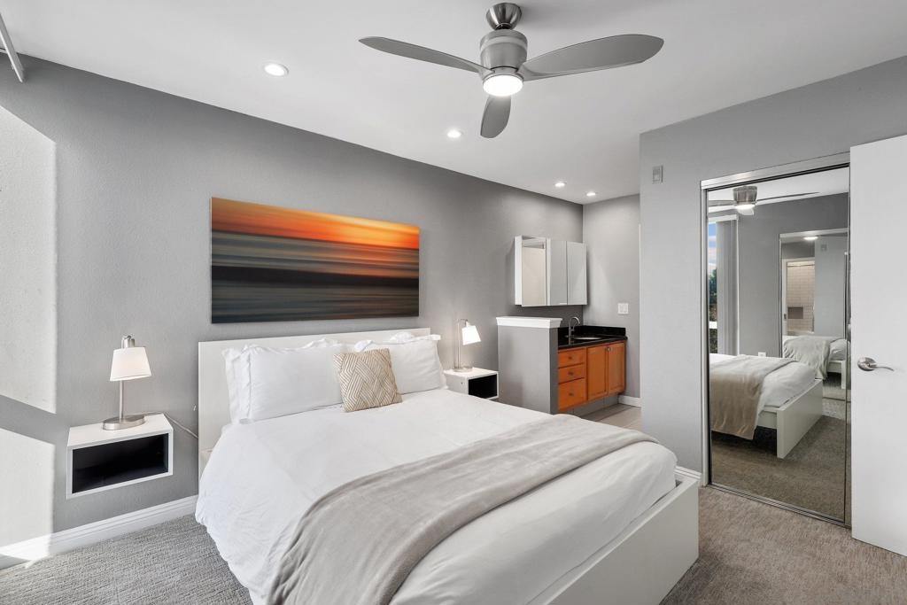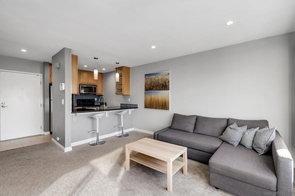 Top Floor Condo nestled within the gated Tuscany Place Complex in San Diego!! Enter this turnkey retreat to find a light and bright floor plan with modern touches throughout. This move-in ready unit features: a fully updated semi-open galley kitchen with stainless steel appliances, newer carpet, the addition of upgraded lighting including new can lights, pendant lights, closet lights and dimmer switches, a wall heater and window A/C unit, a spacious primary bedroom with a fully renovated ensuite bathroom, and so much more!! The Tuscany Place Complex offers its residents access to the community pool, spa, BBQ, laundry area and exercise room, and is one of the few larger complexes that allows short term Airbnb rentals!! The property is located near great shopping, restaurants, SDSU, and has freeway access! Top floor units in this complex have historically sold for $350K or more. This unit includes tons of upgrades and comes sold fully furnished. Perfect for a college student or rental property. FHA & VA Approved!! Don't wait - book a tour before it's gone. Home to be sold fully furnished. Room Dimensions are estimates.