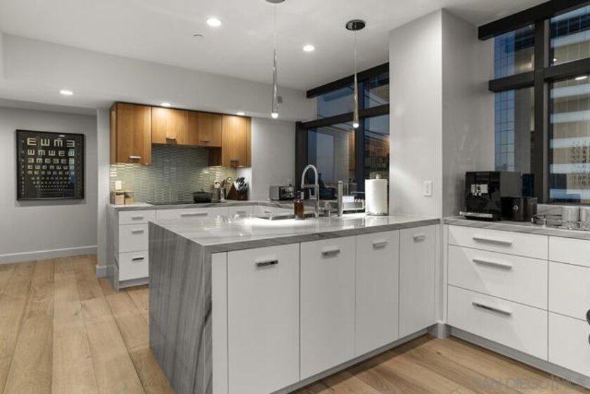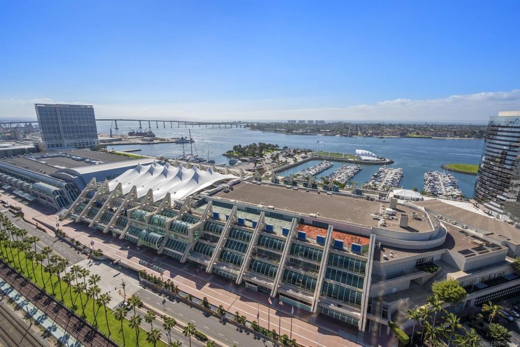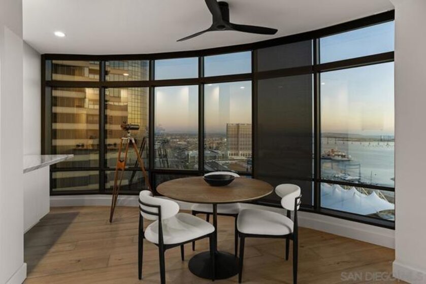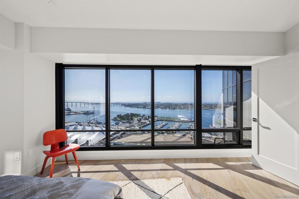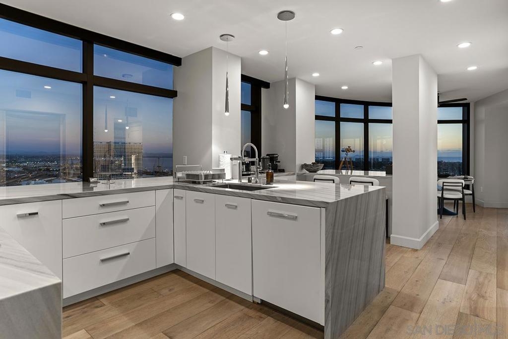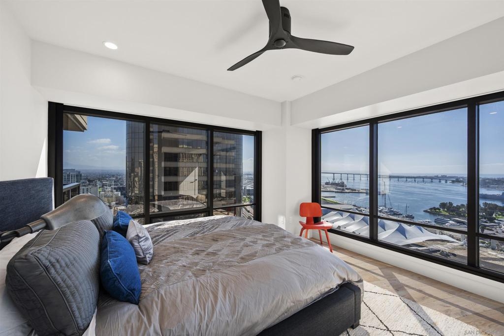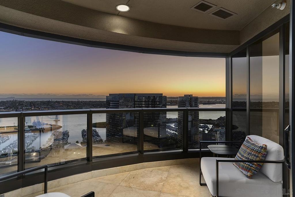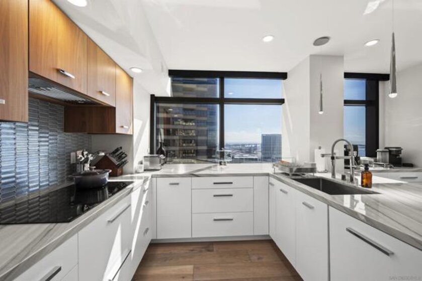 Spanning over half the 28th floor at Harbor Club, this three-bedroom residence has recently been completely reimagined into one of Downtown San Diego's most extraordinary homes. Floor-to-ceiling views stretch in every direction, from the harbor and Coronado to the city skyline and beyond. Hardwood floors flow through the open living areas, complemented by updated ceiling fans and recessed lighting that keep the spaces feeling clean and modern. The kitchen is the kind of room that stops you mid-conversation: crisp white cabinetry paired with warm walnut uppers, veined marble countertops, a striking blue hexagonal tile backsplash, and sweeping bay views through a dramatic curved window wall. A Sub-Zero refrigerator, wall oven, speed oven, and induction cooktop (all Wolf) make it as serious about cooking as it is about aesthetics, while a polished marble bar overlooking the water offers the best seat in the house. The expansive primary suite is a destination itself, with sweeping views, a spaciously organized walk-around closet and large bath. A dedicated powder room with artisan glass and a vessel sink add a boutique touch, while the third bedroom doubles as a home office. Storage in the unit is abundant. Two balconies extend the living space outdoors, and three side-by-side parking spaces (a rarity with Downtown condos) round out the offering. Residents of the Harbor Club are treated to an array of lavish, resort-inspired amenities that encompass a round-the-clock front desk service, a state-of-the-art gymnasium, an exquisite pool deck, a sociable club room, and a versatile library/business center, among numerous other perks. Nestled in the much-coveted Marina District, the Harbor Club boasts unparalleled ease in traversing the neighborhood on foot, granting effortless access to an array of transportation options, delectable dining establishments, retail therapy, the iconic ballpark, the pulsating Gaslamp Quarter, the artsy East Village, and the scenic Embarcadero – an idyllic setting for serene walks alongside the bay.