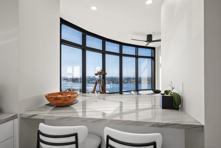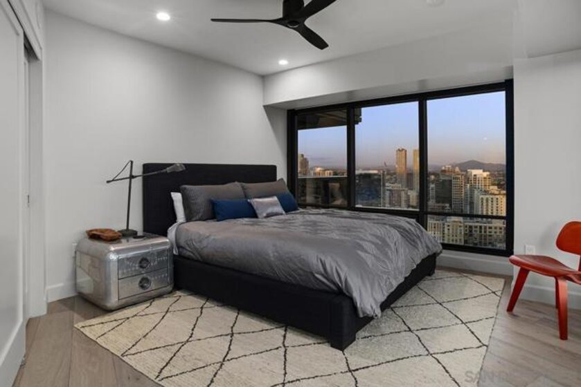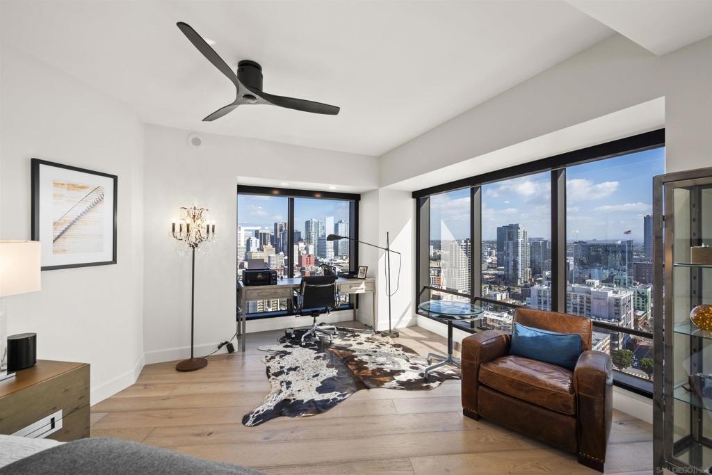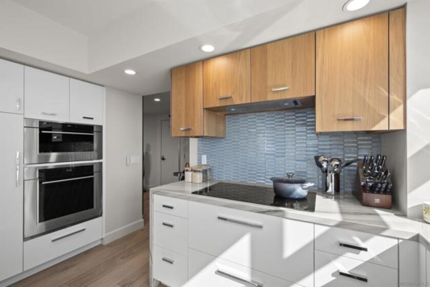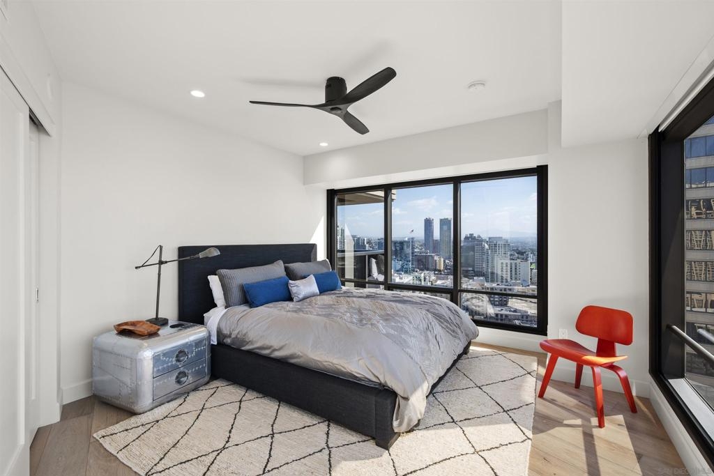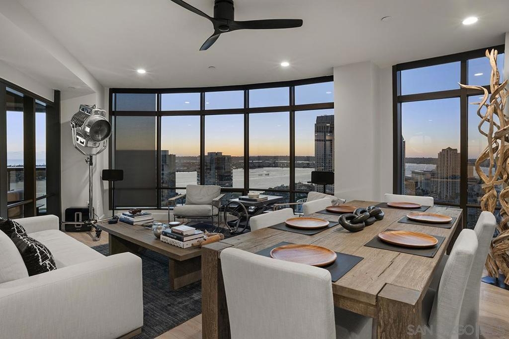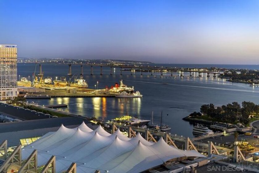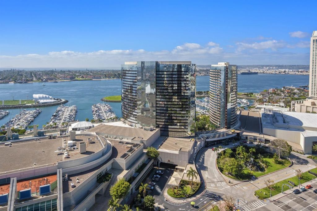 Spanning over half the 28th floor at Harbor Club, this three-bedroom residence has recently been completely reimagined into one of Downtown San Diego's most extraordinary homes. Floor-to-ceiling views stretch in every direction, from the harbor and Coronado to the city skyline and beyond. Hardwood floors flow through the open living areas, complemented by updated ceiling fans and recessed lighting that keep the spaces feeling clean and modern. The kitchen is the kind of room that stops you mid-conversation: crisp white cabinetry paired with warm walnut uppers, veined marble countertops, a striking blue hexagonal tile backsplash, and sweeping bay views through a dramatic curved window wall. A Sub-Zero refrigerator, wall oven, speed oven, and induction cooktop (all Wolf) make it as serious about cooking as it is about aesthetics, while a polished marble bar overlooking the water offers the best seat in the house. The expansive primary suite is a destination itself, with sweeping views, a spaciously organized walk-around closet and large bath. A dedicated powder room with artisan glass and a vessel sink add a boutique touch, while the third bedroom doubles as a home office. Storage in the unit is abundant. Two balconies extend the living space outdoors, and three side-by-side parking spaces (a rarity with Downtown condos) round out the offering. Residents of the Harbor Club are treated to an array of lavish, resort-inspired amenities that encompass a round-the-clock front desk service, a state-of-the-art gymnasium, an exquisite pool deck, a sociable club room, and a versatile library/business center, among numerous other perks. Nestled in the much-coveted Marina District, the Harbor Club boasts unparalleled ease in traversing the neighborhood on foot, granting effortless access to an array of transportation options, delectable dining establishments, retail therapy, the iconic ballpark, the pulsating Gaslamp Quarter, the artsy East Village, and the scenic Embarcadero – an idyllic setting for serene walks alongside the bay.