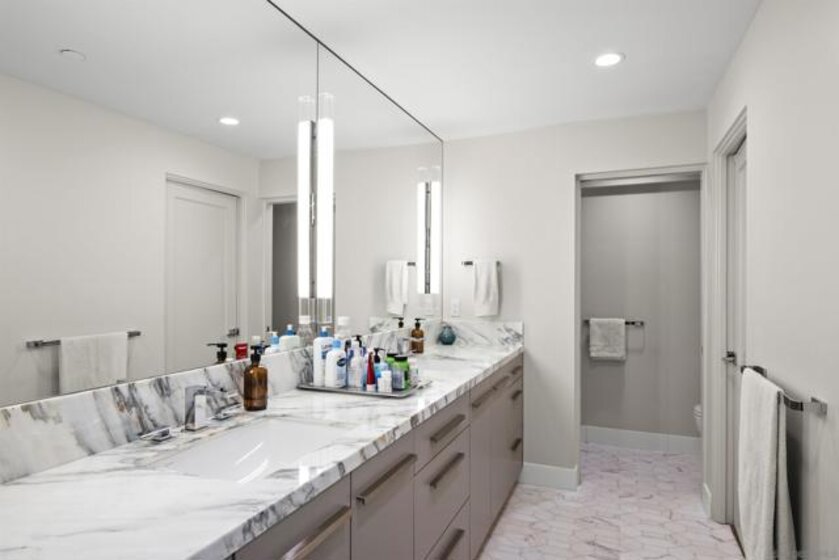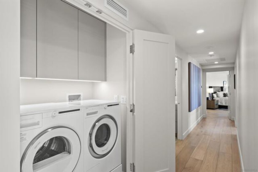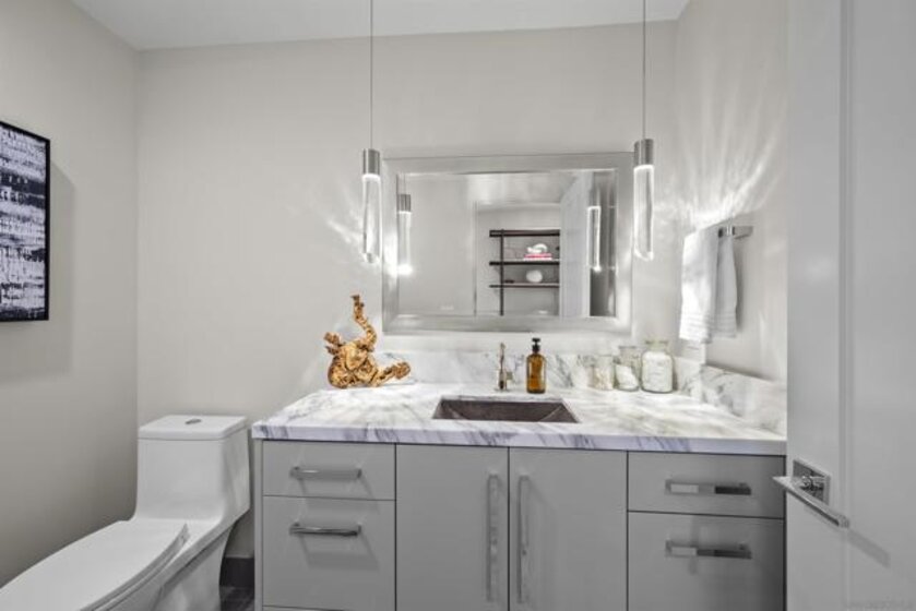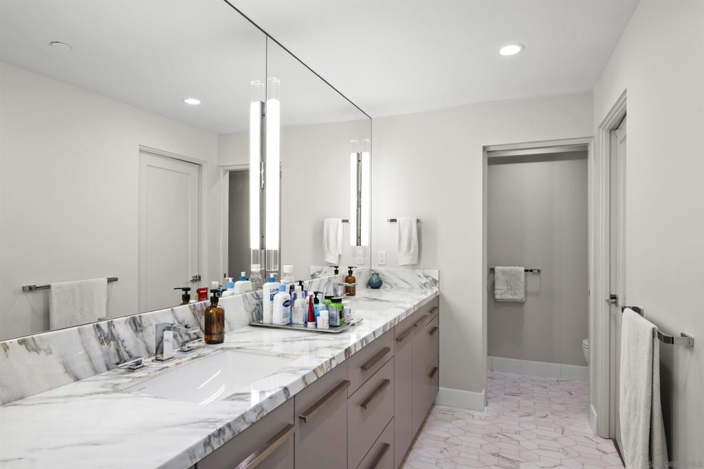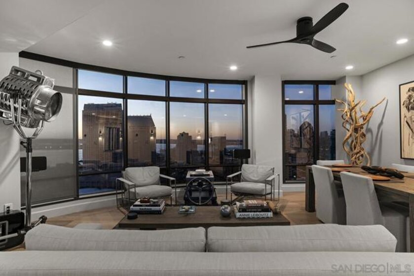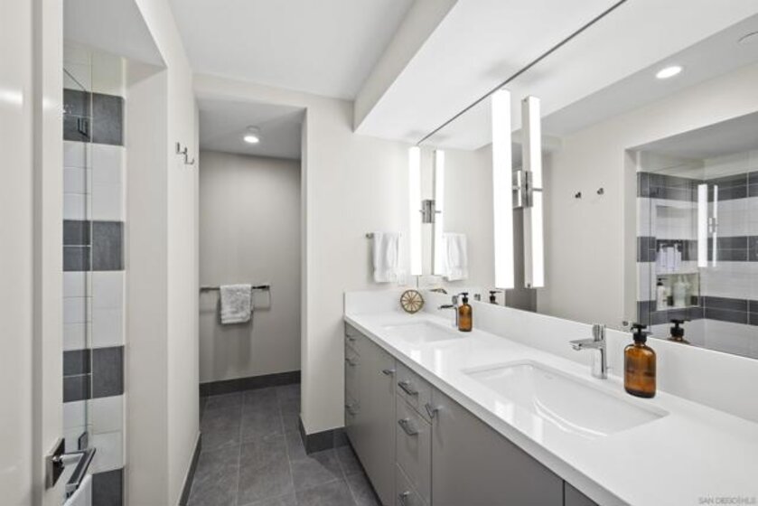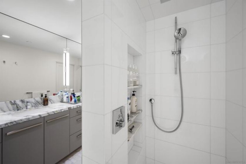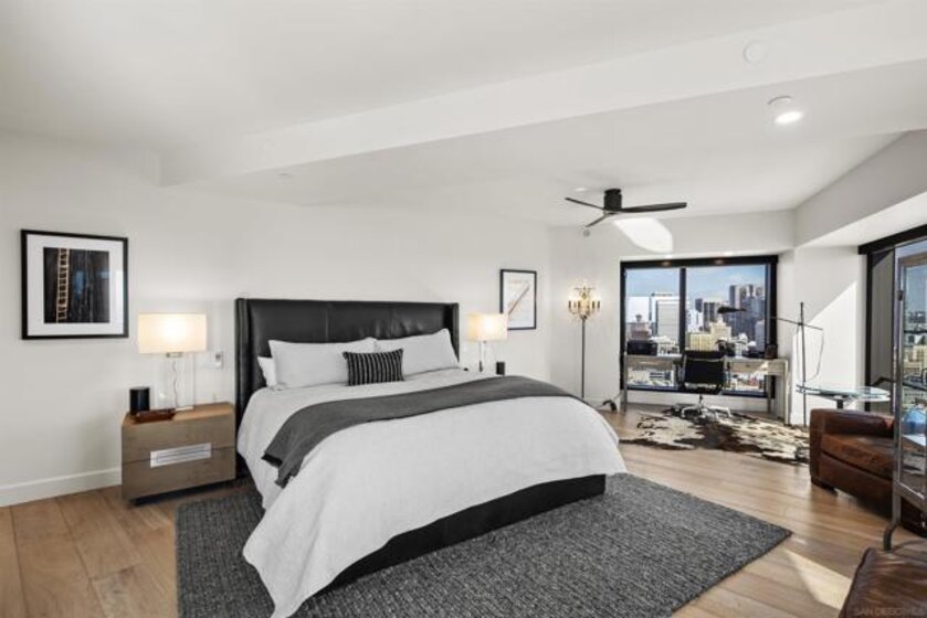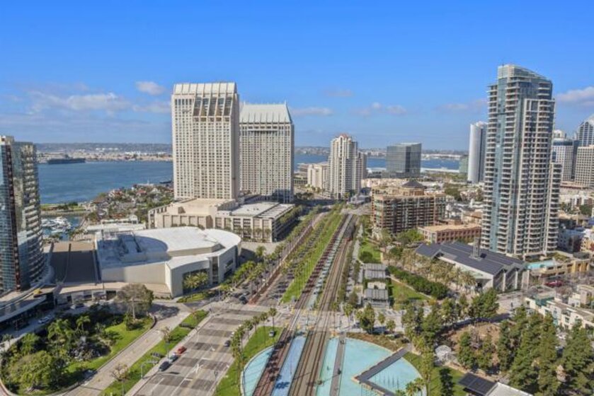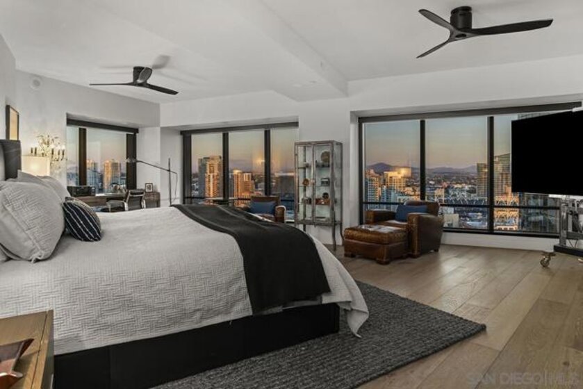 Spanning over half the 28th floor at Harbor Club, this three-bedroom residence has recently been completely reimagined into one of Downtown San Diego's most extraordinary homes. Floor-to-ceiling views stretch in every direction, from the harbor and Coronado to the city skyline and beyond. Hardwood floors flow through the open living areas, complemented by updated ceiling fans and recessed lighting that keep the spaces feeling clean and modern. The kitchen is the kind of room that stops you mid-conversation: crisp white cabinetry paired with warm walnut uppers, veined marble countertops, a striking blue hexagonal tile backsplash, and sweeping bay views through a dramatic curved window wall. A Sub-Zero refrigerator, wall oven, speed oven, and induction cooktop (all Wolf) make it as serious about cooking as it is about aesthetics, while a polished marble bar overlooking the water offers the best seat in the house. The expansive primary suite is a destination itself, with sweeping views, a spaciously organized walk-around closet and large bath. A dedicated powder room with artisan glass and a vessel sink add a boutique touch, while the third bedroom doubles as a home office. Storage in the unit is abundant. Two balconies extend the living space outdoors, and three side-by-side parking spaces (a rarity with Downtown condos) round out the offering. Residents of the Harbor Club are treated to an array of lavish, resort-inspired amenities that encompass a round-the-clock front desk service, a state-of-the-art gymnasium, an exquisite pool deck, a sociable club room, and a versatile library/business center, among numerous other perks. Nestled in the much-coveted Marina District, the Harbor Club boasts unparalleled ease in traversing the neighborhood on foot, granting effortless access to an array of transportation options, delectable dining establishments, retail therapy, the iconic ballpark, the pulsating Gaslamp Quarter, the artsy East Village, and the scenic Embarcadero – an idyllic setting for serene walks alongside the bay.