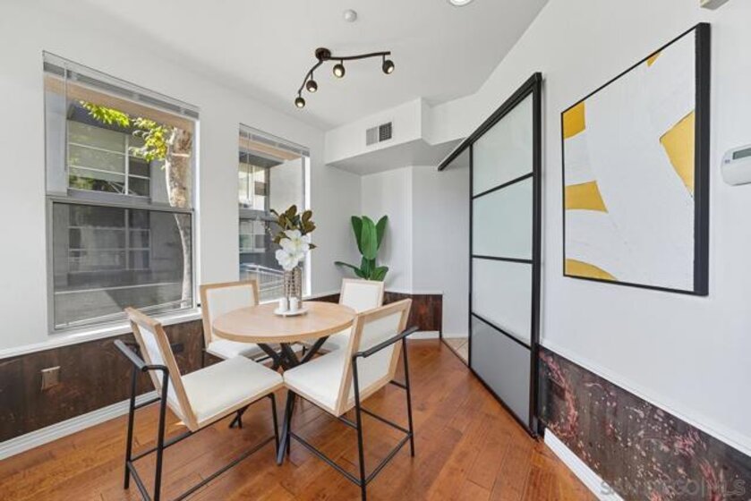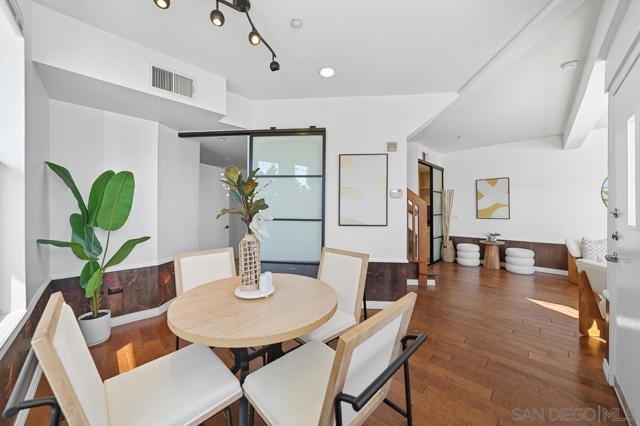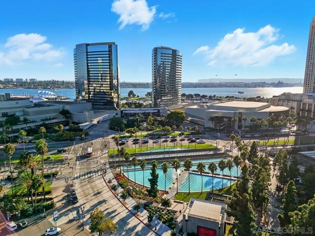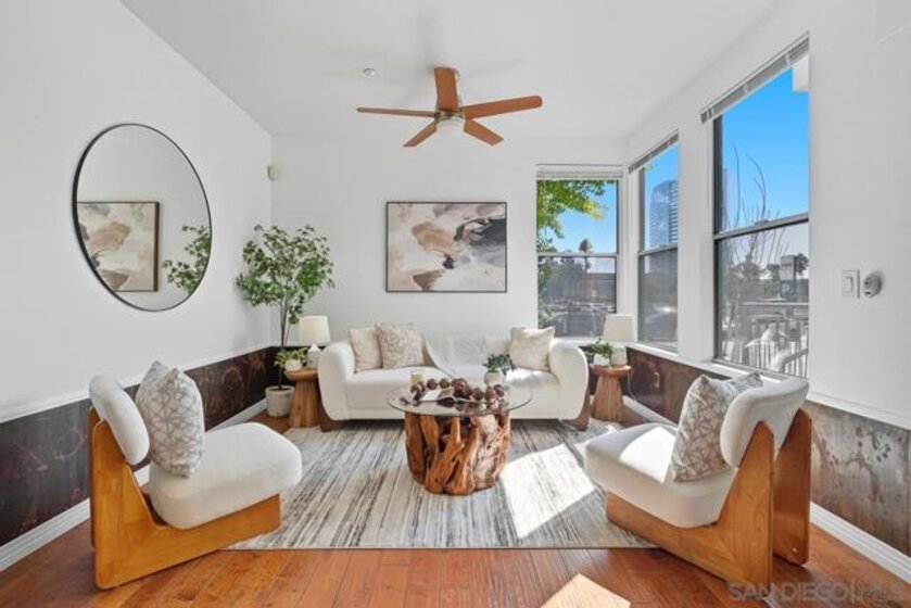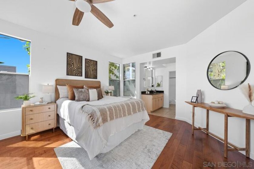 This rarely available 2-story corner townhome offers 1,360 sf of contemporary living in one of Marina district’s most desirable locations. With its private street-level entry, soaring ceilings, and oversized windows, this home is the largest of its kind at Atria on Market and perfectly blends privacy, style, and convenience. Inside, you'll find living areas bathed in natural light, solid hardwood flooring, complete with 2 primary suites. The open-concept kitchen features custom cabinetry and flows seamlessly into the dining and living spaces – ideal for entertaining or simply enjoying the vibrance of urban life. Unwind on your own front patio, where you can relax and enjoy San Diego’s golden sunsets with a glass of wine or a good book. This unit also comes with 2 assigned, underground parking spots. Designed by acclaimed architect Rob Quigley, Atria on Market is a modern garden-style building that brings nature into the heart of the city. Residents enjoy resort-style amenities including a 24-hour fitness center, business center, conference room, and rooftop BBQ lounge with skyline views. On-site security adds peace of mind, and the location is unbeatable. Steps from Ralphs, and a short walk to Seaport Village, the waterfront, Gaslamp, Petco Park, and all of downtown’s premier dining, shopping, and entertainment. Whether you’re looking for a vibrant lifestyle or a smart investment, this Marina District home has it all.