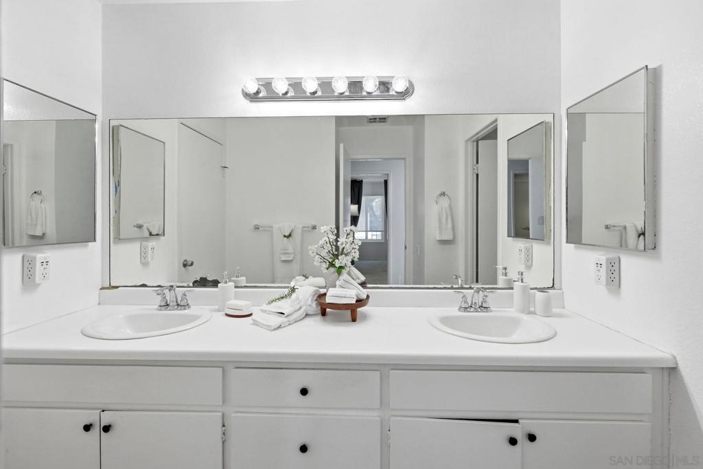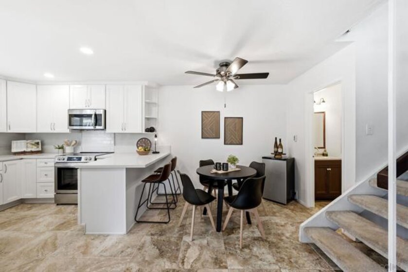 Remodeled and expanded kitchen in November 2025; cupboards, appliances, fixtures, paint, quartz counters, new shaker-style cabinets, backsplash, lighting flooring. Removed some upper cabinets to open up the space and expanded the breakfast bar into the dining nook. Bright, open and spacious! Powder Room remodeled in November 2024. Primary bath renovated in 2024. Dual vanity, shower-in-tub. Oversized bedrooms. All bedrooms are upstairs. Vinyl slider and windows. Private fenced patio - perfect for relaxation and entertaining! Laundry room off the patio, two dedicated parking spots. Two pools and spas, water is included in HOA fee. VA and FHA spot approval available, too! Superb accessibility for all that the I-15 corridor offers: Miramar Lake, multiple restaurants and movie theater, shopping, Miramar College, Hourglass Community Park, Aquatic Center, Home Depot , Arc & Kin Coffee Shop. Easy freeway access and close to get onto MCAS Miramar to beaches to downtown for sports and concerts. Welcome to Mira Mesa!