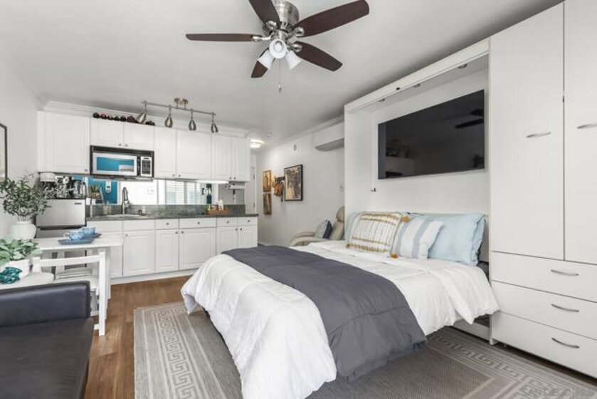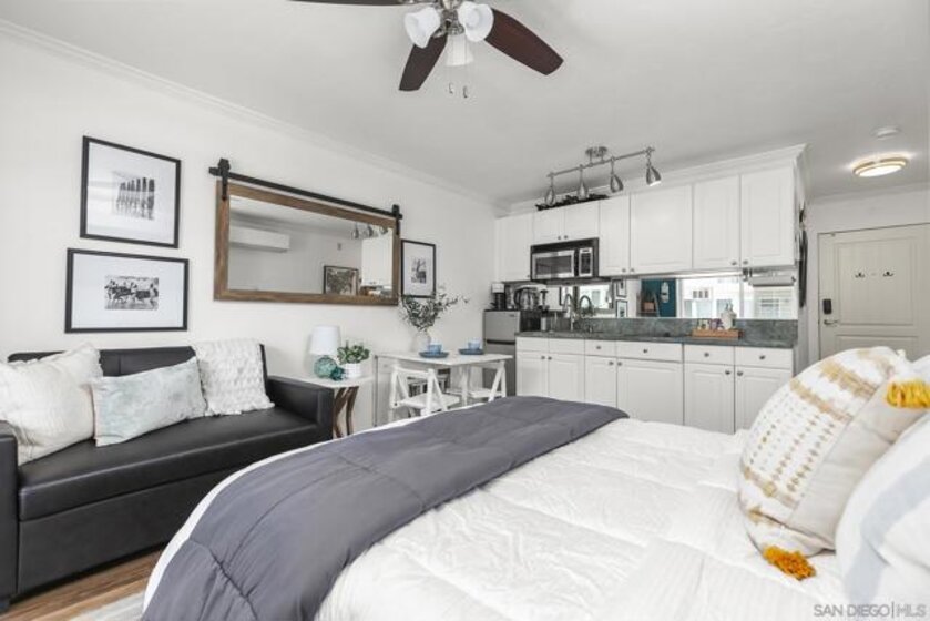 The current owners are open to seller financing with a reasonable down payment! Welcome to 1021 Scott Street, Unit 225 — where compact luxury meets Point Loma’s most scenic setting. This thoughtfully designed, recently remodeled, 288 sq ft studio offers style, efficiency, and stunning views, perfect for full-time living, a weekend getaway, or an investment opportunity. Perched above the marina, the home features a sliding glass door leading to a private balcony with sweeping views of the Point Loma hills, the marina, and the community pool. A space-saving Murphy bed adds flexibility and extra storage, while the kitchen shines with new greenish-blue granite countertops and ample cabinetry. The spacious, well-appointed bathroom includes a new walk-in shower. Updated AC unit! Just steps from the scenic Bessemer Path and La Playa Bayfront Beach, the community offers premium amenities such a pool, fitness center, billiards room, and residents’ lounge. Whether you’re sipping your morning coffee on the balcony or strolling the bay, this upgraded studio delivers big on lifestyle in a premier location.