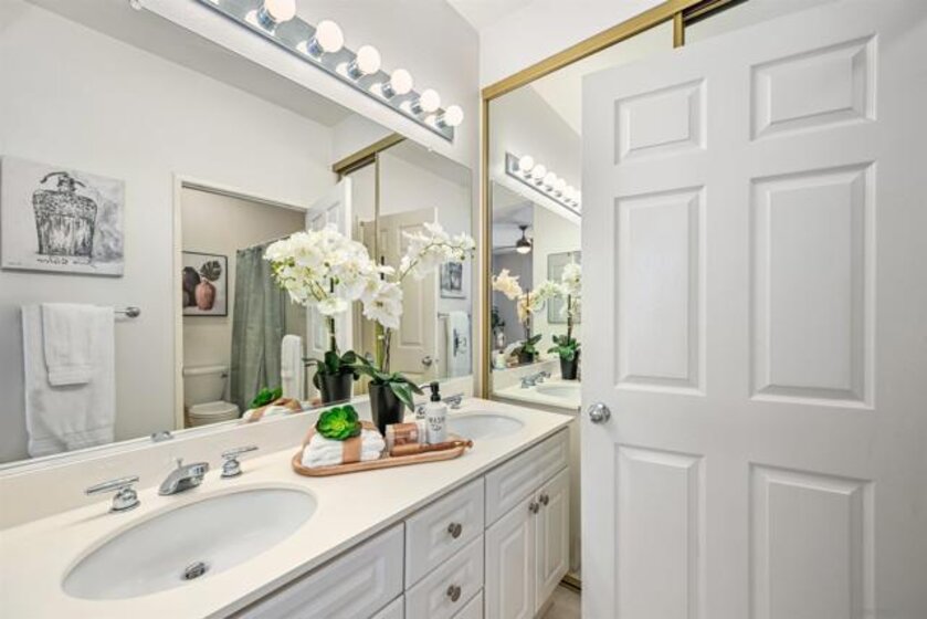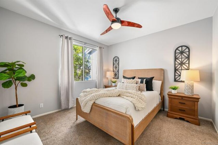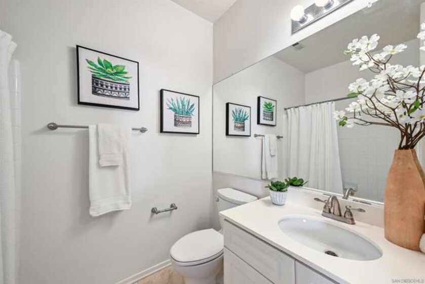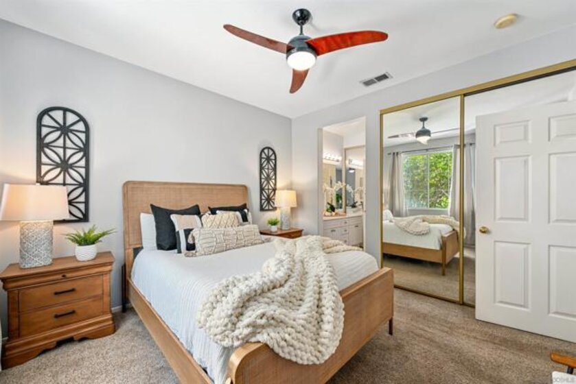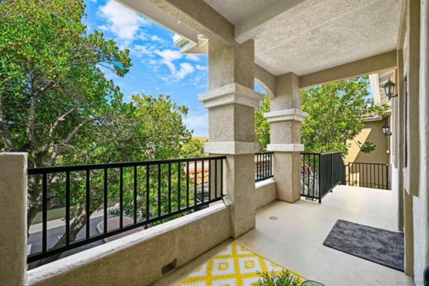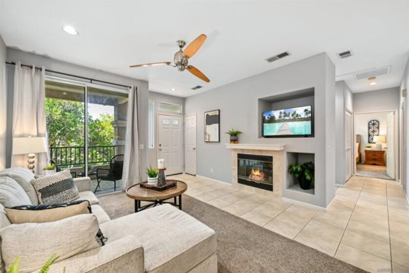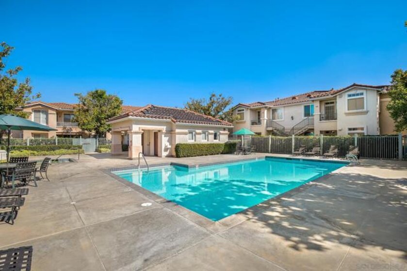 Don’t miss this stylish upstairs home in the beautifully maintained Palo Alto community of Sabre Springs. This light and inviting residence offers a large front patio with scenic views, a cozy fireplace, full-size in-unit laundry, and updated ceiling fans for modern comfort. Daily living and entertaining will be effortless with the open floor plan allowing the living room, dining area and kitchen to flow seamlessly together. Keep the conversations going during meal prep in the modernized kitchen featuring a decorative tile backsplash, stainless steel appliances and plenty of counter space for all our culinary creations. Relax and unwind in your lovely primary bedroom with dual closets to keep your organized and an en suite bathroom offering a double vanity and a shower/tub combo. The second bedroom is conveniently across the hall from the updated second bathroom - perfect for guests or roommates. One assigned parking space, plus plenty of guest parking spaces make parking a breeze. Community amenities include a sparkling pool, relaxing hot tub, and fitness center, creating the perfect blend of relaxation and convenience. Ideally located with easy access to downtown, Sorrento Valley, local beaches, and nearby hiking trails. Families will appreciate being part of the award-winning Poway Unified School District, including Morning Creek Elementary, Meadowbrook Middle School, and Mount Carmel High School. The home is also just minutes from the new Sabre Springs Transit Station, offering seamless connections to San Diego’s major employment centers in Downtown, UCSD and beyond!