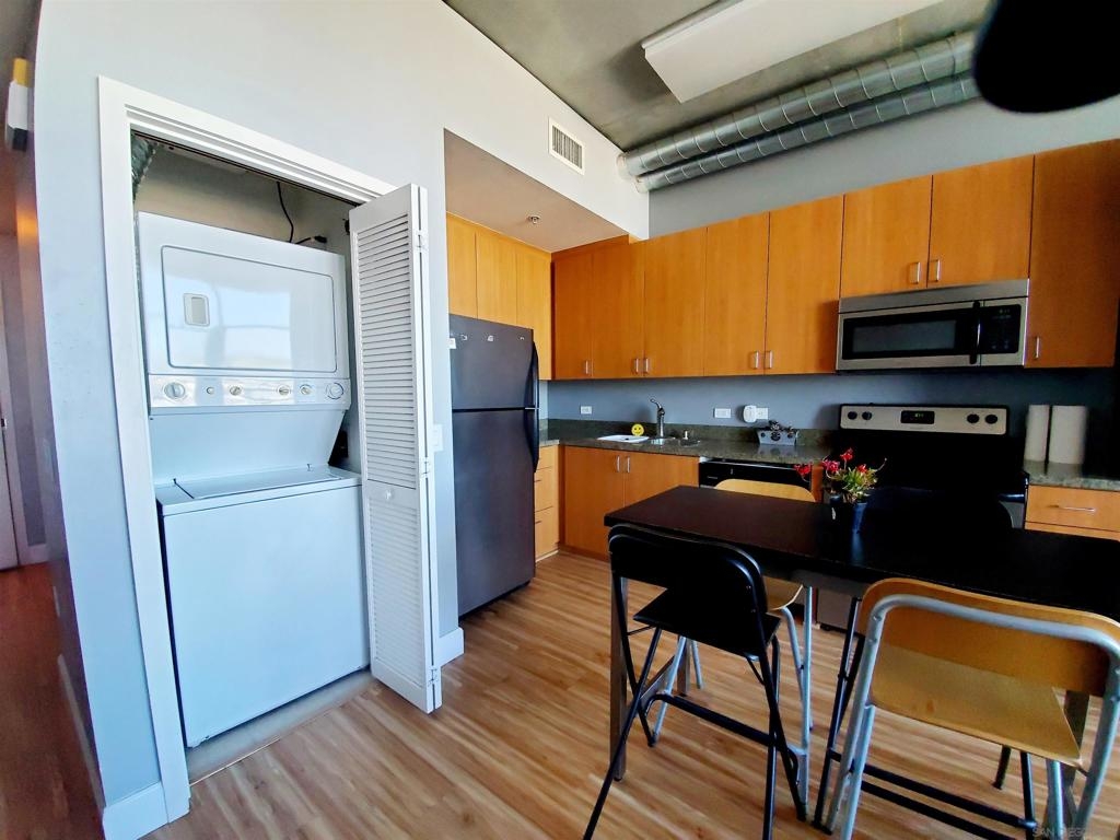 Beautiful studio located in East village at the Smart Corner building, enjoy this 16th floor unit with exposed concrete elements and a private balcony. Vinyl plank floors, granite counter tops, European cabinetry, Frigidaire appliance package, and in-unit washer/dryer. The unit's spacious bathroom has porcelain tiled flooring and also granite counter tops. Enjoy the amazing views on the rooftop terrace, other amenities: spa, BBQ patio, and gym. Close to all, Petco Park, Gaslamp Quarter, airport, all major freeways and public transportation.