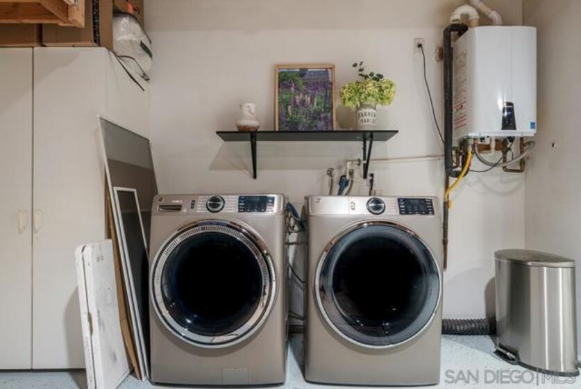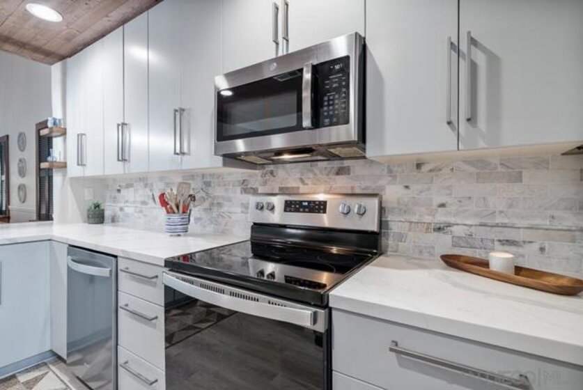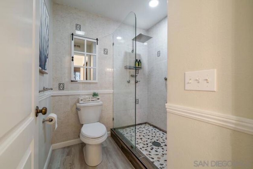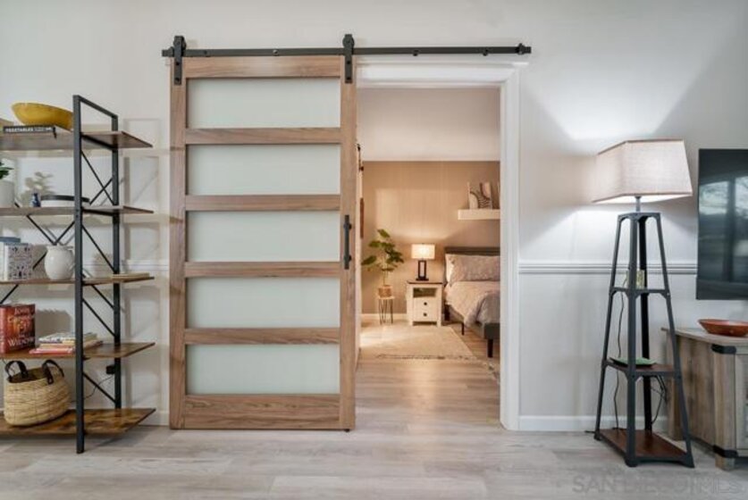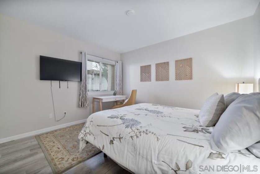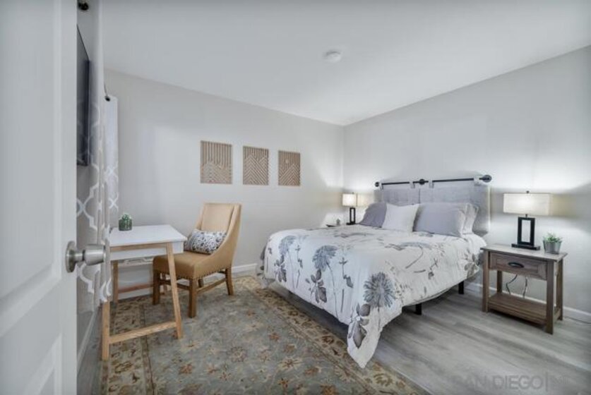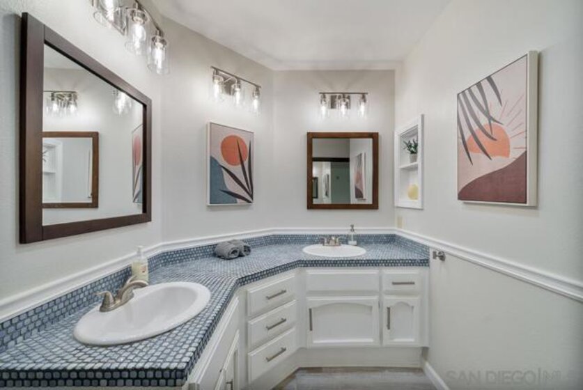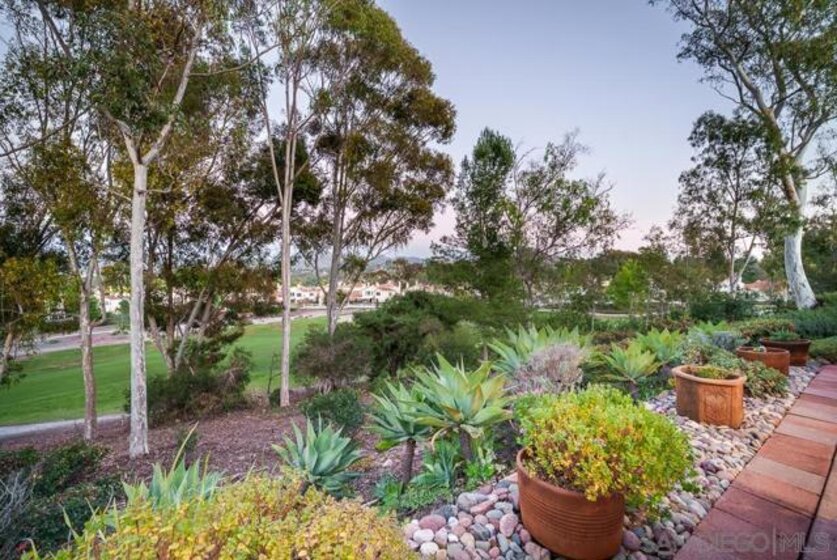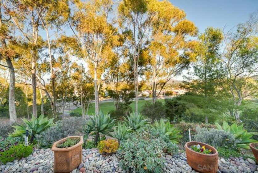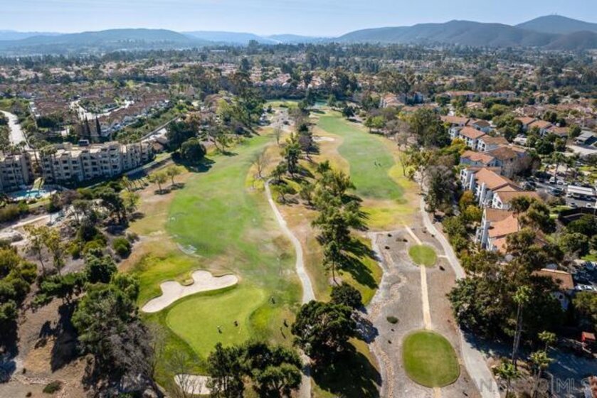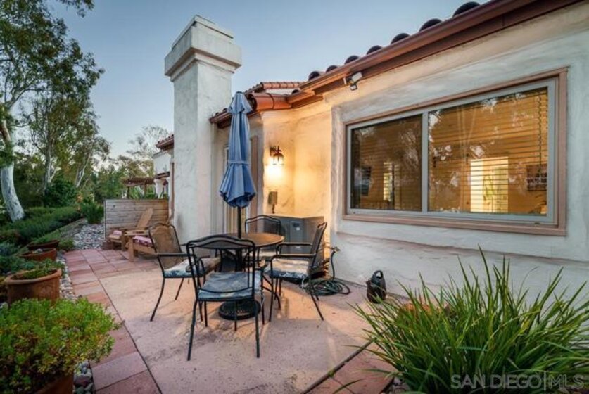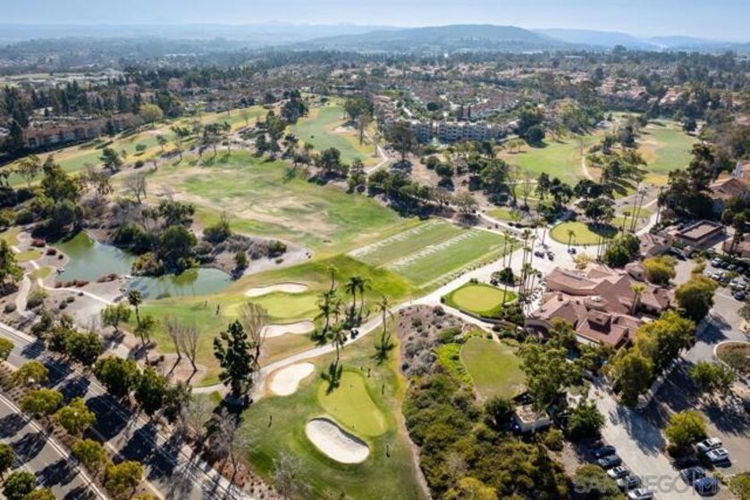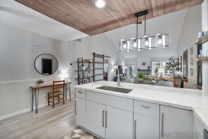 COMPLETELY RENOVATED DESIGNER SINGLE STORY 2 BED, 2 BATH TOWNHOME WITH STUNNING VIEWS IN BERNARDO HEIGHTS. Every inch of this stunner has been thoughtfully renovated. Located in the heart of Bernardo Heights, this residence overlooks the 6th hole of the Bernardo Heights Golf Course with Eastern exposure capturing sunrise views toward Mt. Woodson in Poway. The kitchen features Calacatta Laza quartz countertops, Calacatta Blue marble backsplash, and fluted warm oak bar panel detail...CONT... .... new sink, garbage disposal, microwave, and updated lighting. Duralux waterproof LVP flooring runs throughout the home and the HVAC system has been recently replaced. The dining area showcases a 14-foot ceiling with custom wood plank detail and exposed beam. The living room includes a gas fireplace with encaustic patterned porcelain tile surround and floating wood mantle. Barn door entry leads to the primary suite with accent wall and updated vanity area. The primary bath offers a step-in shower with glass enclosure, updated fixtures, mirrors, and sinks. Secondary bath includes a new vanity and sink. Two-car attached garage with epoxy flooring and built-in storage cabinetry. Patio offers golf course frontage with open views toward Mt. Woodson. Conveniently located near shopping, dining, and Bernardo Heights amenities.