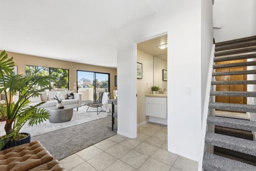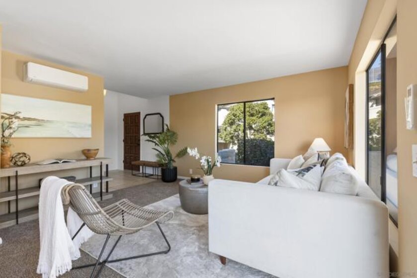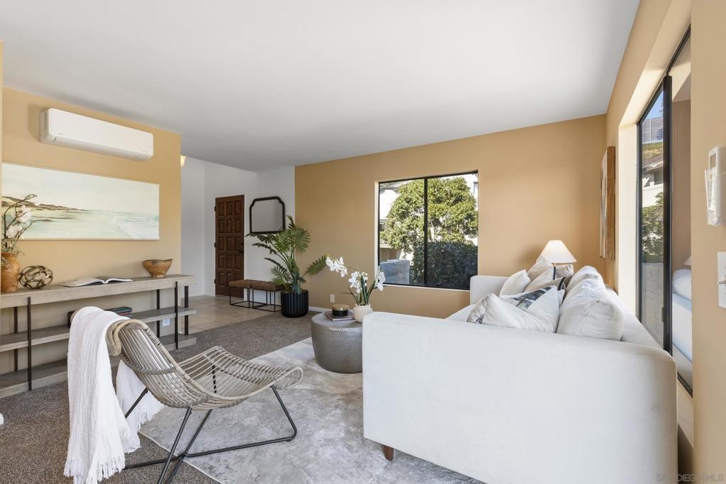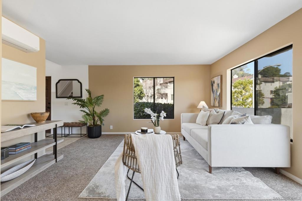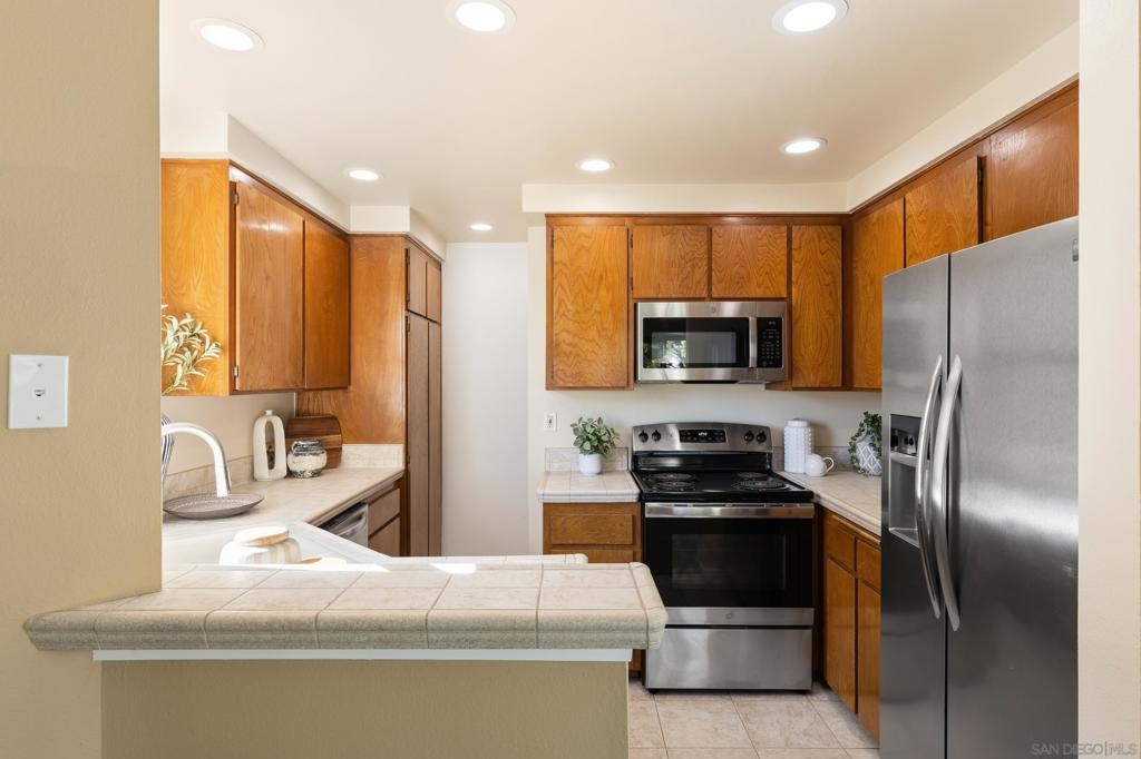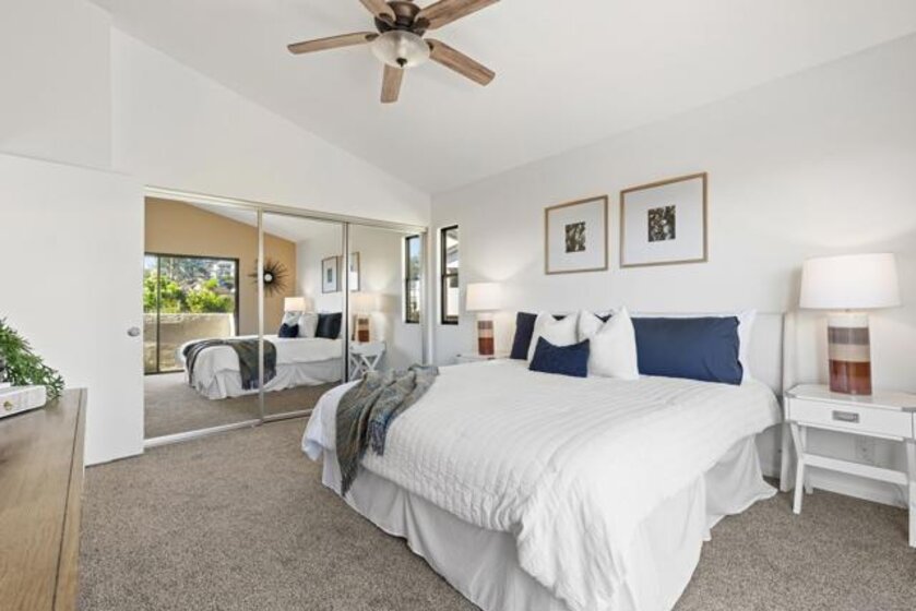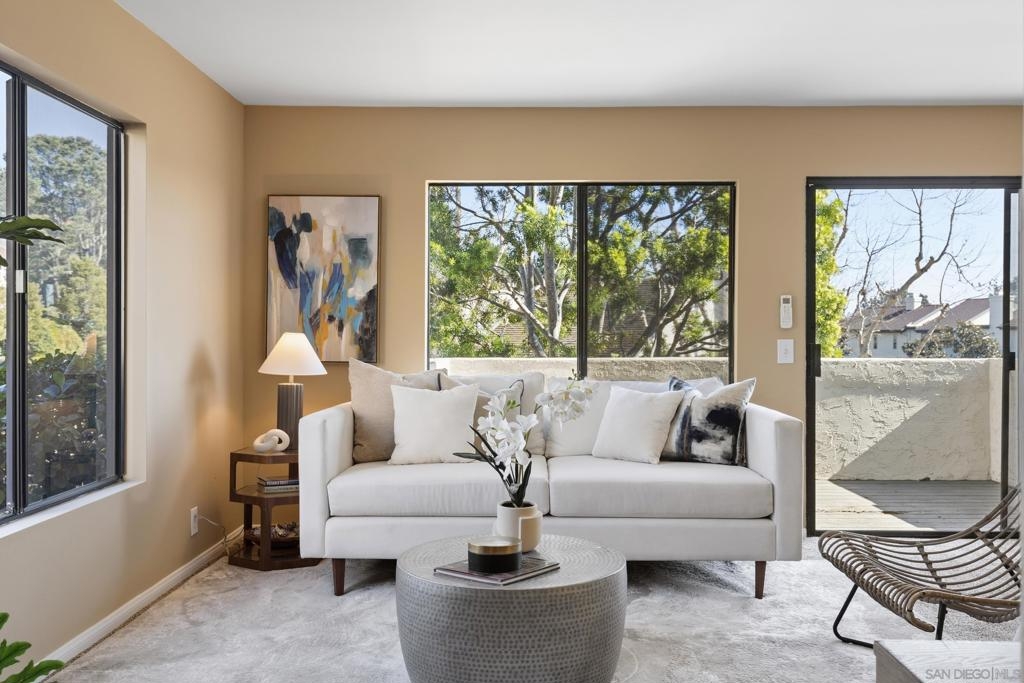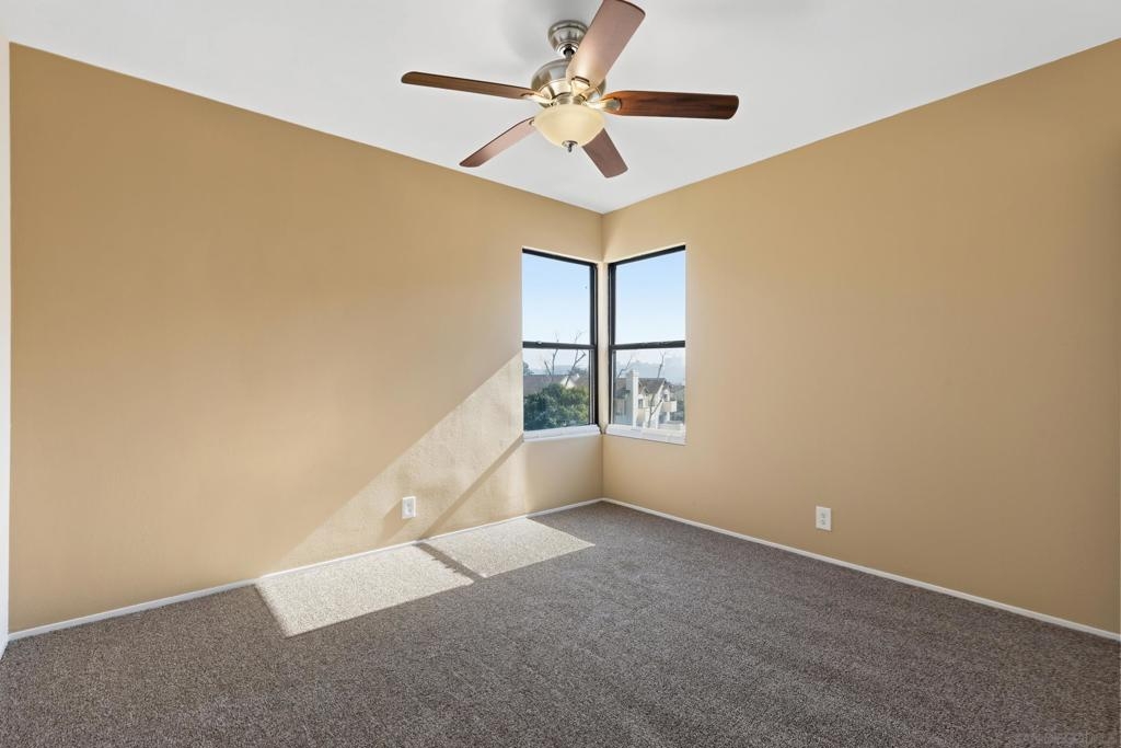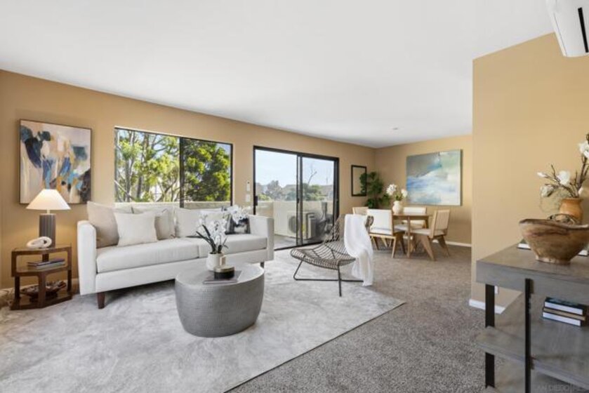 Beautiful end-unit condominium in the highly sought-after North Rim community, perched above Fashion Valley. This light and bright corner residence offers 1,098 square feet of comfortable living space with two bedrooms and one-and-a-half baths. Recent upgrades include all-new air conditioning and heating, brand-new carpet and paint, updated light fixtures, and new closet doors. A private deck with southeast exposure fills the home with natural light. Enjoy the convenience of an attached two-car garage featuring a workbench, plus a large storage and laundry area. The well-maintained community offers resort-style amenities including a pool and spa, a clubhouse in close proximity to the unit, tennis and pickle ball courts, and ample guest parking. Scenic area views and a peaceful setting complete the experience. Ideally located just one mile from the University of San Diego, with easy access to shopping, dining, freeways, airport and everything Fashion Valley has to offer. This is a must-see home in a prime location.
