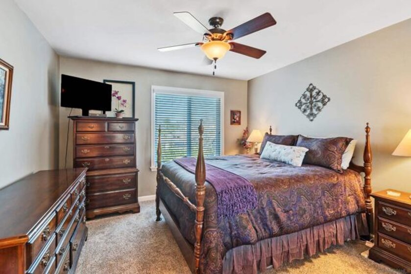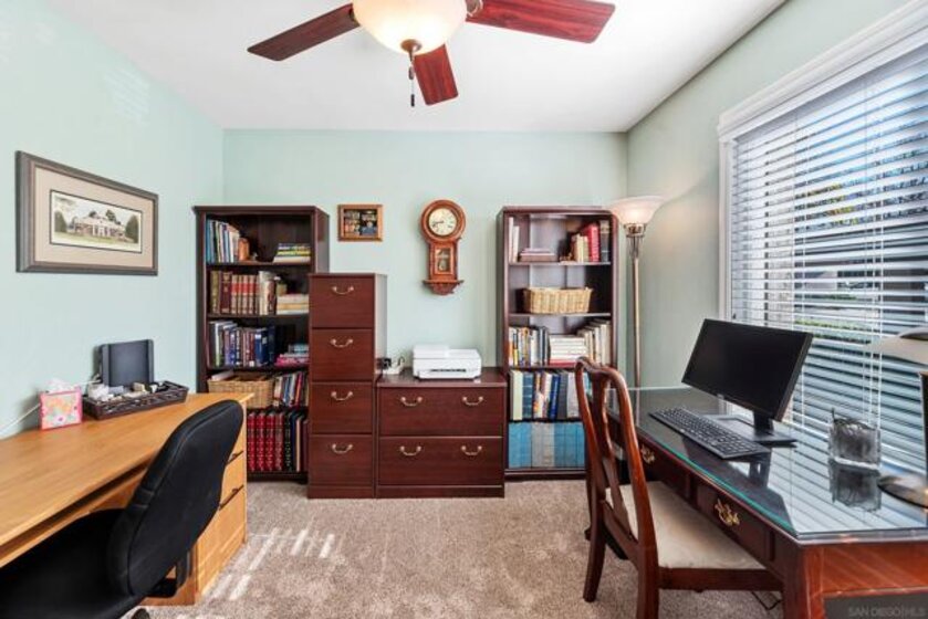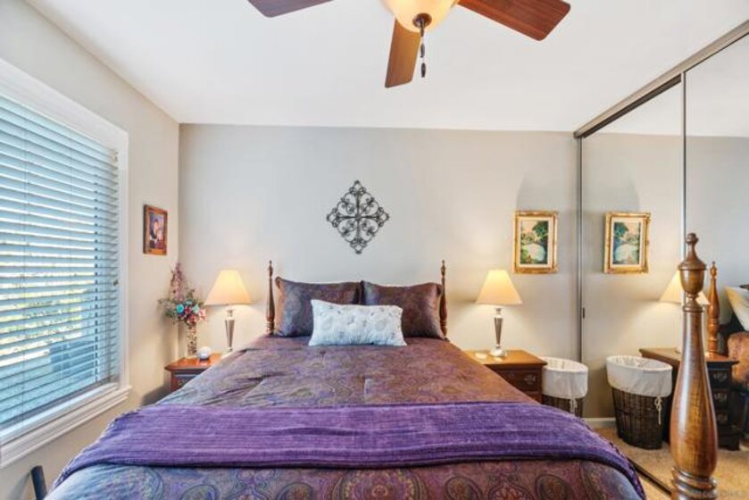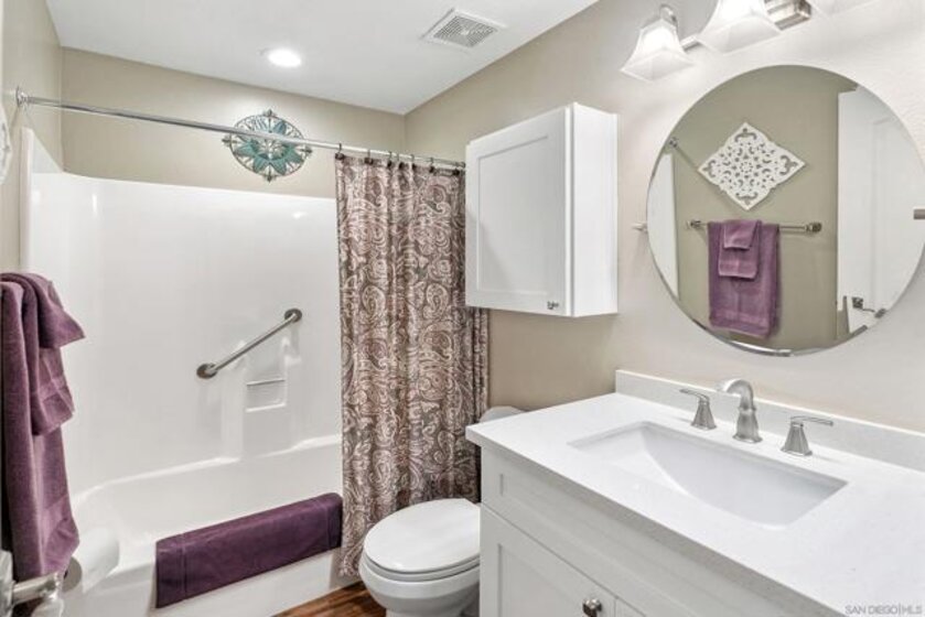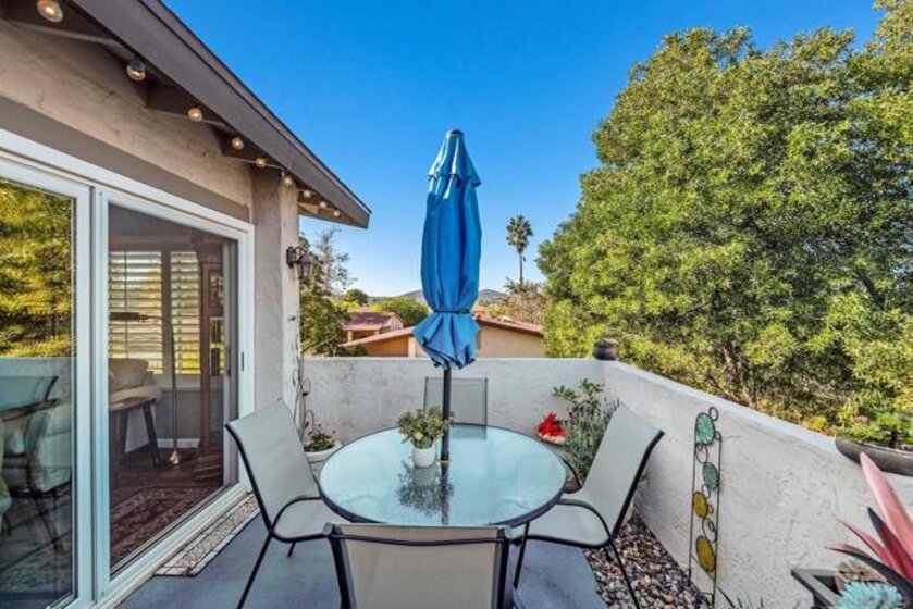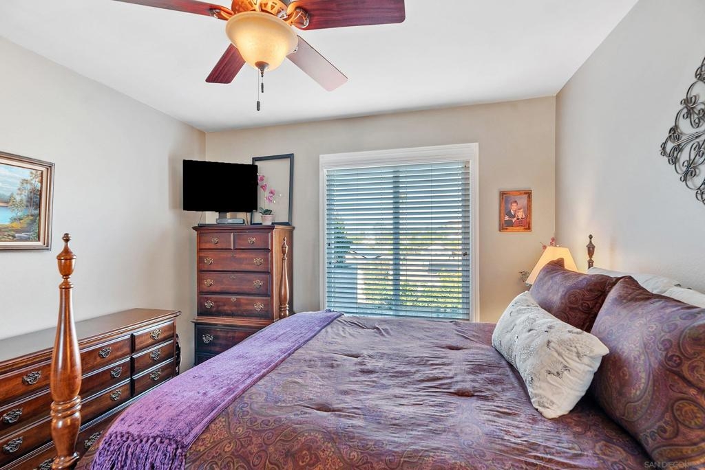 Beautiful turn-key, single story, 2 br, 2 ba end unit in "Alameda" complex. Private patio off living room with sunset views! Renovated throughout with wood-like porcelain flooring in all areas except for carpets in brs. Recessed lighting in kit, entry, hallway, & bathrms. Newer water heater, heat pump, & venting. Ceiling fans in LR & both brs. Upgraded kit cabinets & granite counters. Stainless steel appliances, double oven, refrigerator, dishwasher. Stackable washer/dryer in kit closet. Quartz bathrm countertops, custom mirrored wardrobe doors in brs. Custom drapery & rod in LR. Most hardware upgraded, including front door. Assigned one covered parking space with storage. Located in desirable Poway School system. Move-in ready and much more to see and appreciate!