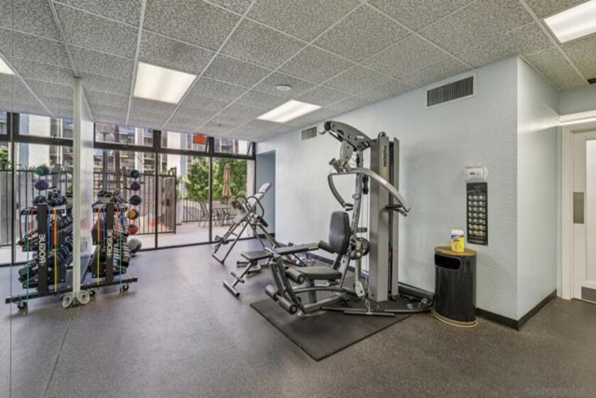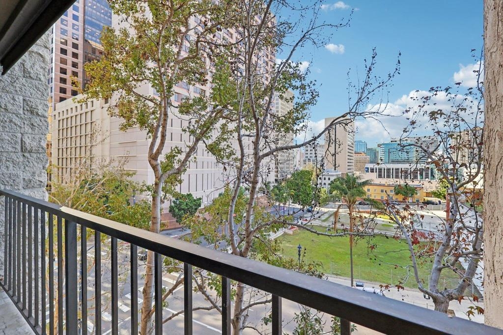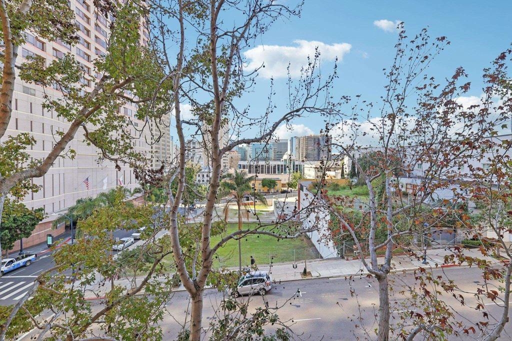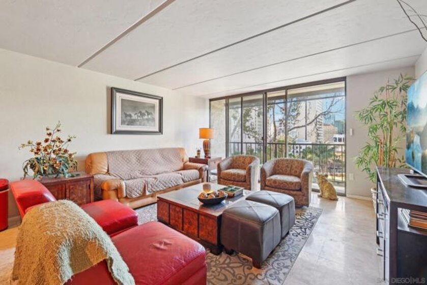 Discover spacious, light-filled living in this beautifully situated one-bedroom condo at Symphony Towers, a VA-approved community in the heart of Cortez Hill. Perfectly positioned, Cortez Hill offers peaceful residential living while providing effortless access to Downtown San Diego’s most vibrant neighborhoods. This super spacious 4th-floor residence features an open, airy floor plan with a large living room and dining area, framed by a wall of floor-to-ceiling windows with sliding doors that open to a covered private balcony. Enjoy fresh coastal breezes along with green treetop and city views—an ideal setting for relaxing or entertaining. The oversized bedroom comfortably accommodates a king-size bed, while the large bathroom includes a walk-in shower. Additional highlights include in-unit laundry and secure parking. Symphony Towers offers a pool, spa, fitness center, and inviting outdoor sitting areas, with modern updates currently underway throughout the common spaces. Just minutes from Balboa Park, strolls along the scenic harbor, East Village, Gaslamp Quarter, Little Italy, Petco Park, world-class dining, nightlife, and more—this home delivers the perfect blend of tranquility and urban convenience.