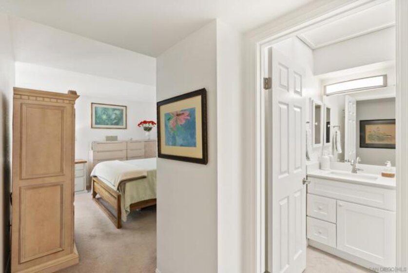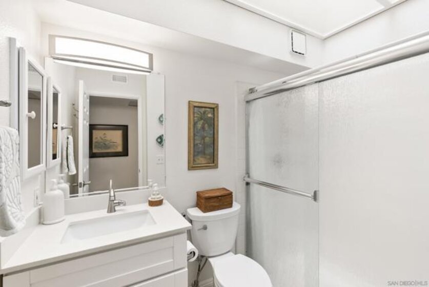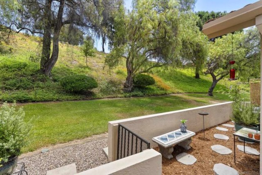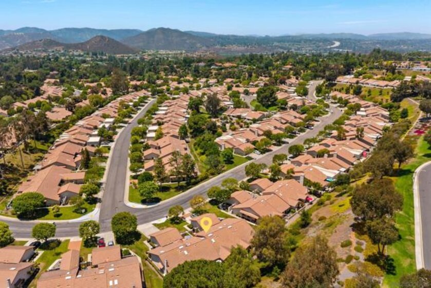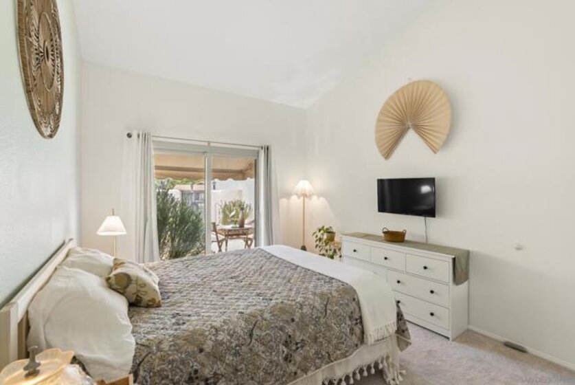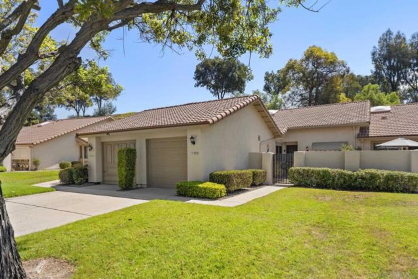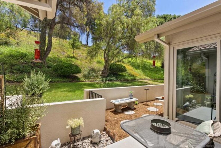 Surrounded by the serene setting of Oaks North Villas, this single-story residence offers an ideal blend of simplicity and sophistication. With recent upgrades throughout and private outdoor retreats, it’s designed for effortless living in a vibrant 55+ community. A freshly landscaped front patio sets a welcoming tone before stepping through the front door. Inside, soaring vaulted ceilings and all-new (2023) Anlin dual-pane windows and sliding doors fill the home with light, while updated fixtures and finishes (See supp) add a touch of modern elegance. The 2-bedroom, 2-bath floorplan offers both convenience and privacy, complemented by a private 1-car garage. The kitchen shines with espresso cabinetry, granite countertops, a new refrigerator and dishwasher, and a breakfast bar that opens seamlessly into the dining and living areas—perfect for entertaining. Both bathrooms have been stylishly refreshed with quartz counters, new vanities, and modern Kohler fixtures. Additional upgrades include a new HVAC system with updated ducting (2023), a new water heater (2024), new washer (2024), freshly painted doors/baseboards, new hardware, and updated secondary bedroom with fresh paint, carpet, and closet doors (2024). Distressed wood-style flooring adds warmth, while plush carpeting provides comfort underfoot. Two private patios extend your living space—one at the entry and a second off the living room and primary suite, upgraded with new porcelain tile and backing to a peaceful greenbelt. The perfect spot to enjoy your morning coffee or San Diego’s year-round sunshine. Life in Oaks North means more than just a beautiful home. Residents enjoy access to the Oaks North Community Center, with resort-style amenities including a heated pool and spa, tennis and pickleball courts, fitness center, lawn bowling, ceramics studio, woodshop, and a full calendar of clubs and activities. Move-in ready and priced to sell, this turnkey townhome is your opportunity to enjoy the best of San Diego’s 55+ lifestyle in a tranquil and welcoming setting.