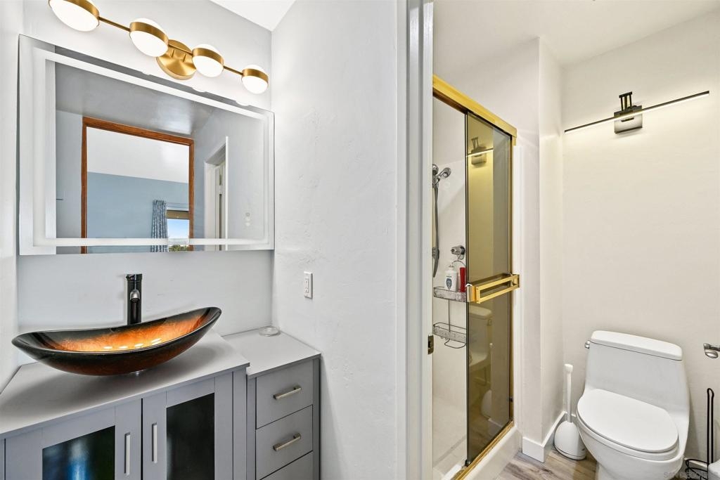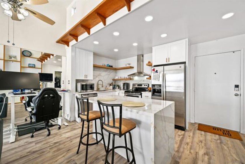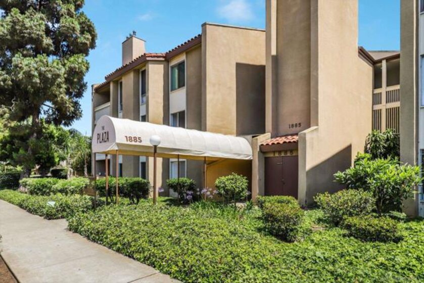 Perched in one of the most desirable view locations in The Plaza, this top-floor residence in Court 5 was originally selected by the developer for its remarkable vistas. Enjoy sweeping southern panoramic views from every window, showcasing the downtown skyline, Mission Bay, SeaWorld fireworks, Mission Beach, the Pacific Ocean, and even Mexico. Bright and spacious, the home features vaulted ceilings, expansive windows, a gas fireplace, wet bar, oversized kitchen bar seating, and a private balcony for soaking in the scenery. The living room features striking custom built-in shelving that maximizes wall space while adding architectural interest—perfect for displaying art, books, and décor, and blending functional storage with a stylish, gallery-like design. The layout offers two bedrooms, each with its own en suite bathroom, plus elevator access and gated assigned parking for convenience. Residents enjoy secure grounds with landscaped paths, four pools, four spas, five lighted tennis courts, a fully equipped gym with saunas, movie and meeting room, billiards and table tennis lounge, social gathering spaces, library area, private lagoon, outdoor dining venue, and multiple laundry facilities. Ideally situated near Pacific Plaza Shopping Center with grocery, dining, and coffee options, as well as close to Pacific Beach attractions, entertainment, and the shoreline.