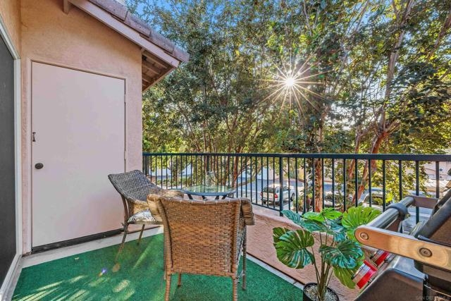 Approximately 716 square feet, this one-bedroom, one-bathroom top floor condominium features a spacious and charming layout with abundant natural light and inviting architectural details. The home boasts dark bamboo flooring throughout the living areas and primary suite, complemented by custom mosaic ceramic tile in the kitchen and tile in the bathroom. The bright and cheerful interior is enhanced by ample cabinetry, stainless steel appliances and a cozy fireplace, creating a warm and welcoming atmosphere. The primary suite offers a large walk-in closet with built-ins, providing excellent storage space. The bathroom is similarly spacious, with upgraded lighting and fixtures. In unit laundry for convenience. The home's exterior showcases lush landscaping, a spacious balcony with scenic views of the greenbelt and mature trees, offering a private and serene retreat. The community amenities are resort-style, featuring pools, spas, a fitness center, tennis courts, pickleball, a recreational room and a clubhouse near a picturesque pond. The gated community also provides assigned parking in front of the building, as well as plenty of guest parking, ensuring convenience for residents. Ideally located with easy freeway access and close to shopping, this condominium offers a comfortable and well-appointed living experience. Acclaimed Poway Unified Schools.