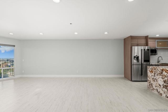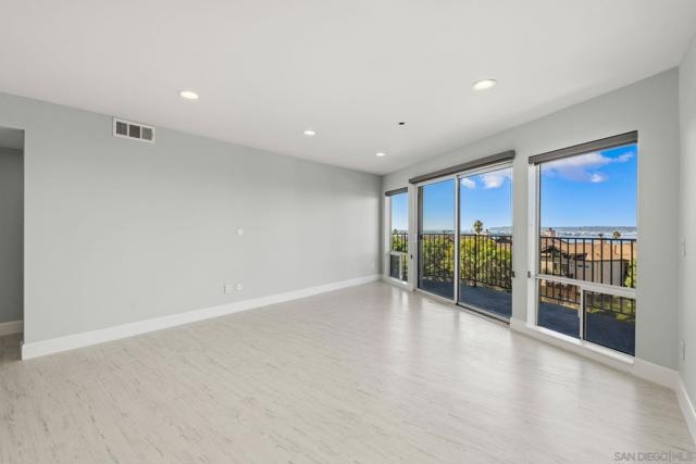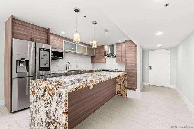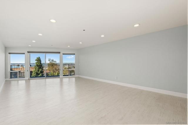 Experience elevated urban living in this beautifully reimagined 2BR/2BA Condo offering sweeping 180° Bay views from the glittering Downtown skyline to Point Loma. The spacious open layout showcases a chef’s kitchen anchored by a dramatic 10-foot granite cascading island, custom cabinetry, and premium SS appliances. The living and dining areas open to a large west-facing balcony where sunset bay views and airplane landings steal the show. The serene primary suite features peaceful bay views, a spa-inspired bathroom with a soaking tub, walk-in shower, marble & mosaic tile accents, plus a custom-designed walk-in closet. The generously sized second bedroom offers comfort and privacy for guests or office use with an adjacent stylish guest bath, finished with marble and designer tile. Throughout the home, enjoy luxury vinyl flooring, custom lighting, abundant in-unit storage, and the convenience of a full laundry room. All this in a perfectly positioned, well-maintained building, features solar panels for an almost zeroed out SDGE bill, steps from top restaurants, boutiques, cafés, and more.