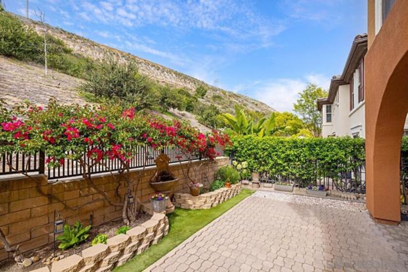 Experience the ultimate in luxury and convenience encompassing this extensively renovated, turnkey residence in the beautifully maintained, gated Bungalows at Escala community. This rarely available 3 bedroom, 2.5 bathroom open floorplan lives like a single-family home, offering privacy and serenity in a centrally located San Diego neighborhood just minutes from all San Diego has to offer. Enjoy gardening or relaxing in your private fully gated backyard with no homes behind you, surrounded by mature landscaping and peaceful panoramic hillside views. Interior highlights include a new kitchen with high end KitchenAid appliances, a built-in under counter microwave oven drawer, a large kitchen island, under cabinet lighting, lighted soft close cabinet drawers, and quartz countertops. A large walk-in pantry and a new full size stacked LG washer and dryer with built-in cabinets and a butcher block folding countertop create extra storage. Stunning wide plank, wire brushed French Oak flooring installed throughout the home with matching custom built wood stairs and handrails. Warm yourself by the oversized fireplace flanked with a wood mantle, wood shelving and rustic split limestone facing. The spacious primary bedroom features a new bathroom with a large walk-in tiled shower, three shower heads, built-in bench seat, a free standing soaking tub, and a concrete surface double sink vanity. Hand troweled walls and ceilings, and recessed lighting on dimmer switches throughout. 3rd bedroom currently showcased as a lighted walk in closet, easily returned to 3rd bedroom use if desired.