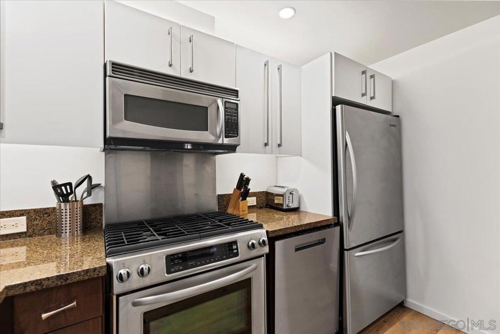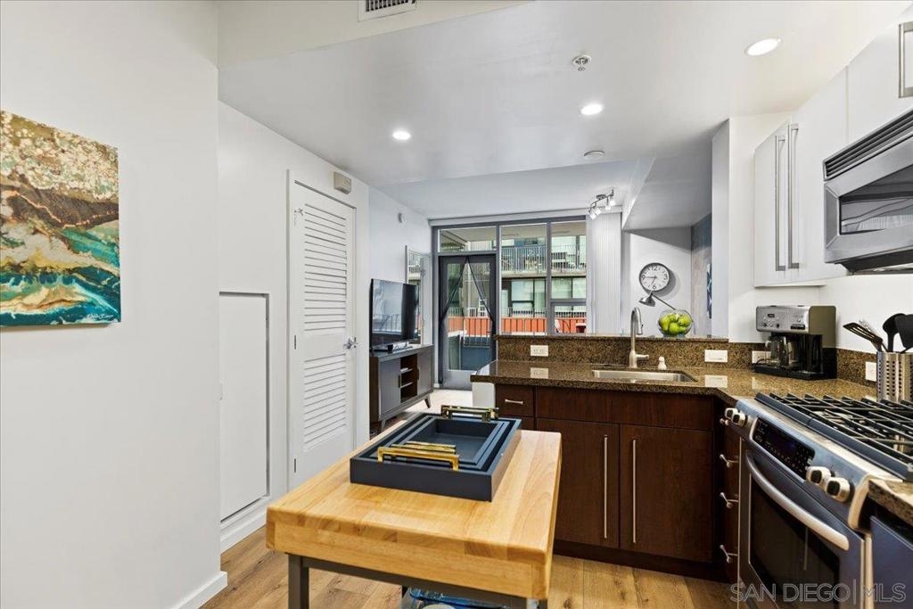 Welcome to ICON, where refined urban living meets iconic San Diego views. Perched on the 10th floor, this beautifully appointed residence is bathed in natural light while enjoying a desirable, quiet courtyard orientation with views stretching toward the Coronado Bridge and the Pacific beyond. Luxury vinyl plank flooring enhances the open-concept living space, seamlessly connecting to a generously sized private patio—perfect for morning coffee or evening city lights. The designer kitchen showcases modern fixtures, stylish finishes, and a timeless neutral palette, complementing the well-designed floor plan. Offered furnished, this residence presents an exceptional opportunity as a primary home, executive retreat, or weekend escape in the heart of downtown. Residents of ICON enjoy premier amenities including the rooftop Skybox Lounge with panoramic views, BBQ terrace, fitness center, clubhouse, movie room, and 24-hour front desk security—all just steps from Petco Park, vibrant dining, and the best of the Gaslamp Quarter.