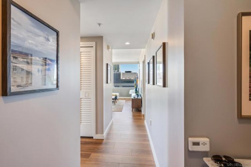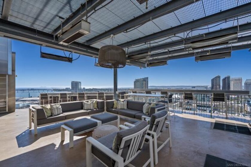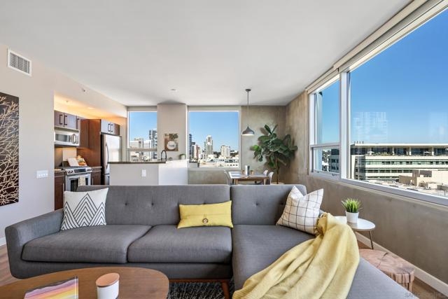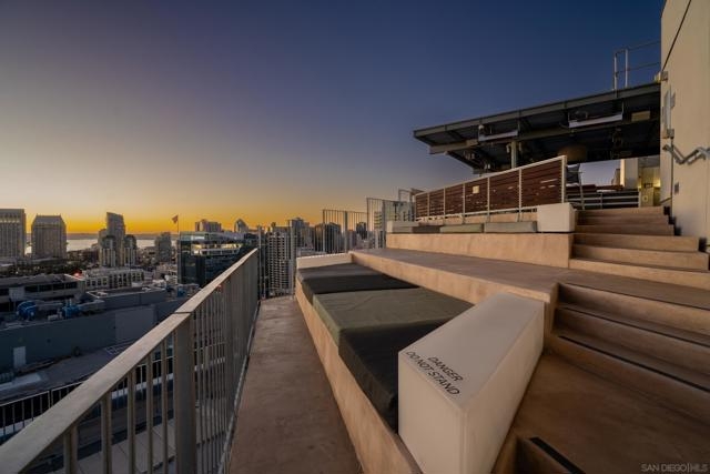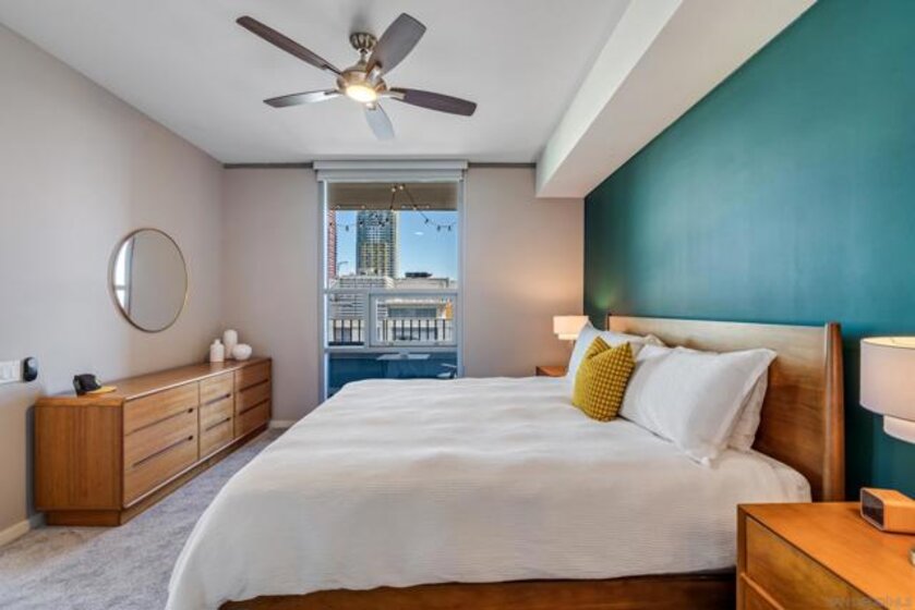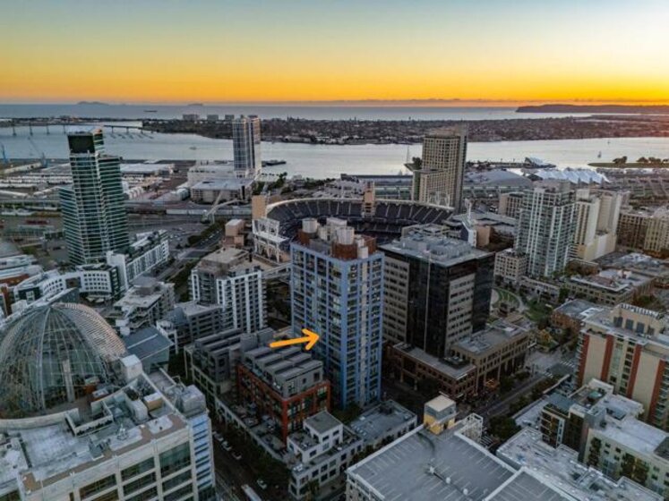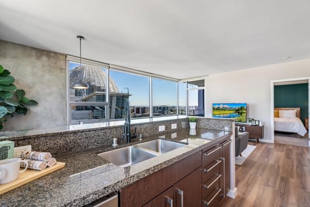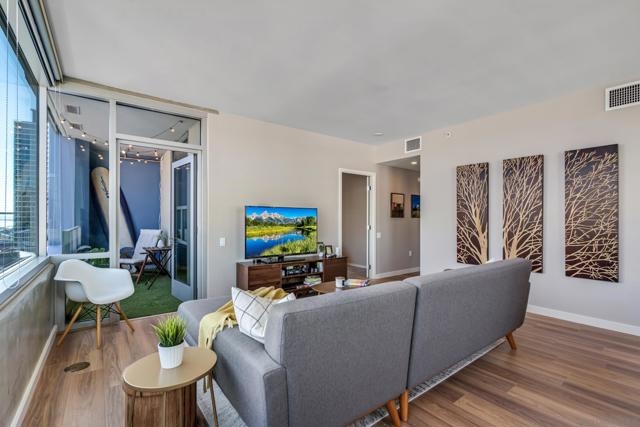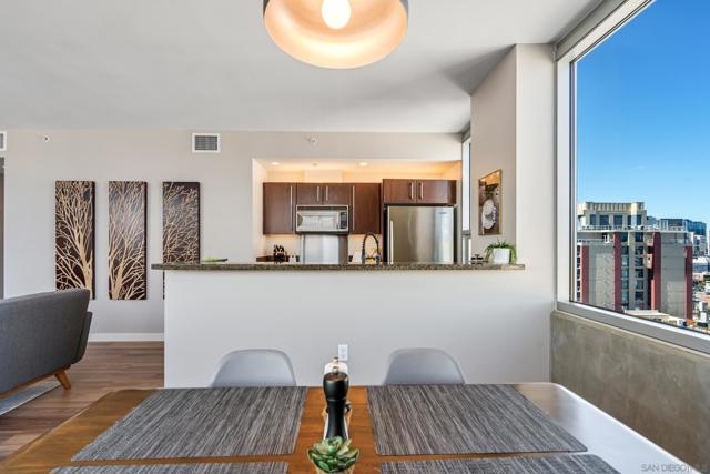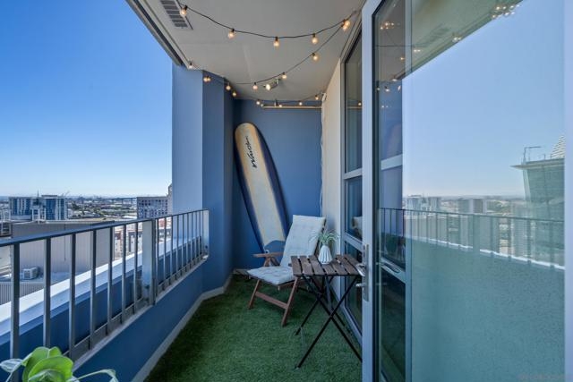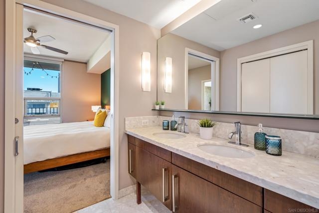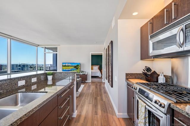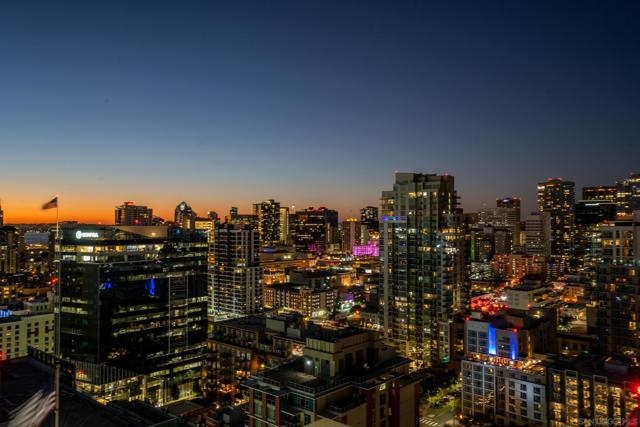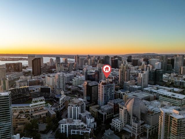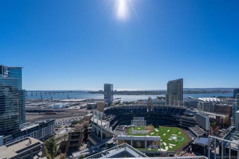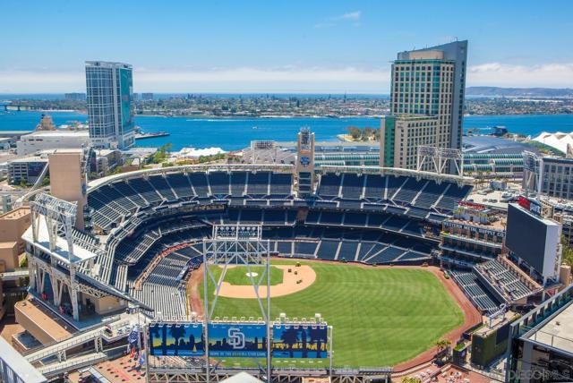 Experience elevated downtown living at ICON, where modern design meets timeless sophistication. This meticulously maintained and upgraded northeast corner residence showcases breathtaking panoramic views of the San Diego Bay, Coronado Bridge, and the sparkling city skyline. Step through the entryway into a light-filled, open-concept floor plan featuring new carpet, wood-look flooring, and fresh designer paint throughout. The gourmet kitchen impresses with stainless steel appliances, sleek granite countertops, and ample cabinetry—perfect for both casual dining and entertaining. The serene primary suite includes a fully built-out closet and a beautifully finished bath with dual vanities. Modern urban comforts include in-unit laundry, two parking spaces, and a private storage unit, providing both convenience and functionality to your downtown lifestyle. ICON is a VA-approved community offering resort-style amenities such as a 24-hour front desk attendant, state-of-the-art fitness center, and the iconic rooftop Skybox terrace with lounge seating, TVs, surround sound, BBQs, heaters, and panoramic city views. Additional amenities include the 5th Inning community recreation room with a full kitchen and business center, a private movie theater, community fireplace, bike and package storage with Amazon lockers, and an interior courtyard featuring sculptural art, a waterfall element, and modern landscaping. Residents also enjoy Google Fiber high-speed internet, on-site property management, and a sleek, contemporary lobby entrance. ICON is a VA-approved community offering resort-style amenities such as a 24-hour front desk attendant, state-of-the-art fitness center, and the iconic rooftop Skybox terrace with lounge seating, TVs, surround sound, BBQs, heaters, and panoramic city views. Additional amenities include the 5th Inning community recreation room with a full kitchen and business center, a private movie theater, community fireplace, bike and package storage with Amazon lockers, and an interior courtyard featuring sculptural art, a waterfall element, and modern landscaping. Residents also enjoy Google Fiber high-speed internet, on-site property management, and a sleek, contemporary lobby entrance. Explore the best of downtown living—just moments from Petco Park, Gallagher Square, the historic Gaslamp Quarter’s shops and dining, the Central Library, convenient trolley and bus lines, FIT Athletic Club, the Harbor Drive Pedestrian Bridge leading to The Rady Shell, the Convention Center, Seaport Village, Embarcadero Parks, the Coronado Ferry, and more. This home offers the perfect balance of sophistication and vibrant urban energy.