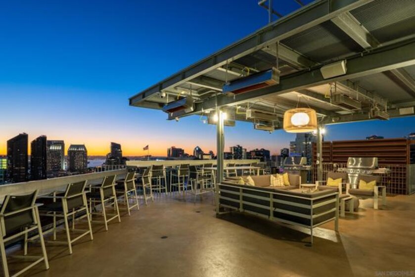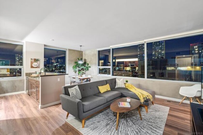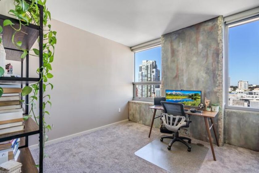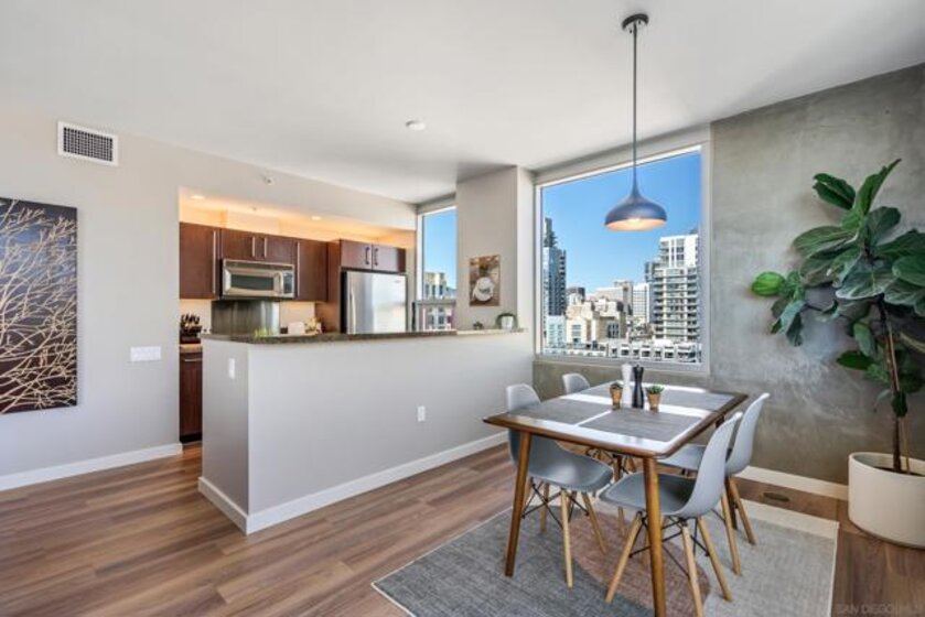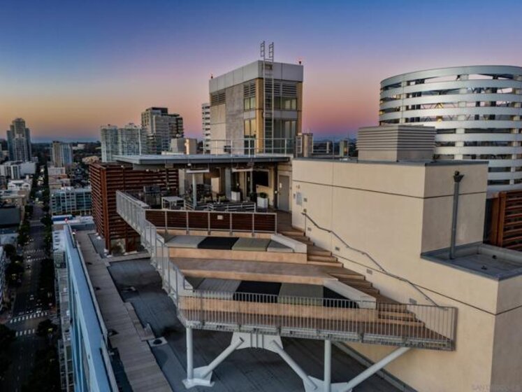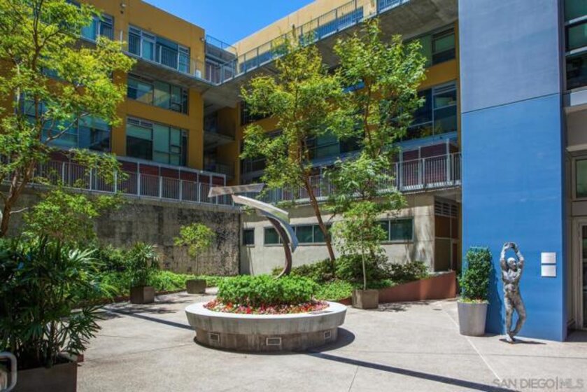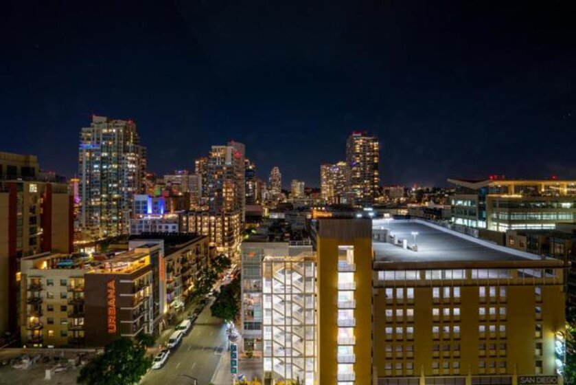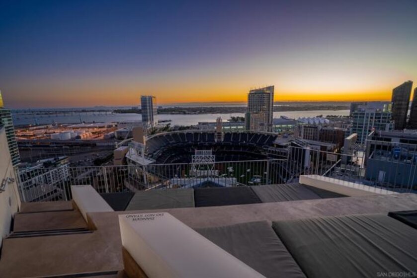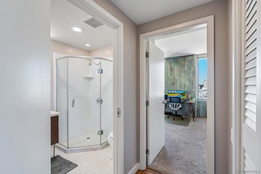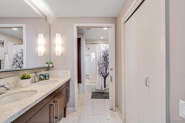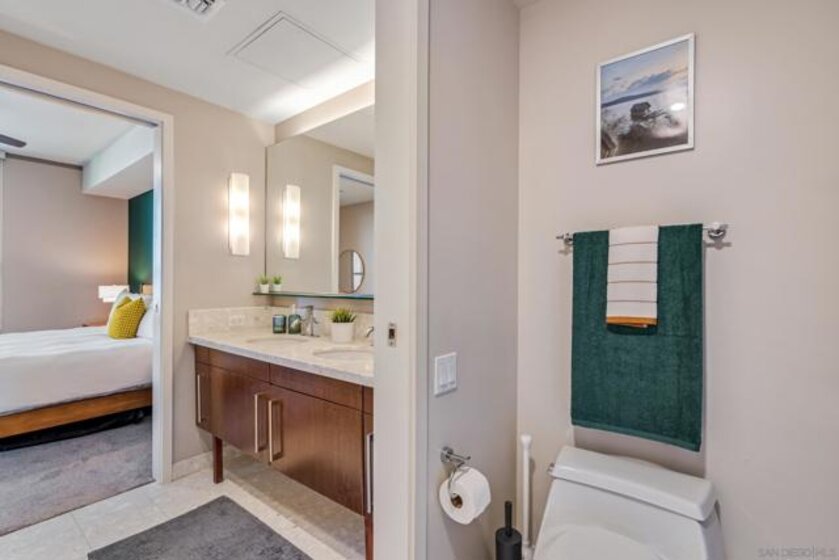 Experience elevated downtown living at ICON, where modern design meets timeless sophistication. This meticulously maintained and upgraded northeast corner residence showcases breathtaking panoramic views of the San Diego Bay, Coronado Bridge, and the sparkling city skyline. Step through the entryway into a light-filled, open-concept floor plan featuring new carpet, wood-look flooring, and fresh designer paint throughout. The gourmet kitchen impresses with stainless steel appliances, sleek granite countertops, and ample cabinetry—perfect for both casual dining and entertaining. The serene primary suite includes a fully built-out closet and a beautifully finished bath with dual vanities. Modern urban comforts include in-unit laundry, two parking spaces, and a private storage unit, providing both convenience and functionality to your downtown lifestyle. ICON is a VA-approved community offering resort-style amenities such as a 24-hour front desk attendant, state-of-the-art fitness center, and the iconic rooftop Skybox terrace with lounge seating, TVs, surround sound, BBQs, heaters, and panoramic city views. Additional amenities include the 5th Inning community recreation room with a full kitchen and business center, a private movie theater, community fireplace, bike and package storage with Amazon lockers, and an interior courtyard featuring sculptural art, a waterfall element, and modern landscaping. Residents also enjoy Google Fiber high-speed internet, on-site property management, and a sleek, contemporary lobby entrance. ICON is a VA-approved community offering resort-style amenities such as a 24-hour front desk attendant, state-of-the-art fitness center, and the iconic rooftop Skybox terrace with lounge seating, TVs, surround sound, BBQs, heaters, and panoramic city views. Additional amenities include the 5th Inning community recreation room with a full kitchen and business center, a private movie theater, community fireplace, bike and package storage with Amazon lockers, and an interior courtyard featuring sculptural art, a waterfall element, and modern landscaping. Residents also enjoy Google Fiber high-speed internet, on-site property management, and a sleek, contemporary lobby entrance. Explore the best of downtown living—just moments from Petco Park, Gallagher Square, the historic Gaslamp Quarter’s shops and dining, the Central Library, convenient trolley and bus lines, FIT Athletic Club, the Harbor Drive Pedestrian Bridge leading to The Rady Shell, the Convention Center, Seaport Village, Embarcadero Parks, the Coronado Ferry, and more. This home offers the perfect balance of sophistication and vibrant urban energy.