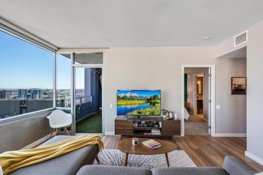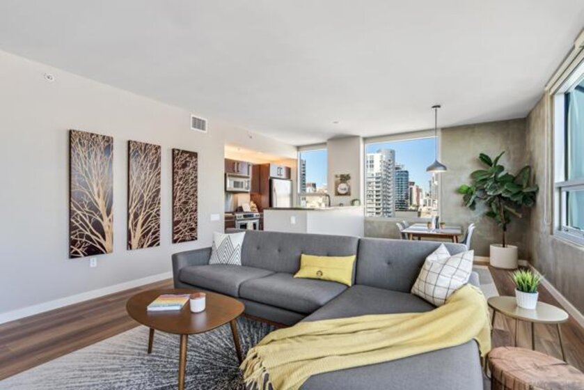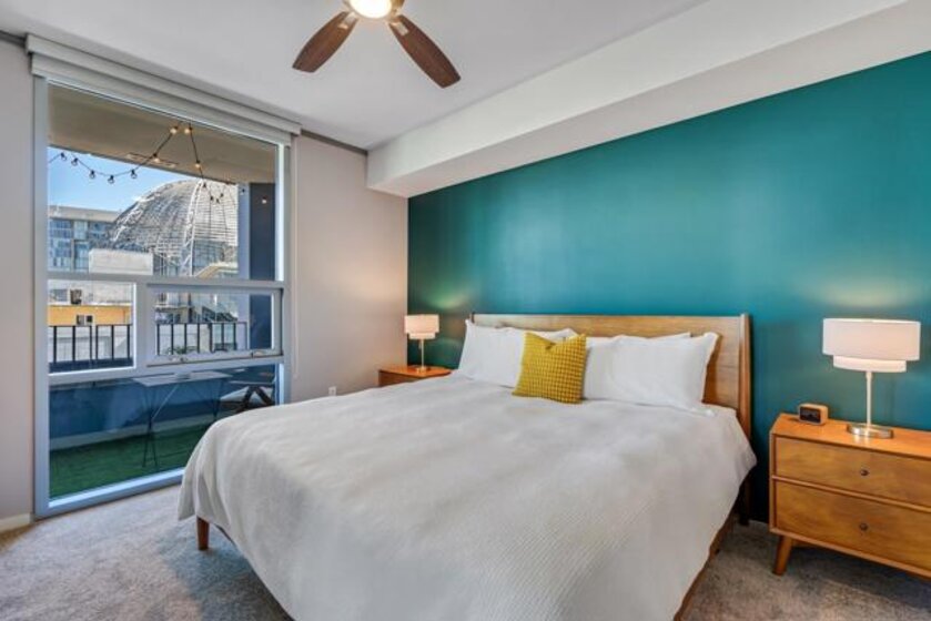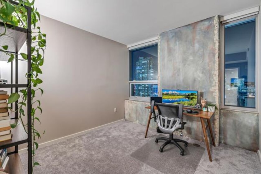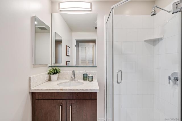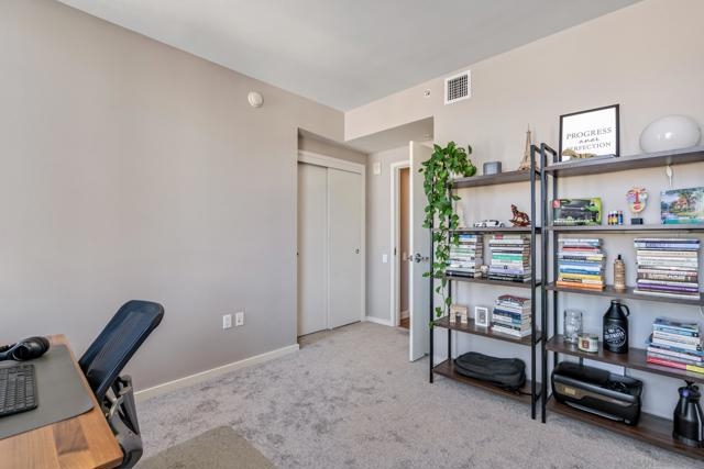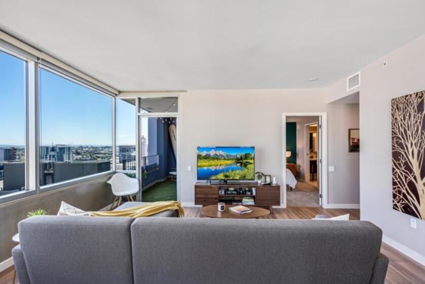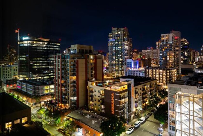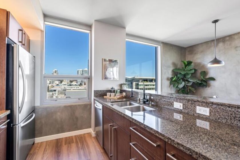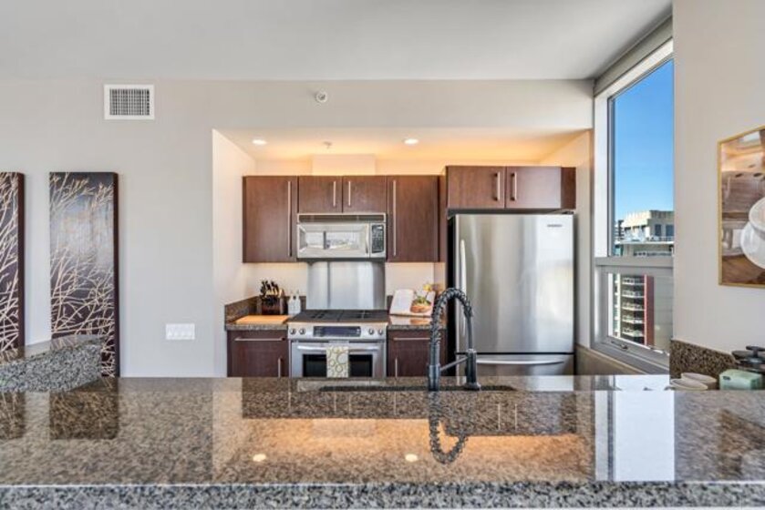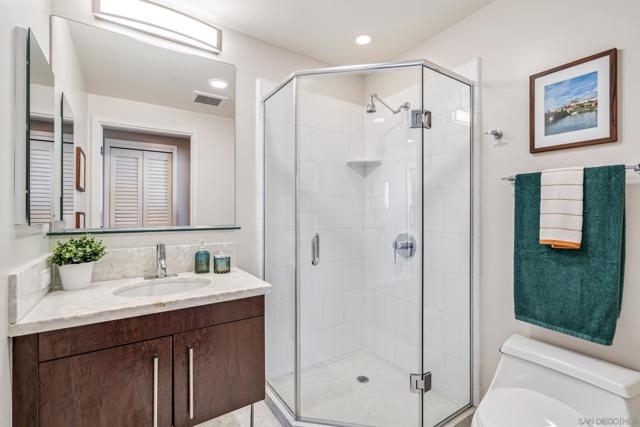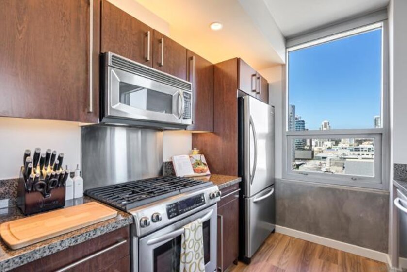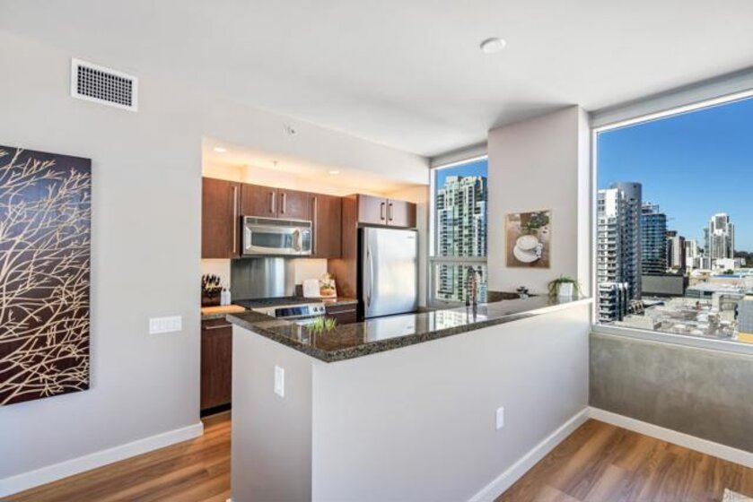 Experience elevated downtown living at ICON, where modern design meets timeless sophistication. This meticulously maintained and upgraded northeast corner residence showcases breathtaking panoramic views of the San Diego Bay, Coronado Bridge, and the sparkling city skyline. Step through the entryway into a light-filled, open-concept floor plan featuring new carpet, wood-look flooring, and fresh designer paint throughout. The gourmet kitchen impresses with stainless steel appliances, sleek granite countertops, and ample cabinetry—perfect for both casual dining and entertaining. The serene primary suite includes a fully built-out closet and a beautifully finished bath with dual vanities. Modern urban comforts include in-unit laundry, two parking spaces, and a private storage unit, providing both convenience and functionality to your downtown lifestyle. ICON is a VA-approved community offering resort-style amenities such as a 24-hour front desk attendant, state-of-the-art fitness center, and the iconic rooftop Skybox terrace with lounge seating, TVs, surround sound, BBQs, heaters, and panoramic city views. Additional amenities include the 5th Inning community recreation room with a full kitchen and business center, a private movie theater, community fireplace, bike and package storage with Amazon lockers, and an interior courtyard featuring sculptural art, a waterfall element, and modern landscaping. Residents also enjoy Google Fiber high-speed internet, on-site property management, and a sleek, contemporary lobby entrance. ICON is a VA-approved community offering resort-style amenities such as a 24-hour front desk attendant, state-of-the-art fitness center, and the iconic rooftop Skybox terrace with lounge seating, TVs, surround sound, BBQs, heaters, and panoramic city views. Additional amenities include the 5th Inning community recreation room with a full kitchen and business center, a private movie theater, community fireplace, bike and package storage with Amazon lockers, and an interior courtyard featuring sculptural art, a waterfall element, and modern landscaping. Residents also enjoy Google Fiber high-speed internet, on-site property management, and a sleek, contemporary lobby entrance. Explore the best of downtown living—just moments from Petco Park, Gallagher Square, the historic Gaslamp Quarter’s shops and dining, the Central Library, convenient trolley and bus lines, FIT Athletic Club, the Harbor Drive Pedestrian Bridge leading to The Rady Shell, the Convention Center, Seaport Village, Embarcadero Parks, the Coronado Ferry, and more. This home offers the perfect balance of sophistication and vibrant urban energy.