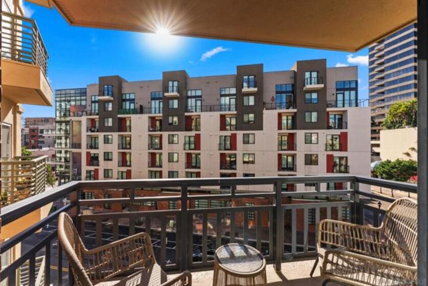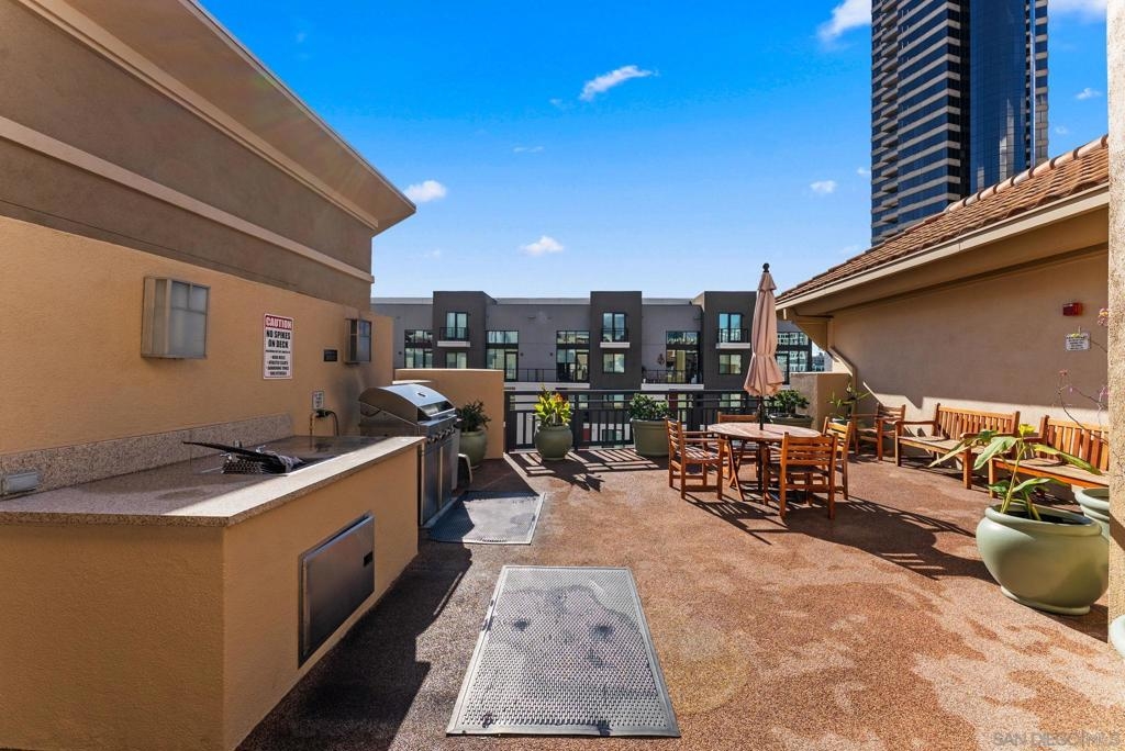 Welcome to Pacific Terrace, an intimate, private building in the coveted Marina District of Downtown San Diego. Perfectly positioned where location and convenience converge, this stylish 4th floor 1 bedroom, 1 bath condo offers exceptional privacy and natural light. South-facing exposure, floor-to-ceiling windows, and French doors create a bright, open living space that flows seamlessly to the private balcony. The well-appointed kitchen features stainless steel appliances, generous cabinetry, ample counter space, and a pantry. The spacious bedroom serves as a serene retreat with expansive windows and abundant closet space, while the separate bathroom is ideal for both everyday living and guests. Pacific Terrace offers a beautiful courtyard with seating, BBQ area, skyline views, secure entry, gated underground parking, and a welcoming lobby. Enjoy everything Downtown San Diego living has to offer!