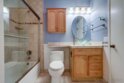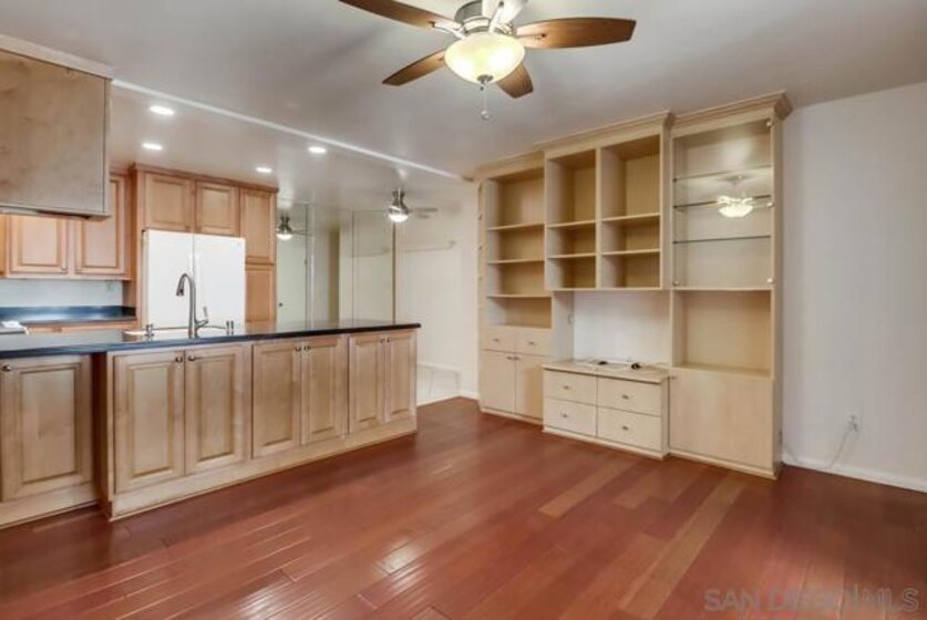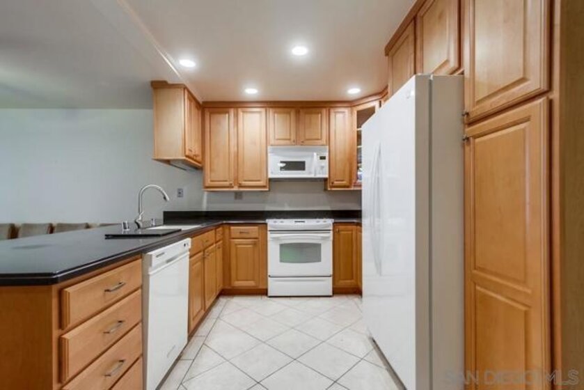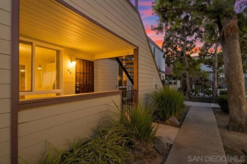 Step into this bright and inviting first-level unit, featuring hard surface flooring and tasteful upgrades throughout. Floor-to-ceiling windows fill each room with natural light, while ceiling fans provide year-round comfort. The upgraded kitchen includes matching white appliances, a built-in microwave, and plenty of cabinet space. The living area offers custom built-in cabinetry for stylish and functional storage. Enjoy a spacious primary bedroom complete with a well-organized walk-in closet and en suite bathroom. The secondary bedroom is thoughtfully designed with a full wall of office cabinetry and dual desks — perfect for working or studying from home. Additional highlights include an in-unit laundry room, a relaxing front patio, and an assigned gated parking space. The centrally located community offers great amenities, including a sparkling pool and spa. In the heart of Serra Mesa, this move-in-ready home combines comfort, convenience, and style — a must-see property you’ll love to call your own!