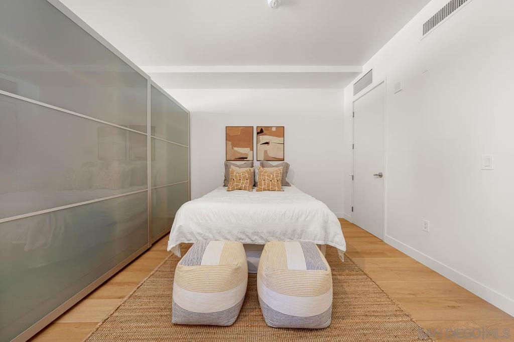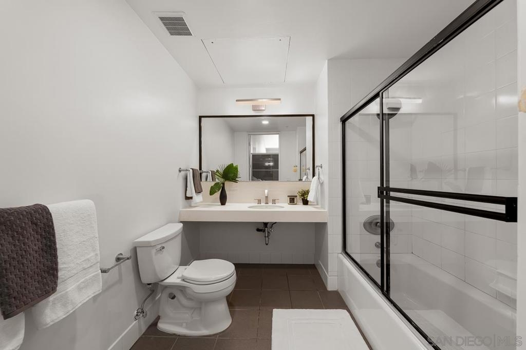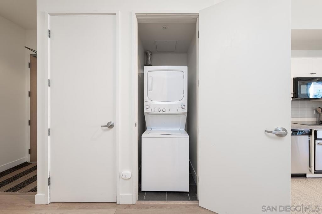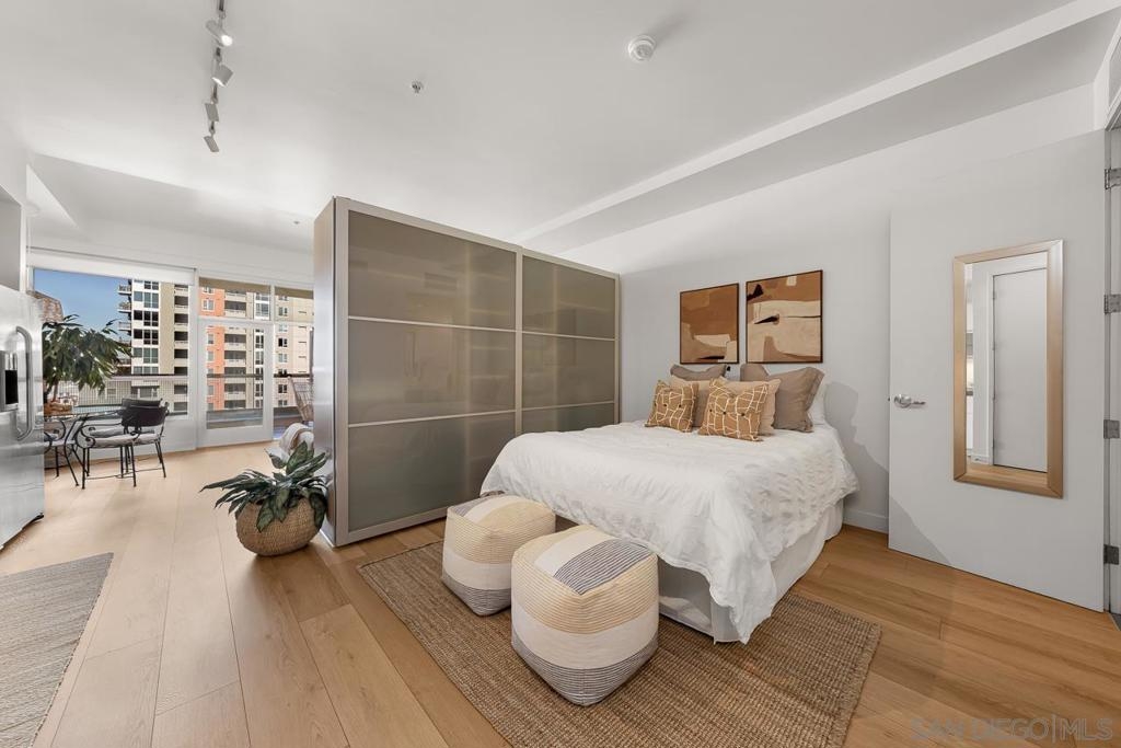 Not to brag, but THE HOA IS 106% FUNDED!!!! Discover elevated urban living in this sophisticated 9th-floor studio perched above the heart of Little Italy. This thoughtfully designed single-level residence offers 674 sq. ft. of contemporary style, highlighted by soaring 10–10.75 ft ceilings and a full north-facing wall of glass that fills the home with natural light. From this vantage point, you can enjoy city and Point Loma views, along with a peek of the San Diego Bay to the west and a front-row look at planes making their approach into San Diego International Airport, a uniquely charming part of Little Italy living. The modern galley kitchen features quartz countertops, sleek cabinetry, and stainless-steel appliances. A rare 1.5-bath layout maximizes functionality, and the in-unit washer/dryer adds everyday convenience. Step out onto your private balcony to take in the neighborhood's activity below. Additional highlights include 8' interior doors, central A/C and heat, and one assigned parking space. A well-funded HOA provides added value by covering water, trash, and sewer services. Set within one of San Diego’s most vibrant neighborhoods, you’re moments from renowned restaurants, cafés, boutiques, the waterfront, and the beloved Saturday Farmer’s Market. This is stylish, walkable urban living at its best in Little Italy Proper, a perfect blend of style, walkability, and effortless urban living.