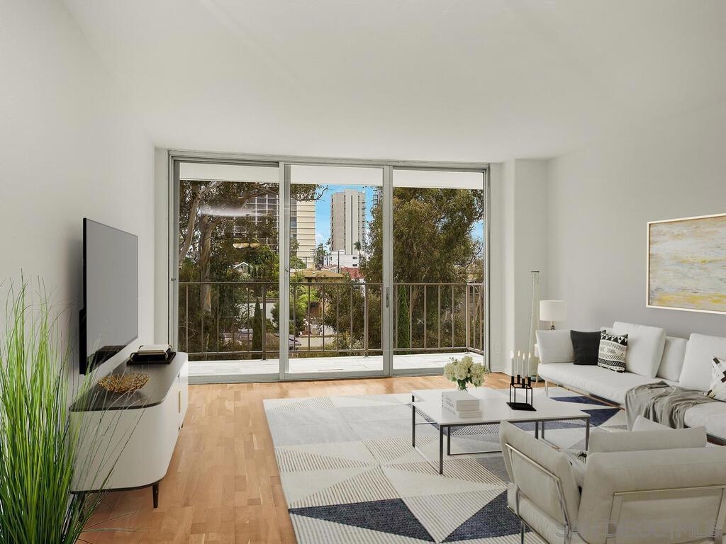 Centrally located in the Balboa Park/Hillcrest communities in the Coral Tree Plaza. Central to restaurants, shopping, freeways, Airport, and Downtown. The condominium is in turn key condition, offering a spacious balcony with canyon and Balboa Park Views, Hardwood wood floors in the Living Room/Dining combination, new stainless kitchen appliances with a sit down bar/dining area, spacious primary bedroom with views and new plush carpet, enormous walk-in closet, interior laundry hook-ups for a stacked washer and dryer, nice vanity area with plenty of linen space and private bath, desirable amenities with tennis, pool/spa and club house, Dog Park and TWO underground parking spaces, which is a rarity, along with Guest suites and bike storage available. Some pics offer artificial staging for comparable views. nice vanity area with plenty of linen space and private bath, desirable amenities with tennis, pool/spa and club house, Dog Park and TWO underground parking spaces, which is a rarity, along with Guest suites and bike storage available. Some pics offer artificial staging for comparable views.