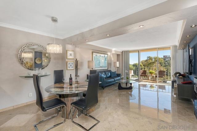 Coral Tree Plaza 6th floor, SW corner unit with a gorgeous view of treetops and the Balboa Park Tower in the distance. Stunning limestone flooring and numerous upgrades, makes this a "must-see" in this high rise condo complex at the end of 7th Avenue. One of the largest balconies at 33' feet expands your living space with an additional 165 sq. ft. for entertaining! Upgrades include recessed lighting, upgraded showers, large walk-in closets in both bedrooms, remodeled kitchen, glass block wall in primary bathroom, and a Neptune washer/dryer. Urban living at its finest, just a short walk to Whole Foods, dining, Uptown District, Balboa Park and nightlife located in the very heart of Hillcrest. It is hard to believe that this quiet condo, with such a gorgeous view, is located so close to everything. This condo has 2 dedicated parking spaces and a storage locker. Also in the underground parking area is a bike storage area and car wash. Amenities include tennis/pickle ball court, guest suites, fitness center and clubhouse that has a kitchen, fireplace & pool table. Heated pool & hot tub are close to the clubhouse.