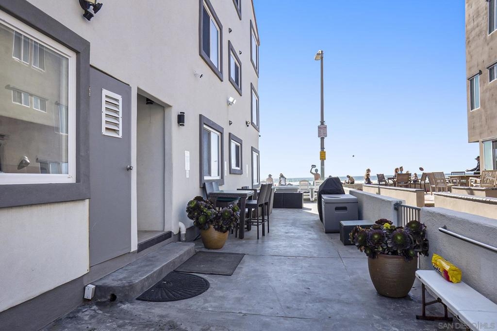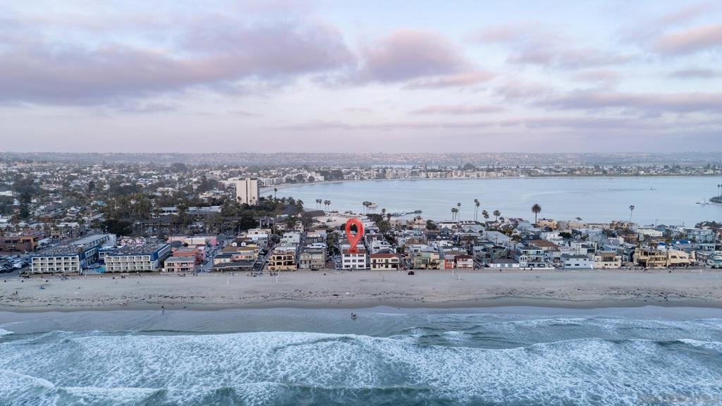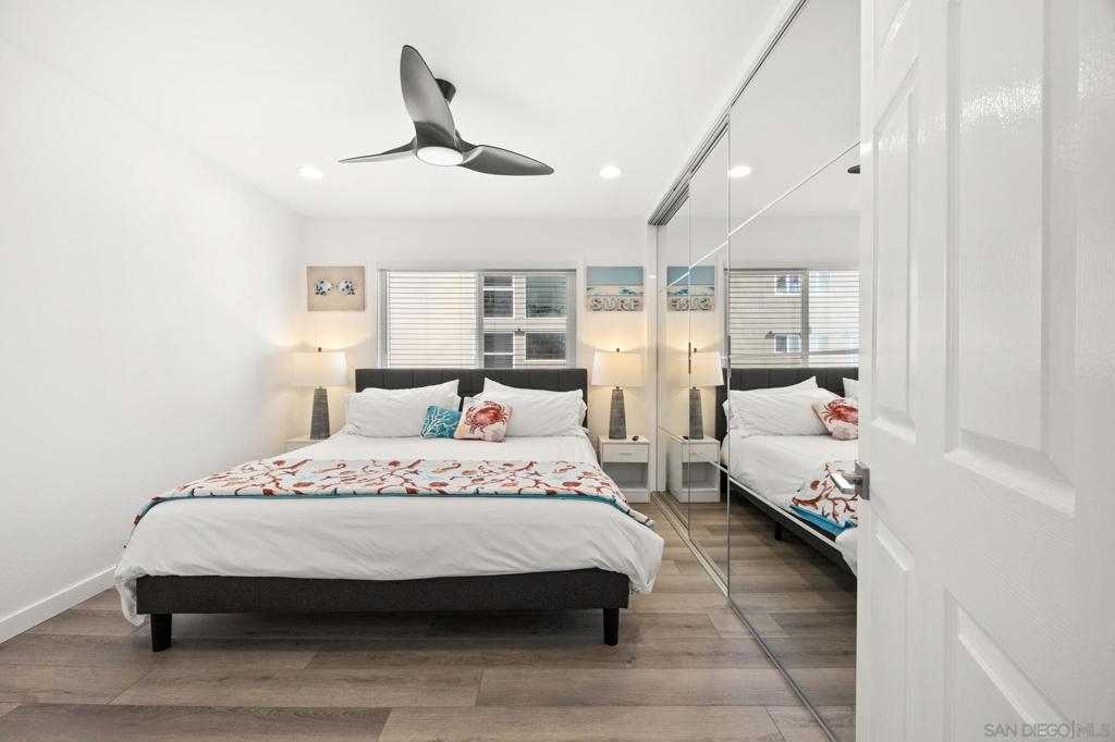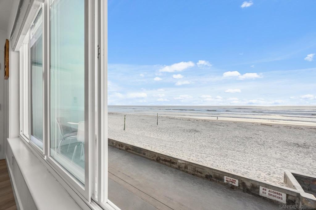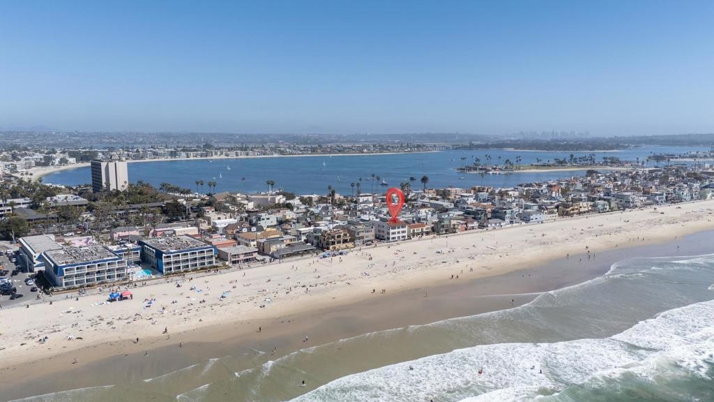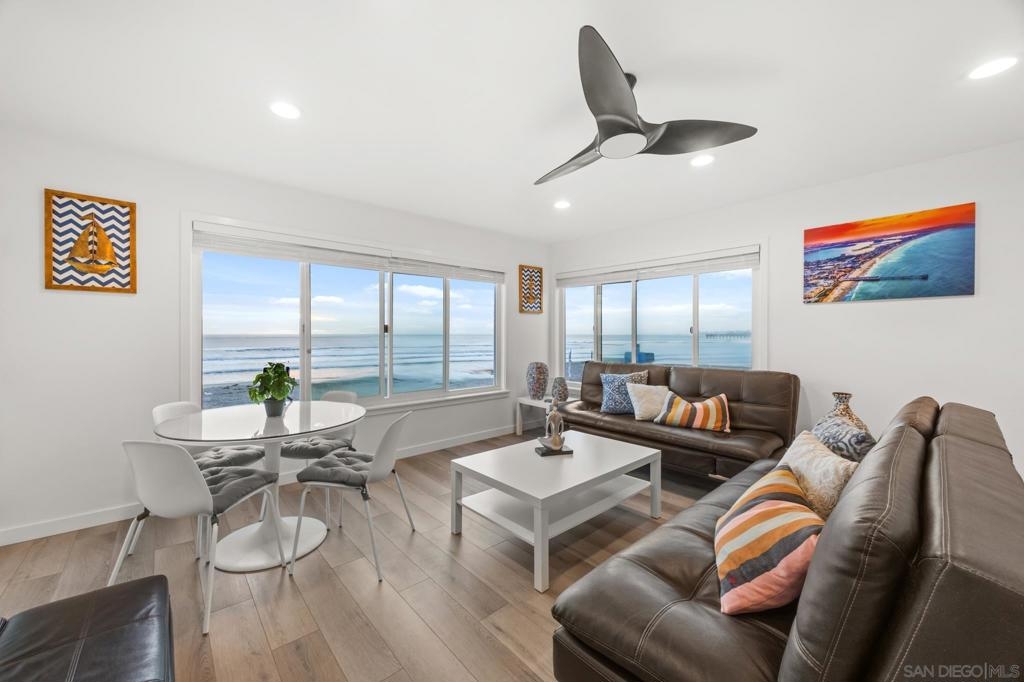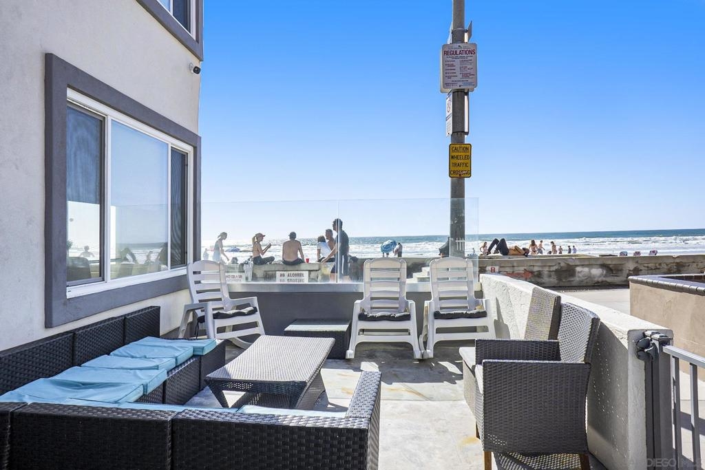 This oceanfront two-bedroom, two-bathroom unit offers a blend of luxury and modern convenience with breathtaking, expansive ocean views. Recently remodeled, it features an energy-efficient HVAC system for optimal comfort, and smart lighting and fans that can be controlled via Wi-Fi, offering customizable color-changing and dimming options. The kitchen is a chef's dream, equipped with European white custom cabinetry, quartz countertops, a custom tile backsplash, and sleek black appliances. A wet bar adds to the convenience and entertainment appeal. Elegant custom wood flooring flows throughout the unit, complemented by all-white wood blinds. In the bathrooms, Carrera white marble walls, new vanities, blue vessel sinks with waterfall faucets, and custom mirrors create a spa-like experience. Both bedrooms feature custom-built closets with mirrored sliding doors, enhancing the spacious feel. Step outside to enjoy stunning sunsets from the common area patio, furnished with tables, couches, chairs, and a BBQ. The building’s recent extensive renovations, including new stucco, windows, upgraded patios, and low-voltage lighting, offer a modern aesthetic throughout. Conveniently, an elevator services all floors of the building, and the location is unbeatable, just steps from restaurants, water sports at the bay, and Belmont Park. Whether as a full-time residence, vacation home, or investment, this unit offers the best of San Diego living. Included is one designated parking spot, and the HOA covers cable, water, sewer, trash, and exterior maintenance.