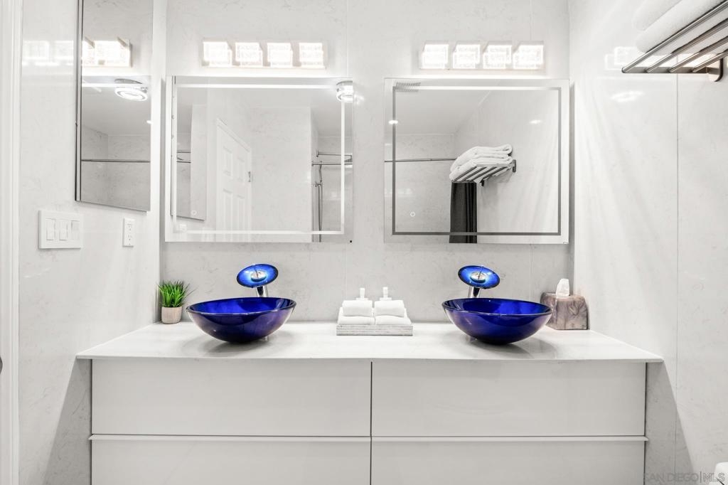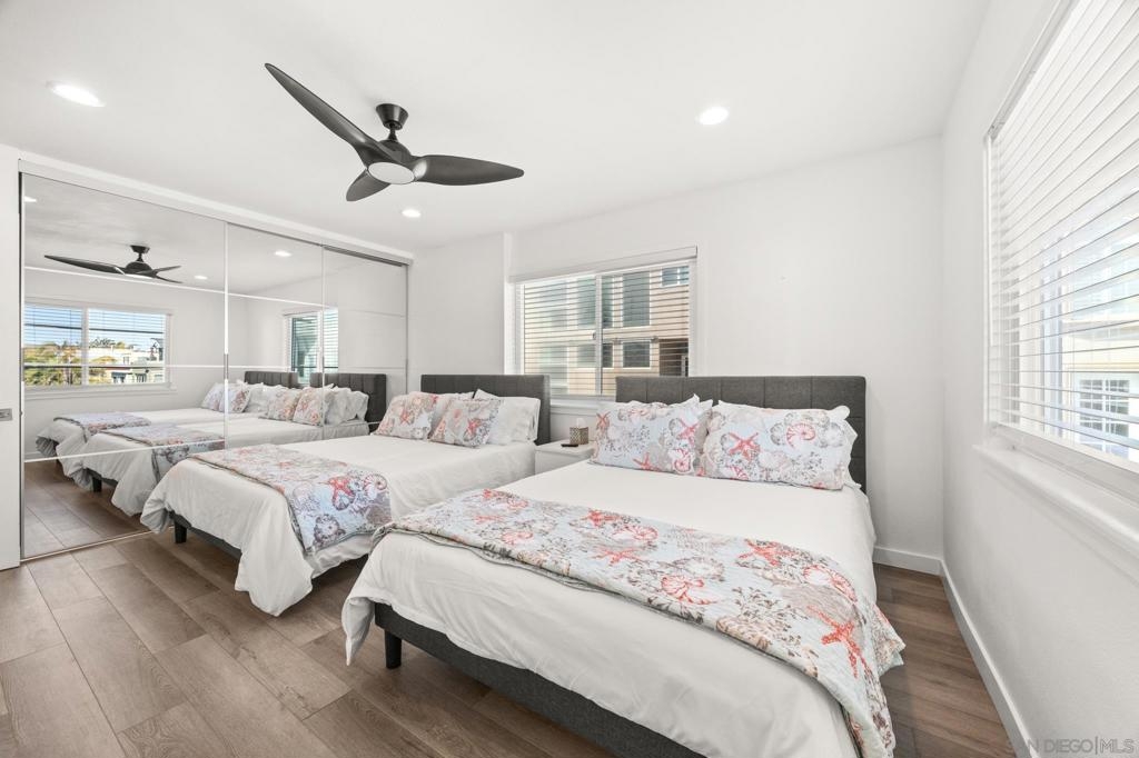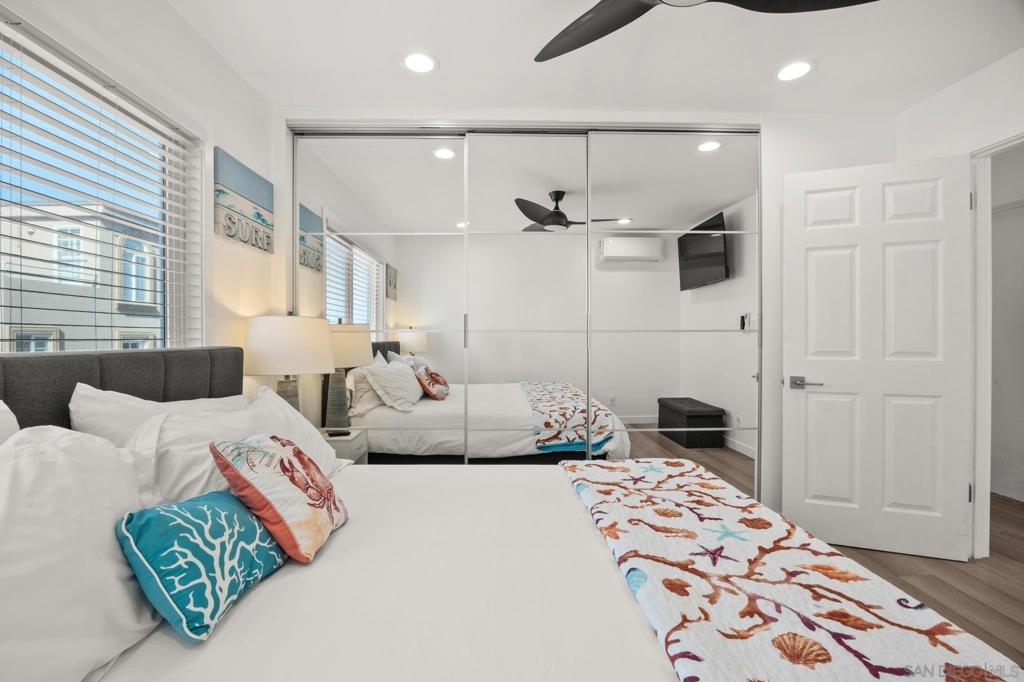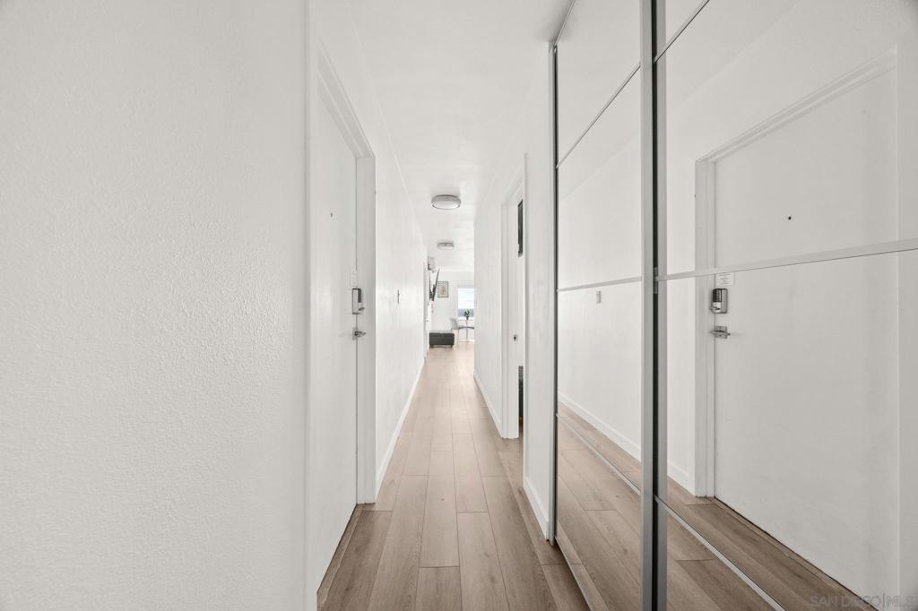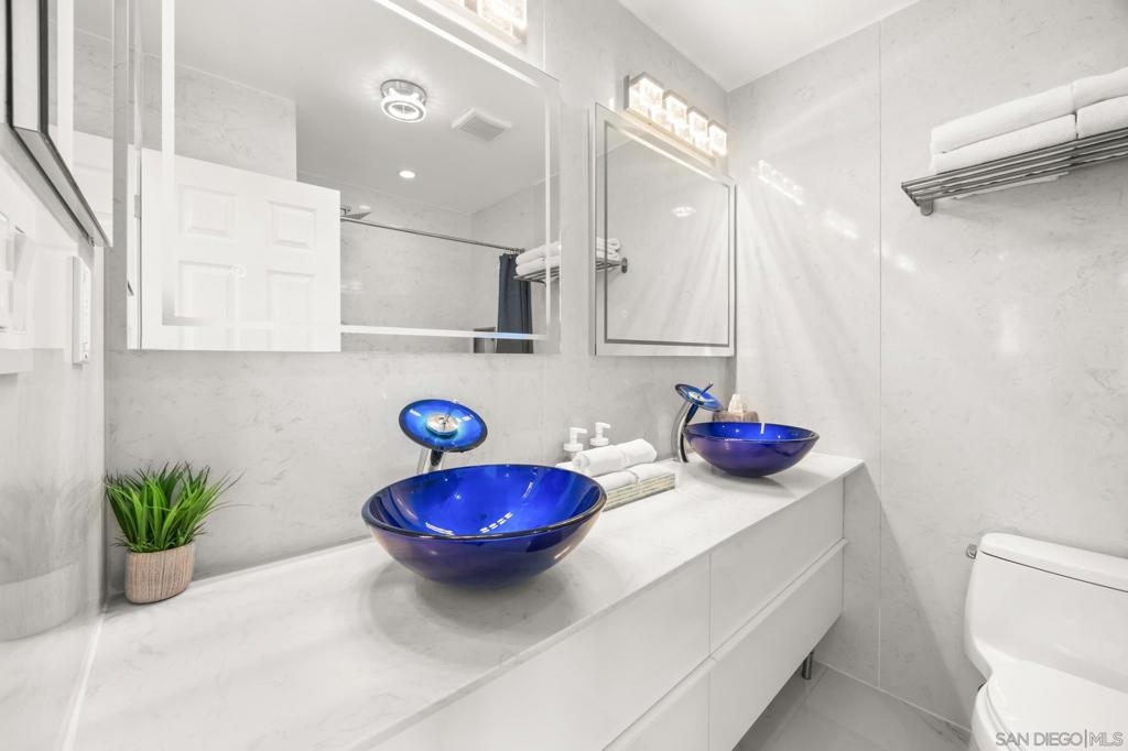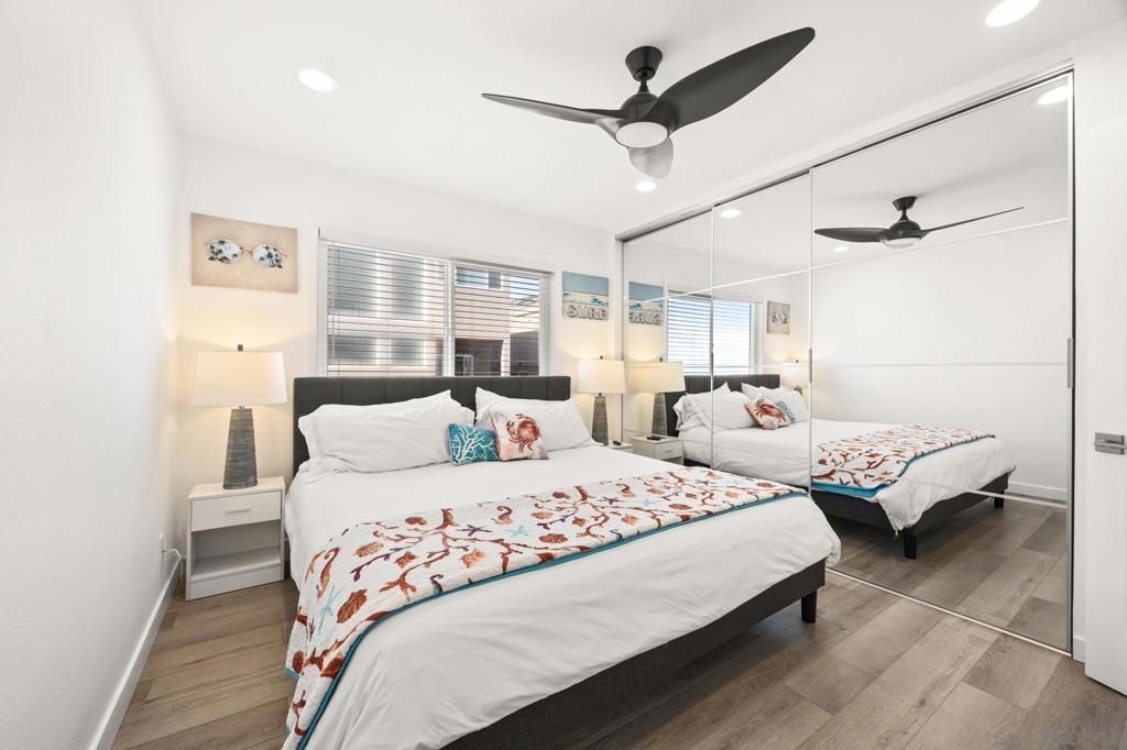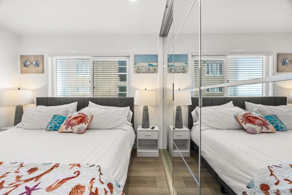 This oceanfront two-bedroom, two-bathroom unit offers a blend of luxury and modern convenience with breathtaking, expansive ocean views. Recently remodeled, it features an energy-efficient HVAC system for optimal comfort, and smart lighting and fans that can be controlled via Wi-Fi, offering customizable color-changing and dimming options. The kitchen is a chef's dream, equipped with European white custom cabinetry, quartz countertops, a custom tile backsplash, and sleek black appliances. A wet bar adds to the convenience and entertainment appeal. Elegant custom wood flooring flows throughout the unit, complemented by all-white wood blinds. In the bathrooms, Carrera white marble walls, new vanities, blue vessel sinks with waterfall faucets, and custom mirrors create a spa-like experience. Both bedrooms feature custom-built closets with mirrored sliding doors, enhancing the spacious feel. Step outside to enjoy stunning sunsets from the common area patio, furnished with tables, couches, chairs, and a BBQ. The building’s recent extensive renovations, including new stucco, windows, upgraded patios, and low-voltage lighting, offer a modern aesthetic throughout. Conveniently, an elevator services all floors of the building, and the location is unbeatable, just steps from restaurants, water sports at the bay, and Belmont Park. Whether as a full-time residence, vacation home, or investment, this unit offers the best of San Diego living. Included is one designated parking spot, and the HOA covers cable, water, sewer, trash, and exterior maintenance.