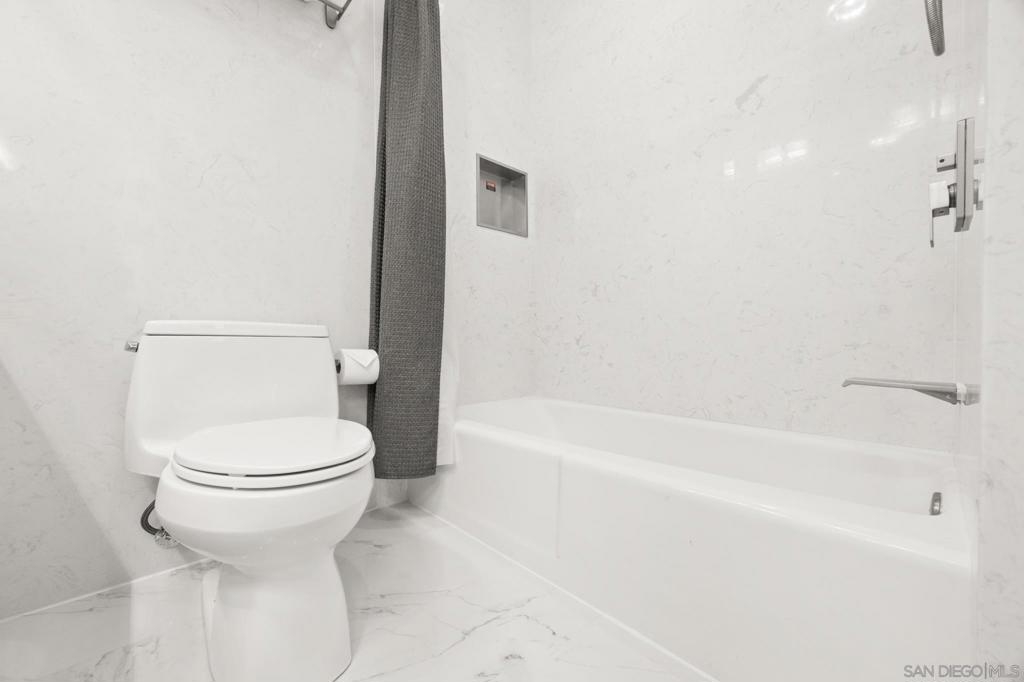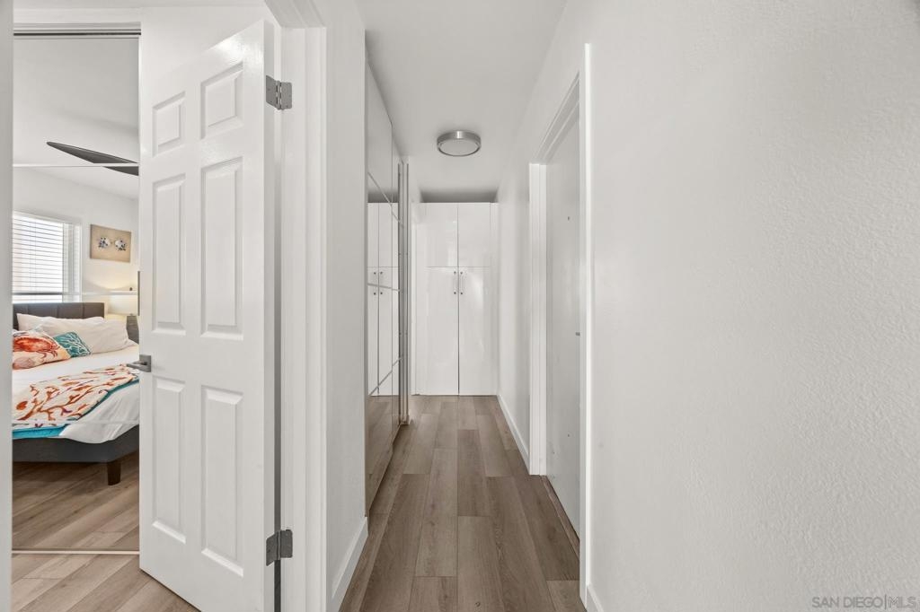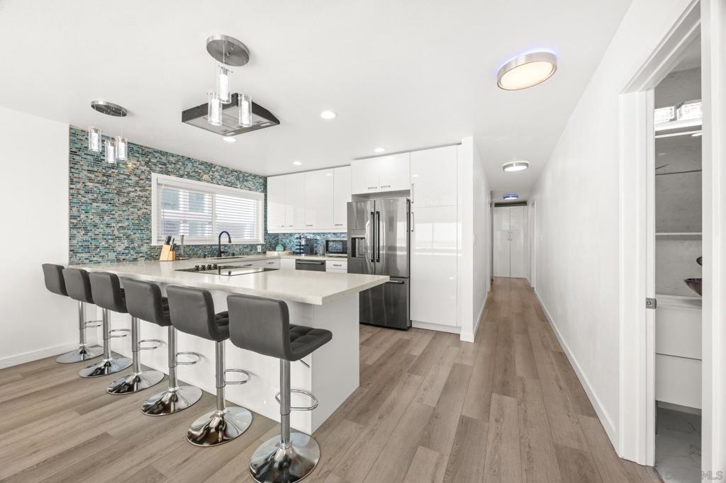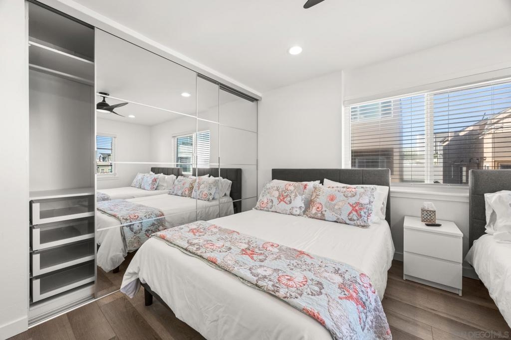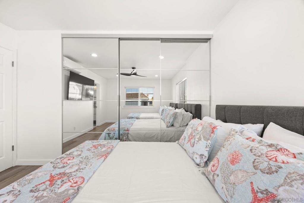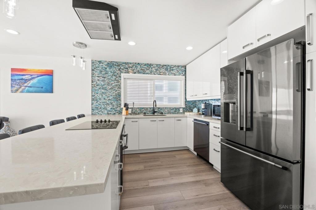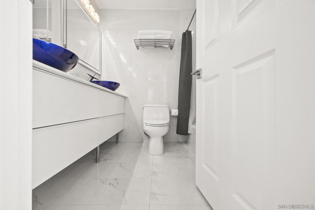 This oceanfront two-bedroom, two-bathroom unit offers a blend of luxury and modern convenience with breathtaking, expansive ocean views. Recently remodeled, it features an energy-efficient HVAC system for optimal comfort, and smart lighting and fans that can be controlled via Wi-Fi, offering customizable color-changing and dimming options. The kitchen is a chef's dream, equipped with European white custom cabinetry, quartz countertops, a custom tile backsplash, and sleek black appliances. A wet bar adds to the convenience and entertainment appeal. Elegant custom wood flooring flows throughout the unit, complemented by all-white wood blinds. In the bathrooms, Carrera white marble walls, new vanities, blue vessel sinks with waterfall faucets, and custom mirrors create a spa-like experience. Both bedrooms feature custom-built closets with mirrored sliding doors, enhancing the spacious feel. Step outside to enjoy stunning sunsets from the common area patio, furnished with tables, couches, chairs, and a BBQ. The building’s recent extensive renovations, including new stucco, windows, upgraded patios, and low-voltage lighting, offer a modern aesthetic throughout. Conveniently, an elevator services all floors of the building, and the location is unbeatable, just steps from restaurants, water sports at the bay, and Belmont Park. Whether as a full-time residence, vacation home, or investment, this unit offers the best of San Diego living. Included is one designated parking spot, and the HOA covers cable, water, sewer, trash, and exterior maintenance.