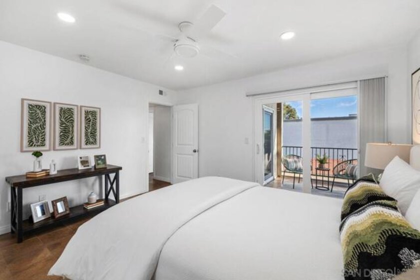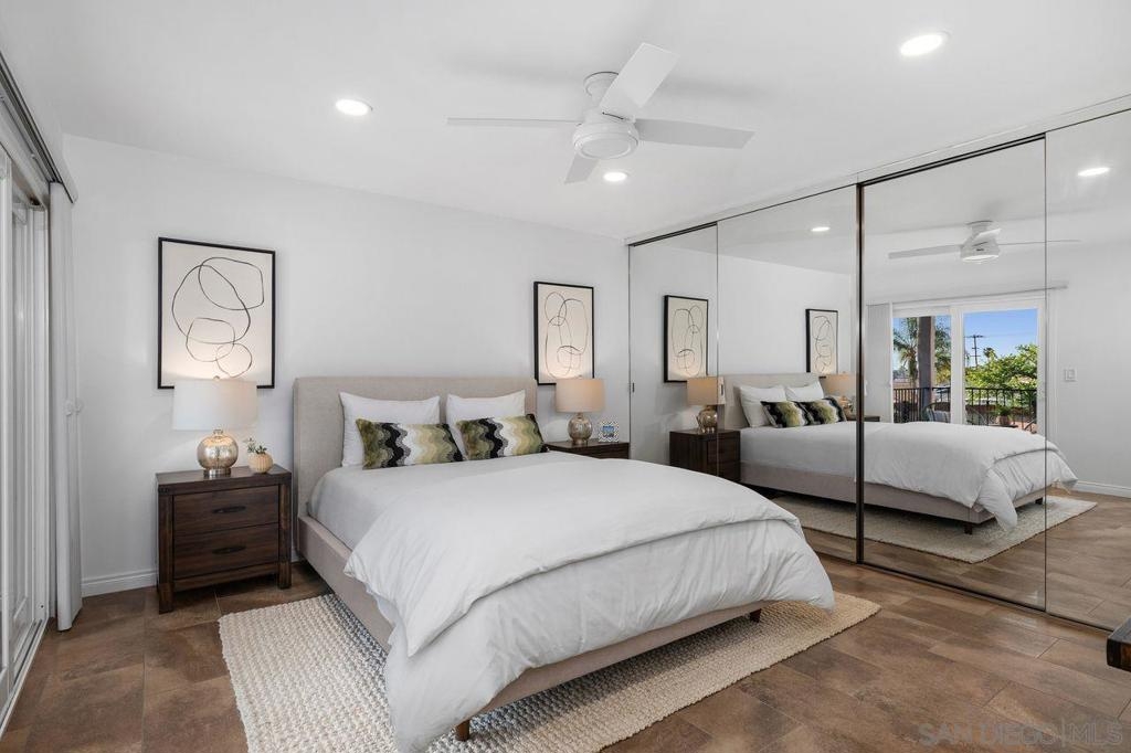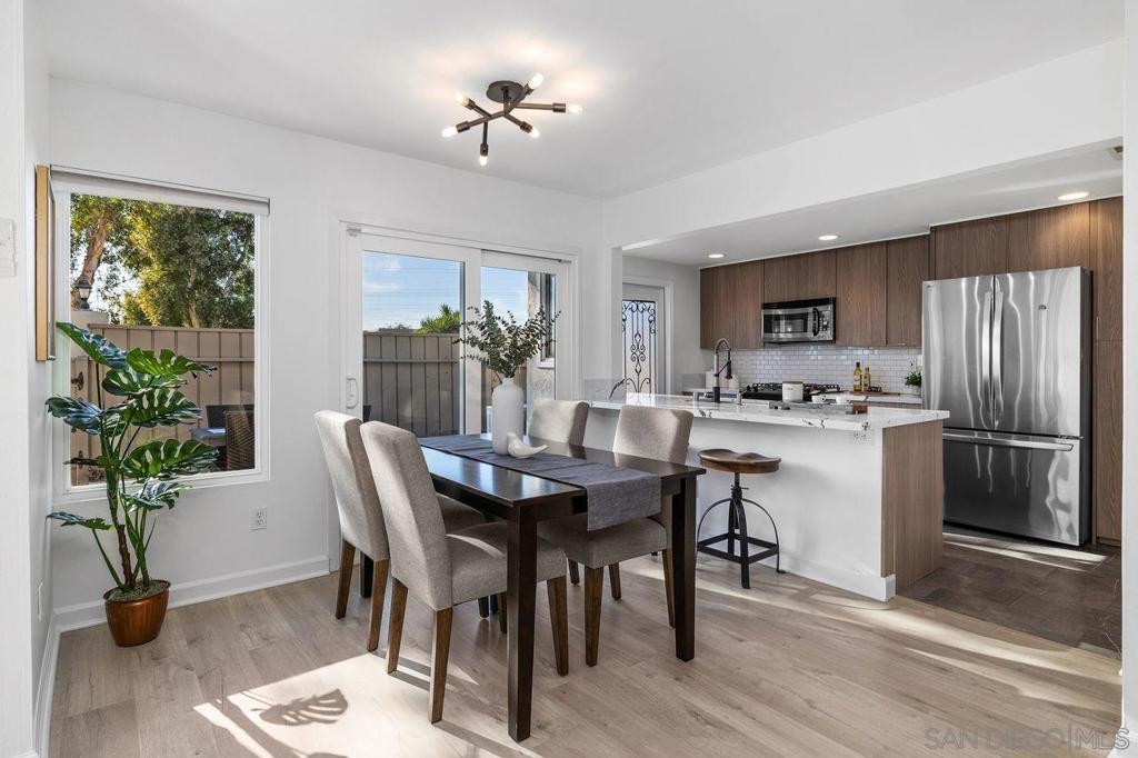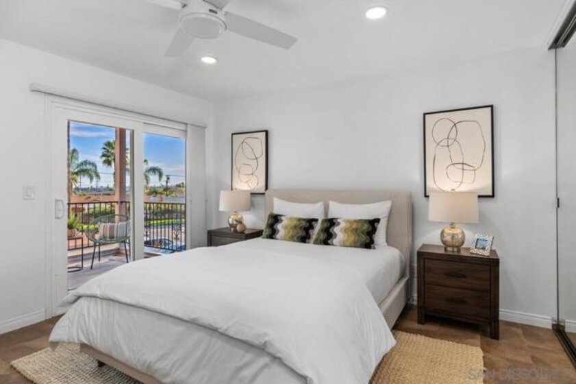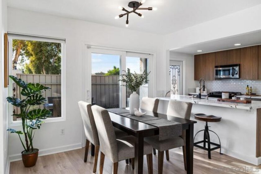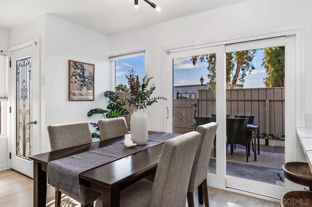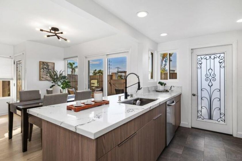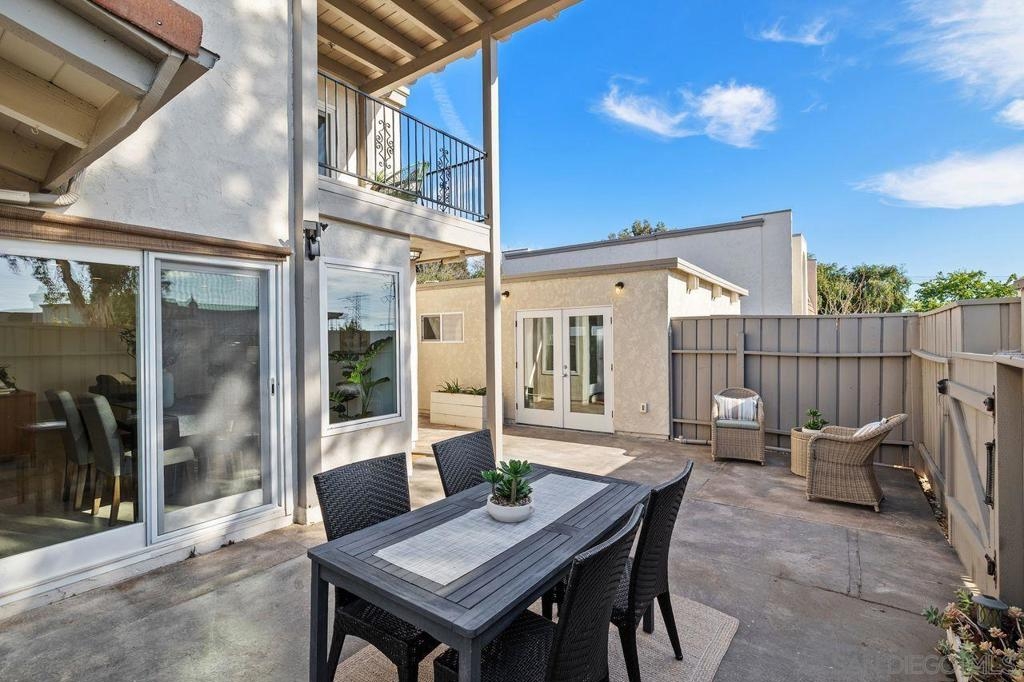 Spacious and thoughtfully remodeled two-story Pacific Bluffs corner unit that lives like a detached home! The generous private, enclosed patio offers exceptional outdoor space for dining, entertaining, gardening, or simply relaxing in the CA sunshine! A separate walk-in storage closet provides practical space for bikes, boards, and gear. Inside, the open kitchen and living area is filled with natural light, and the recently renovated kitchen includes quartz countertops, flat-panel cabinetry, a beautiful tile backsplash, and stainless steel appliances. The lower level features luxury vinyl plank flooring and recessed lighting throughout. Additional recent value-added upgrades include a tankless water heater with recirculator, a newer central heat pump and AC, newer TPO roofing, and fully owned solar panels!! A rare fully enclosed two-car garage offers epoxy-finished floors, drywalled walls, and a newer garage door. Upstairs are two bedrooms and a full bath, plus a convenient half bath on the main level. Both bedrooms access a west-facing deck—an inviting spot to enjoy sunsets. Pacific Bluffs residents enjoy an array of amenities, including an Olympic-size lap pool, children’s pool, playground, basketball court, shuffleboard, fitness room, game room, clubhouse, and library. Another plus - this unit is adjacent to TONS of guest spots! Note, tax records reflect this property as a single-family residence meaning better interest rates! Ideally located in the heart of Clairemont, with easy access to shopping, dining, and major freeways.