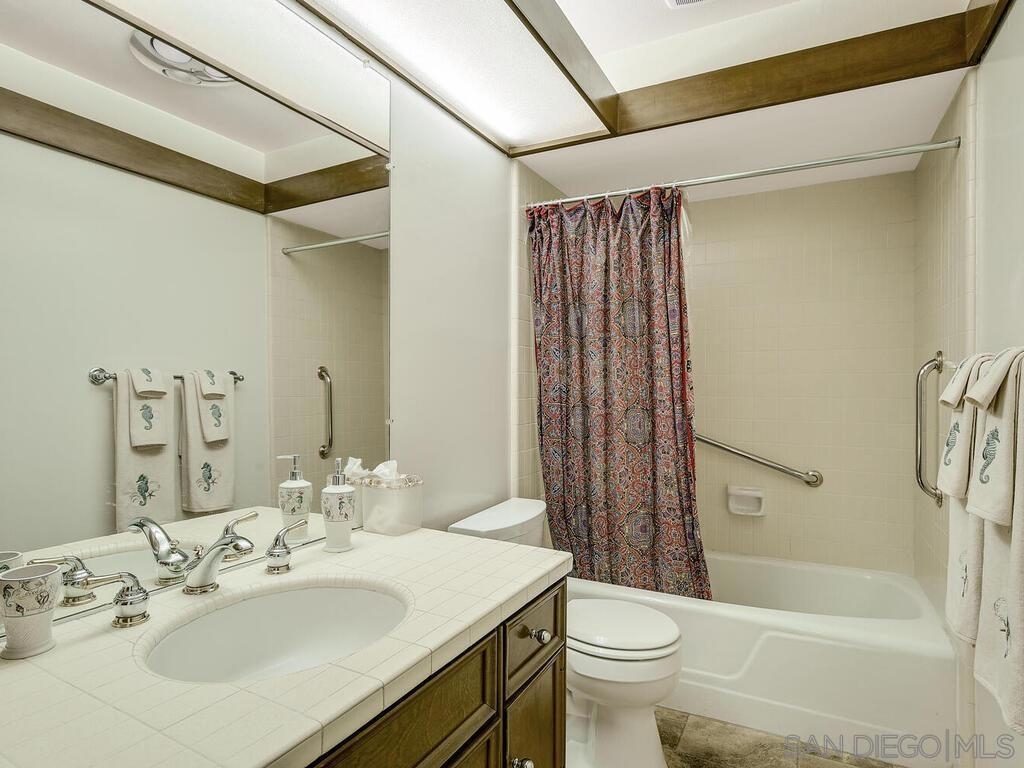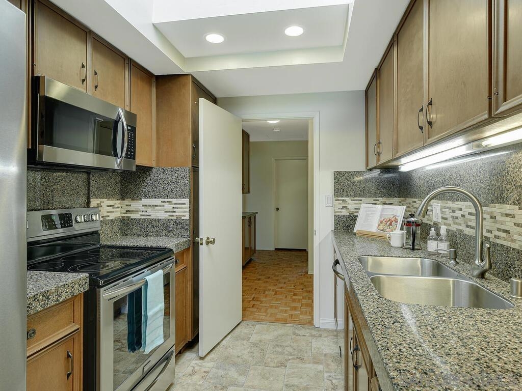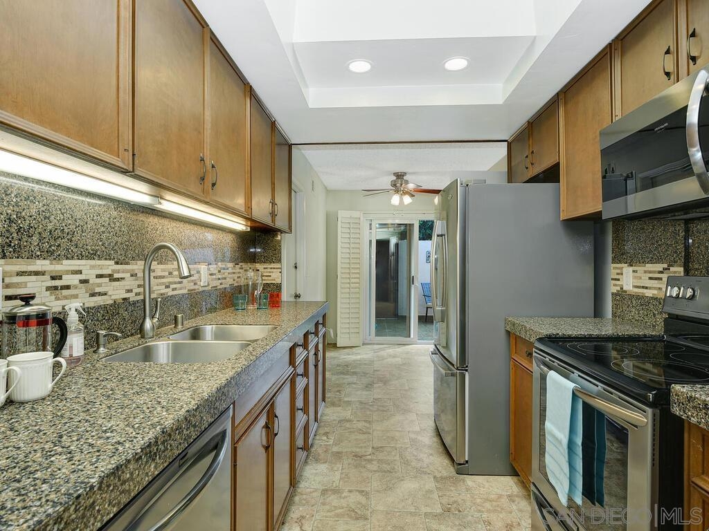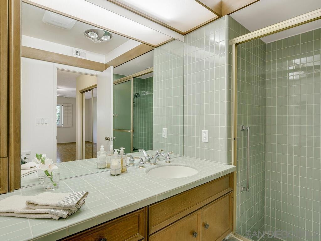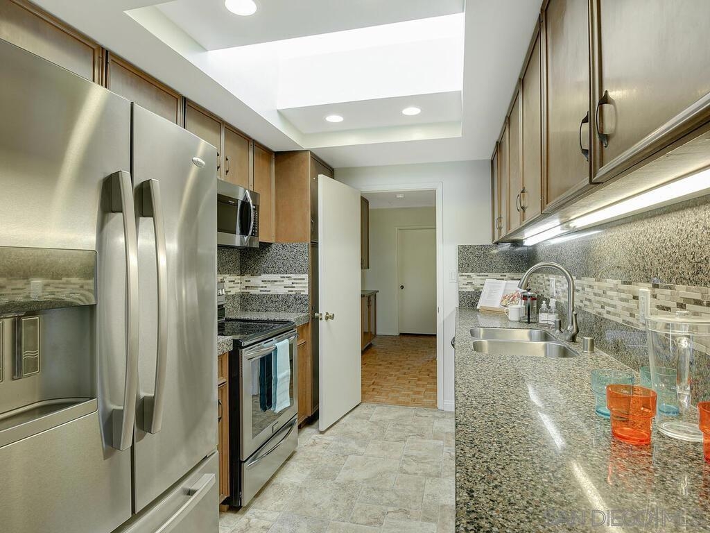Beautifully maintained & updated single story end unit w/real Mid Century Modern style. Newer dual pane windows and sliders, kitchen w/granite counter tops & stainless appliances, newer AC, furnace, water heater, bathroom fixtures. Original wood paneling, regrouted tiles & cabinets, gleaming oak parquet flooring & custom wood shutters. Light filled w/windows on 3 sides, it feels like a house. Great indoor/outdoor flow from living room to the huge fully enclosed patio. Direct entry garage with no steps, extra parking is available w/approved permit. Excellent, peaceful location with gorgeous landscaping around the unit. Collwood Park is an award winning community with 3 pools(1 heated all year), a large clubhouse, 2 spas, and almost 26 acres of beautiful grounds and extensive walkways. The parklike atmosphere and make it ideal for strolling, exercise and pets. This is also a wonderful central location just minutes to downtown, the beaches, SDSU and great shopping.
