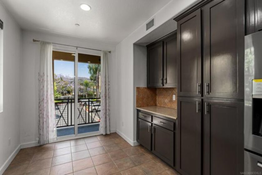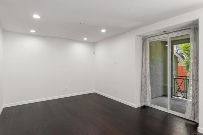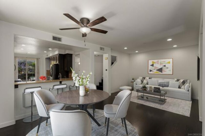 FHA/VA Approved! Bright, welcoming, and ideally located, this end-unit townhome in the Tribeca community offers a smart layout and everyday comfort in the heart of Kearny Mesa. Set on a quiet street lined with palm trees and just steps from a local park, the home blends modern convenience with easy access to shopping, dining, major freeways, and everyday essentials. Inside, you’ll find a thoughtfully well-maintained space featuring hardwood flooring, dual-pane windows w/ custom window treatments, and recessed lighting throughout. The open-concept kitchen is both functional and inviting, with stainless steel appliances, granite countertops, a stylish tile backsplash & ample cabinet and counter space. A breakfast bar adds flexibility for casual meals or entertaining. The main level features two private balconies with no direct neighbors, offering added privacy and a peaceful setting for morning coffee or evening relaxation. The layout flows smoothly into the living and dining areas, with a guest bedroom and full bathroom just down the hall. Custom designed closets with added storage in each bedroom enhance both style and organization. An in-unit washer and dryer complete the convenience of the second floor. Upstairs, the primary suite occupies the entire floor, offering a private retreat with an ensuite bathroom. Amenities include a two-car tandem garage with built-in cabinets & workspace and forced a/c, while the community provides pool, spa, and BBQ areas. Take advantage of this rare opportunity to own in one of San Diego’s most convenient and well-connected neighborhoods.