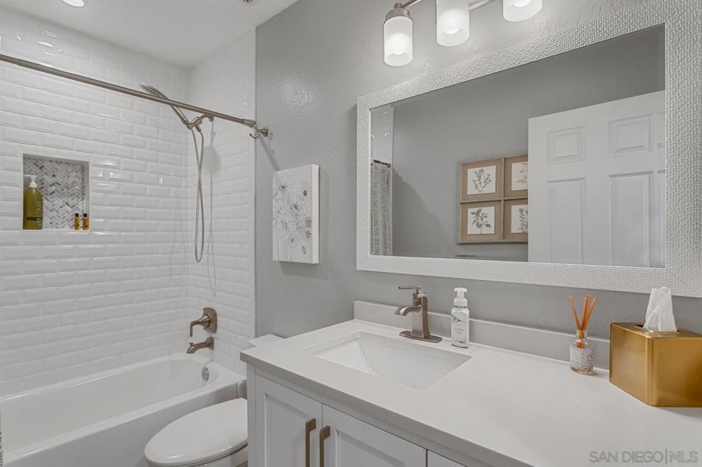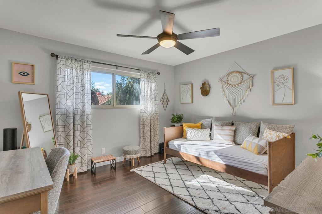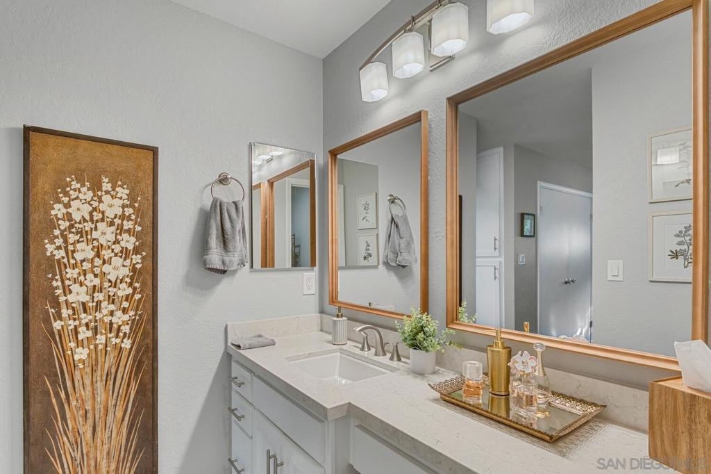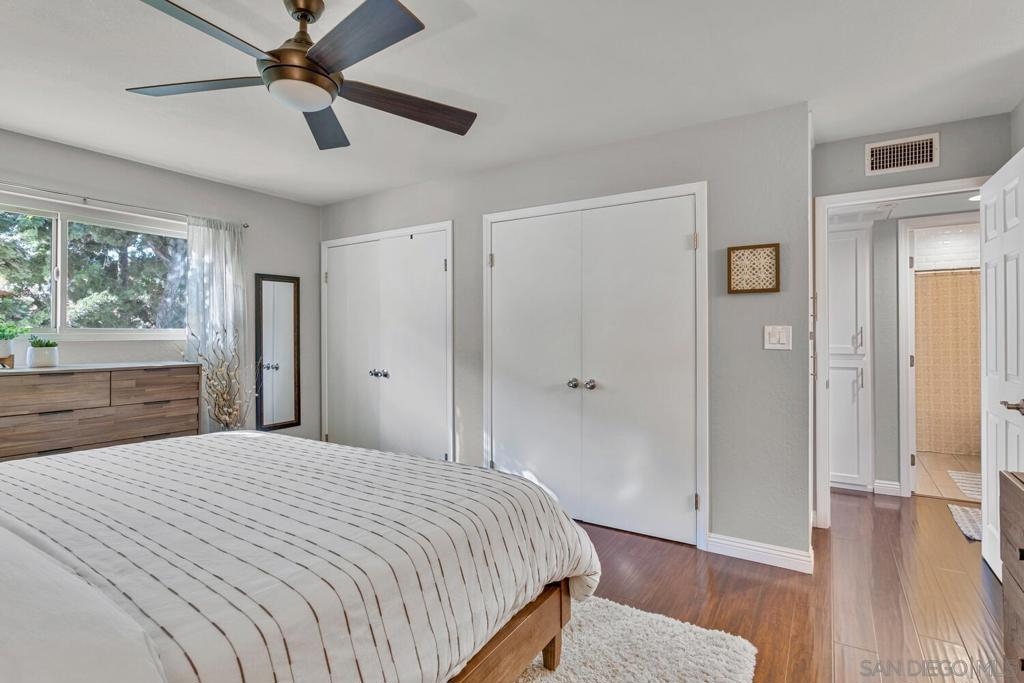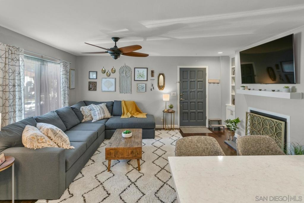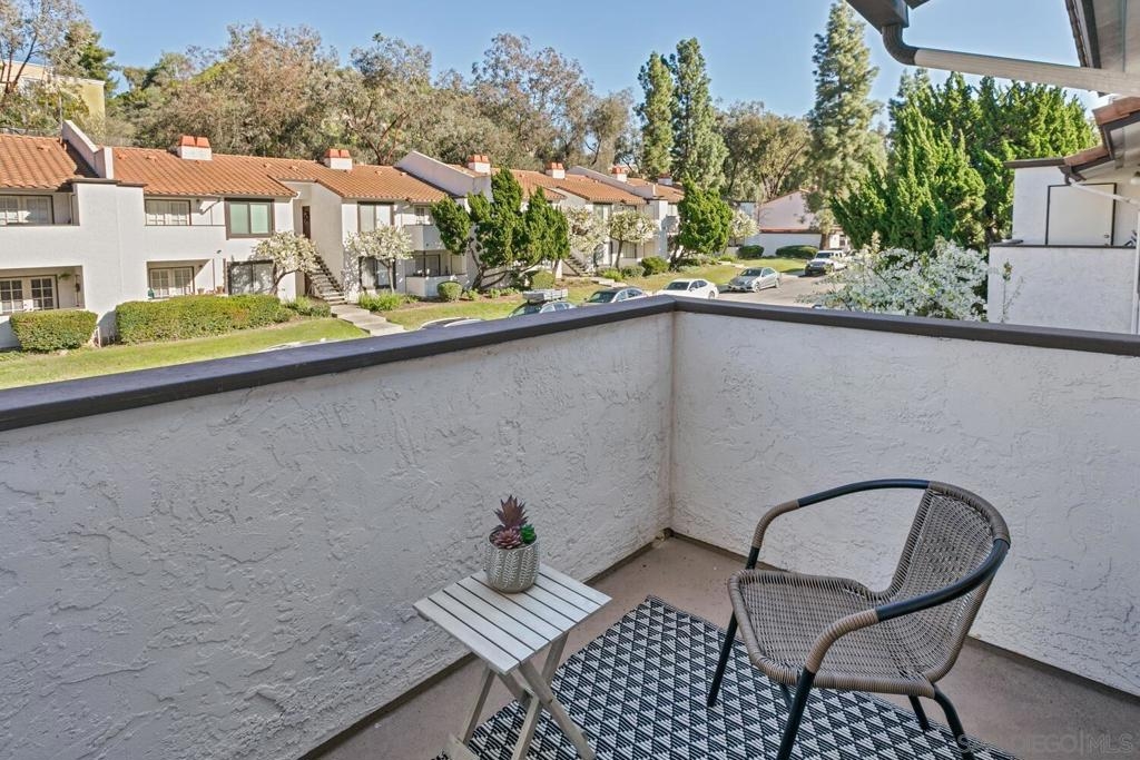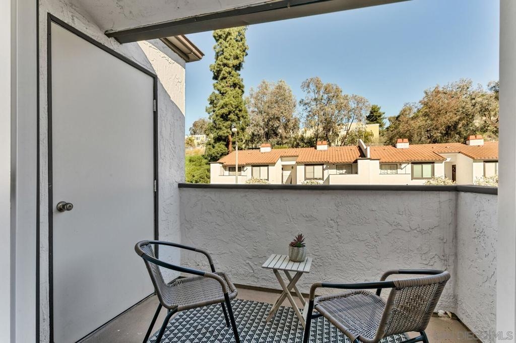 Absolutely beautiful from top to bottom, this turn-key & finely remodeled top floor end unit in the desirable Collwood Meadows will not disappoint. Quartz countertops in kitchen & bathrooms, custom tile work in primary & guest baths and built-in vanity in primary bathroom, updated cabinetry, engineered wood flooring, dual paned windows & recessed lighting. Convenient in-unit laundry, large living area with wood burning fireplace, ceiling fans in living room & bedrooms complement central heating & A/C. French doors with custom shutters open to private balcony for enjoying morning coffee & evening breezes. Hillside views from bedrooms & open feel of complex give a feeling of privacy in this home. Convenient to SDSU, Mission Valley, Fashion Valley, shopping & hwy access. Collwood Meadows has plenty of guest parking, pool & spa and a private parklike area.