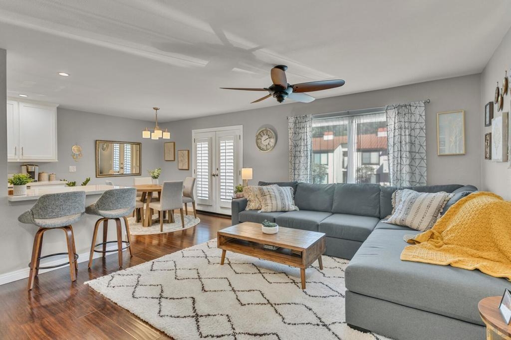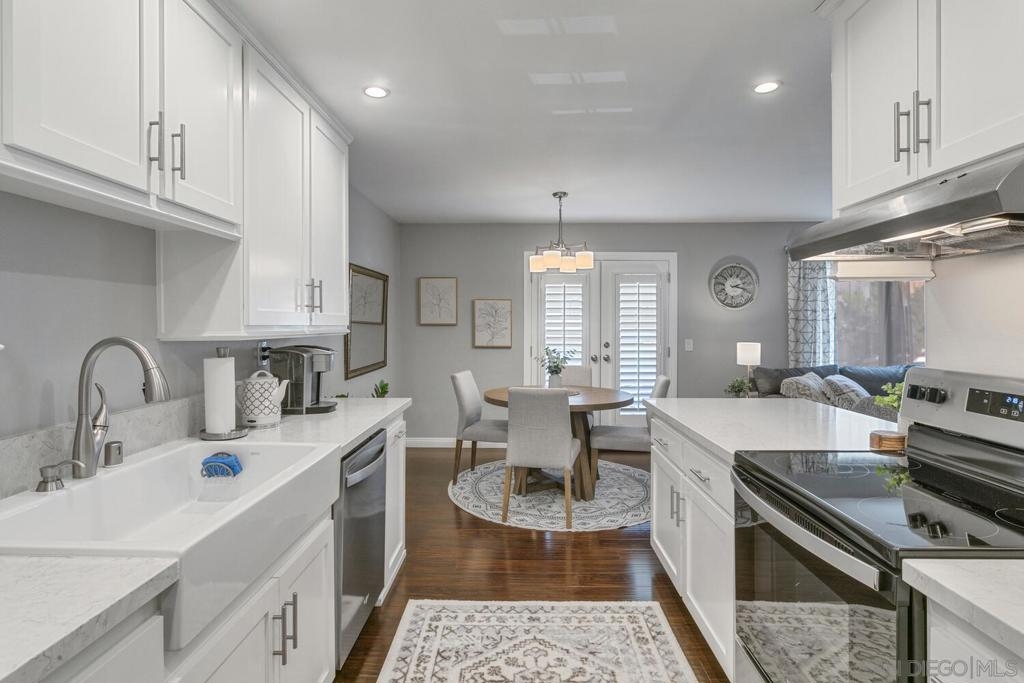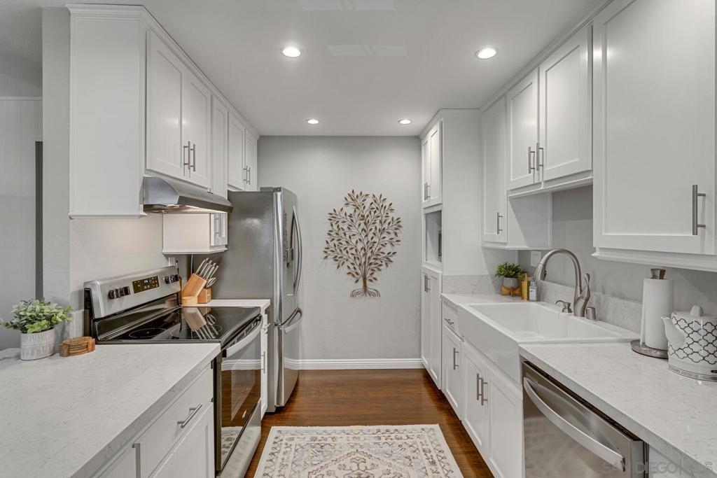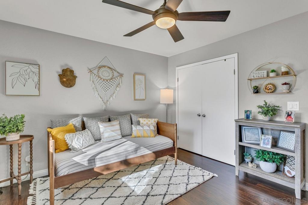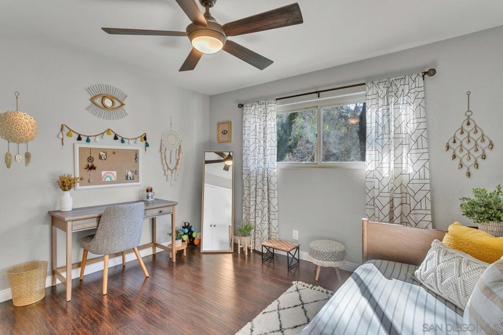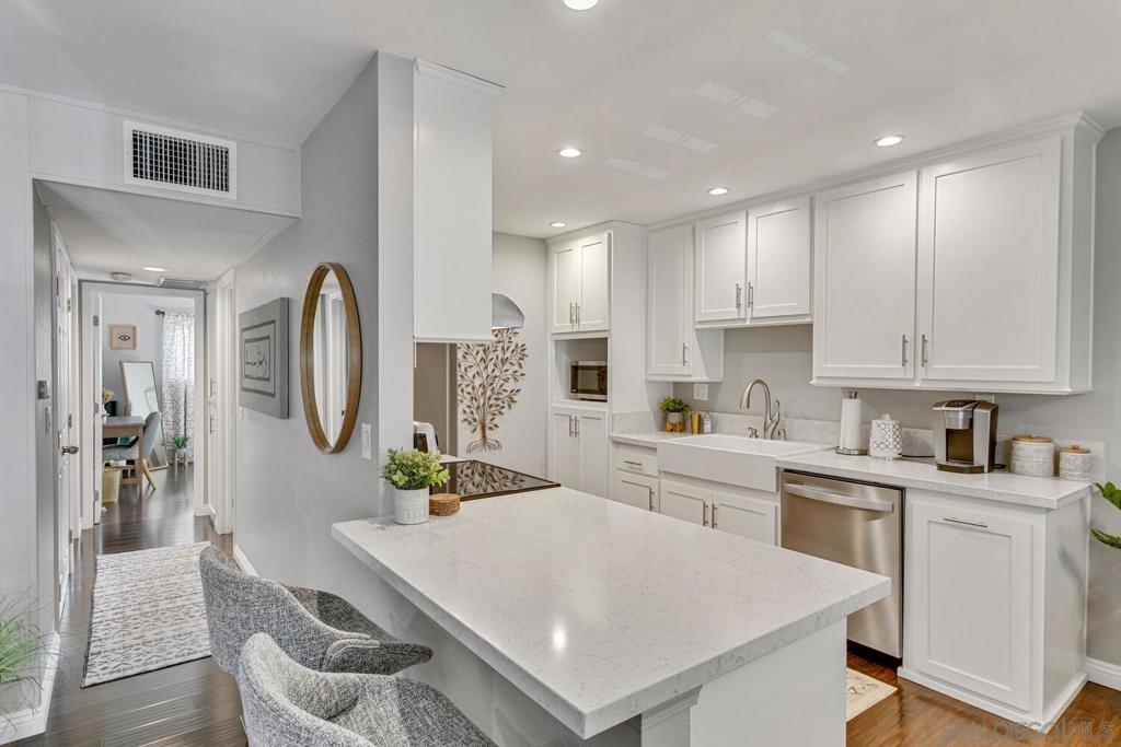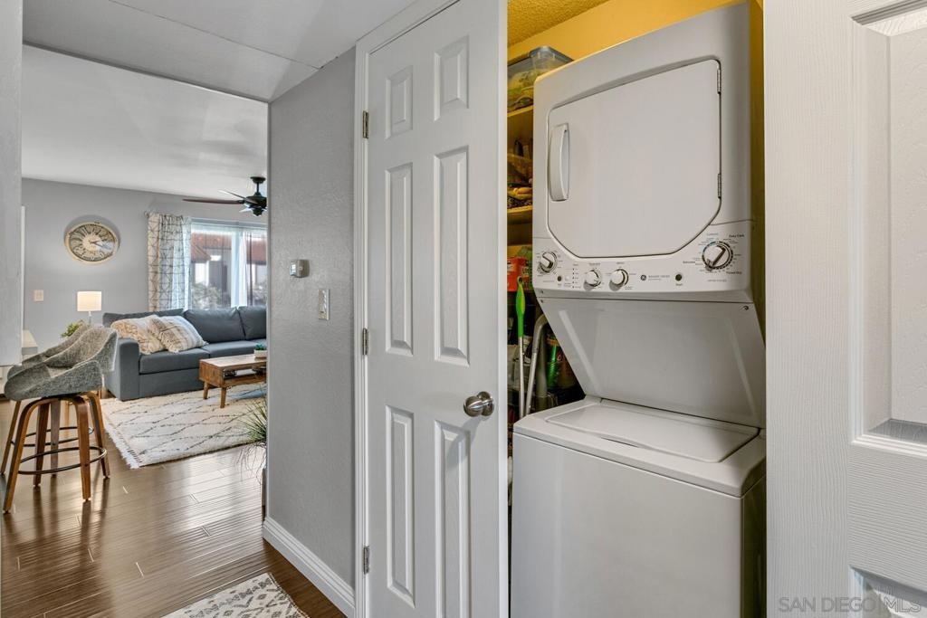 Absolutely beautiful from top to bottom, this turn-key & finely remodeled top floor end unit in the desirable Collwood Meadows will not disappoint. Quartz countertops in kitchen & bathrooms, custom tile work in primary & guest baths and built-in vanity in primary bathroom, updated cabinetry, engineered wood flooring, dual paned windows & recessed lighting. Convenient in-unit laundry, large living area with wood burning fireplace, ceiling fans in living room & bedrooms complement central heating & A/C. French doors with custom shutters open to private balcony for enjoying morning coffee & evening breezes. Hillside views from bedrooms & open feel of complex give a feeling of privacy in this home. Convenient to SDSU, Mission Valley, Fashion Valley, shopping & hwy access. Collwood Meadows has plenty of guest parking, pool & spa and a private parklike area.