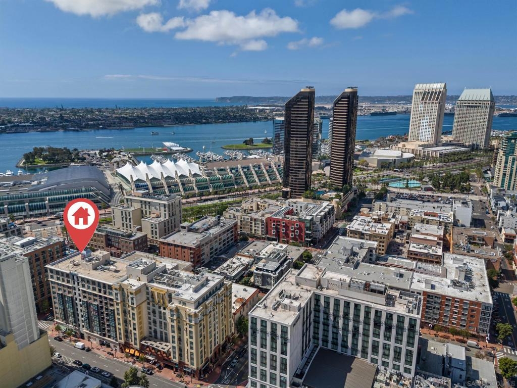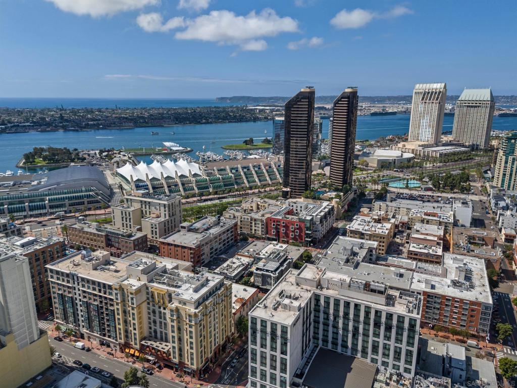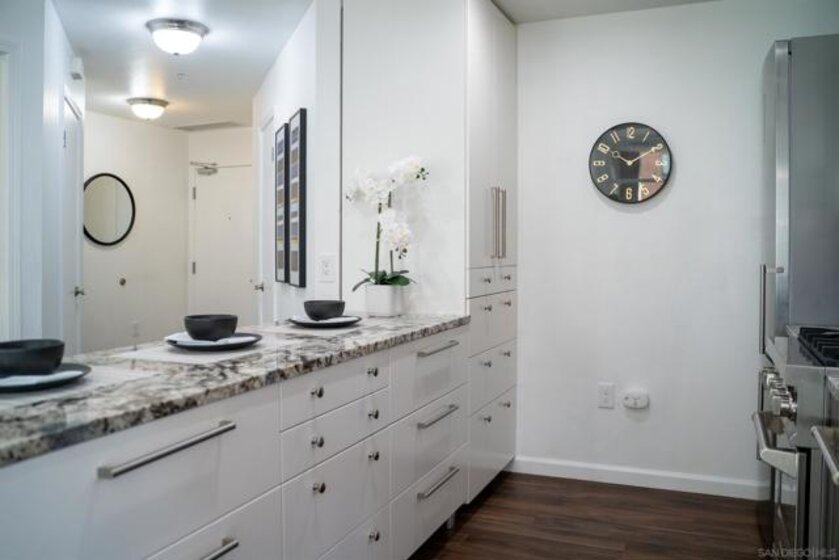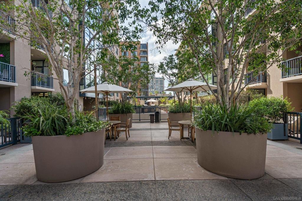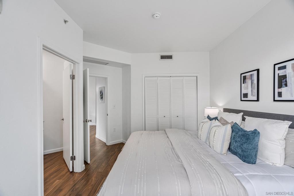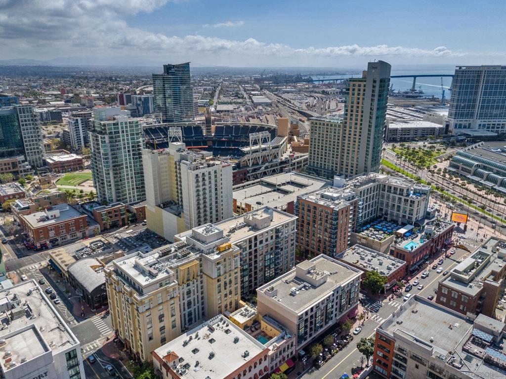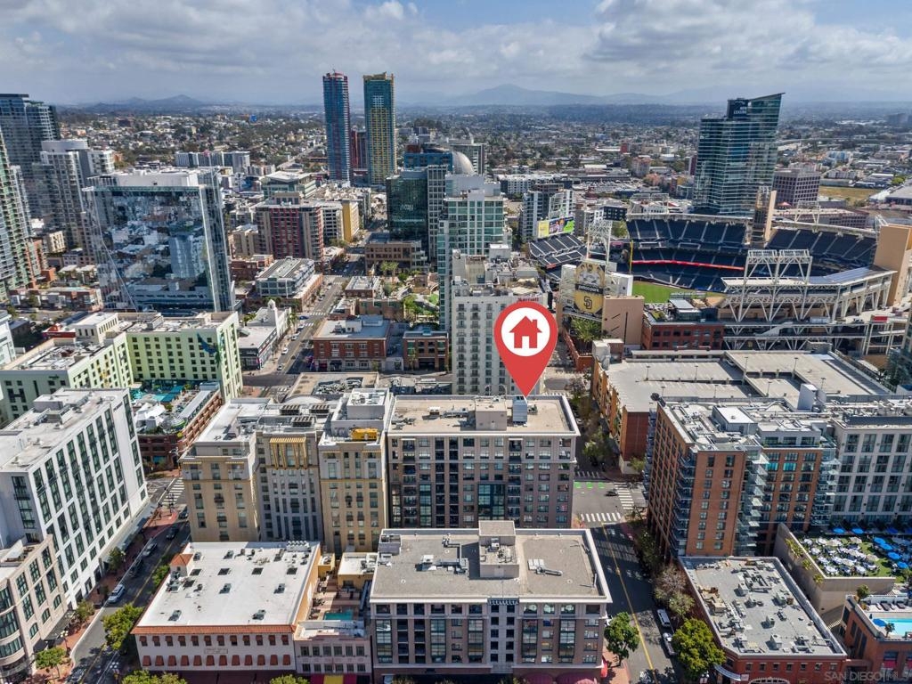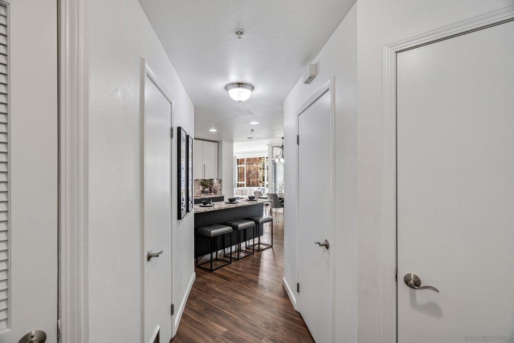 Experience a sophisticated and effortless downtown lifestyle from this perfectly positioned southeast corner residence, where abundant natural light and thoughtful design create the ideal lock-and-leave urban retreat. This exceptional two-bedroom condo with a desirable split floor plan offers both privacy and functionality while showcasing stylish, desirable upgrades throughout. Step through the entryway into an open-concept living space featuring views of Petco Park and the iconic right-field jumbotron, creating a dynamic downtown backdrop. The reimagined gourmet kitchen impresses with a newly added island and pantry, luxurious granite countertops with a full-height backsplash, and a suite of upgraded appliances, including a ZLINE range for coveted gas cooking, dishwasher, microwave hood, and refrigerator—perfect for both casual dining and effortless entertaining. The serene primary suite features custom built-in closets and a beautifully renovated bathroom showcasing large-format tile, an elegant Carrera marble vanity, and an oversized mirrored medicine cabinet. The guest bathroom has also been fully remodeled, offering matching finishes and contemporary design. Additional highlights include luxury vinyl flooring throughout, designer paint, custom built-in closets in both bedrooms, two hallway closets with integrated shelving, and a thoughtfully designed layout that maximizes both comfort and livability. Modern urban comforts include in-unit laundry and two side-by-side parking spaces, providing both convenience and functionality. Trellis is a VA-approved community offering exceptional amenities, including weekend evening security, a fully equipped fitness center, rooftop BBQ terraces on the second floor, an interior courtyard seating with a tranquil water feature, Amazon package lockers, a community information display, and a sleek modern lobby entrance. Residents enjoy a prime downtown location close to Petco Park, Gallagher Square, the historic Gaslamp Quarter archway, renowned dining and shopping, bus and trolley transportation, the new Children’s and Dog Park, and the Harbor Drive Pedestrian Bridge, which connects to The Rady Shell, the Convention Center, Seaport Village, Embarcadero Parks, the Coronado Ferry Landing, and San Diego Bay. The very best of the city is just moments from home.