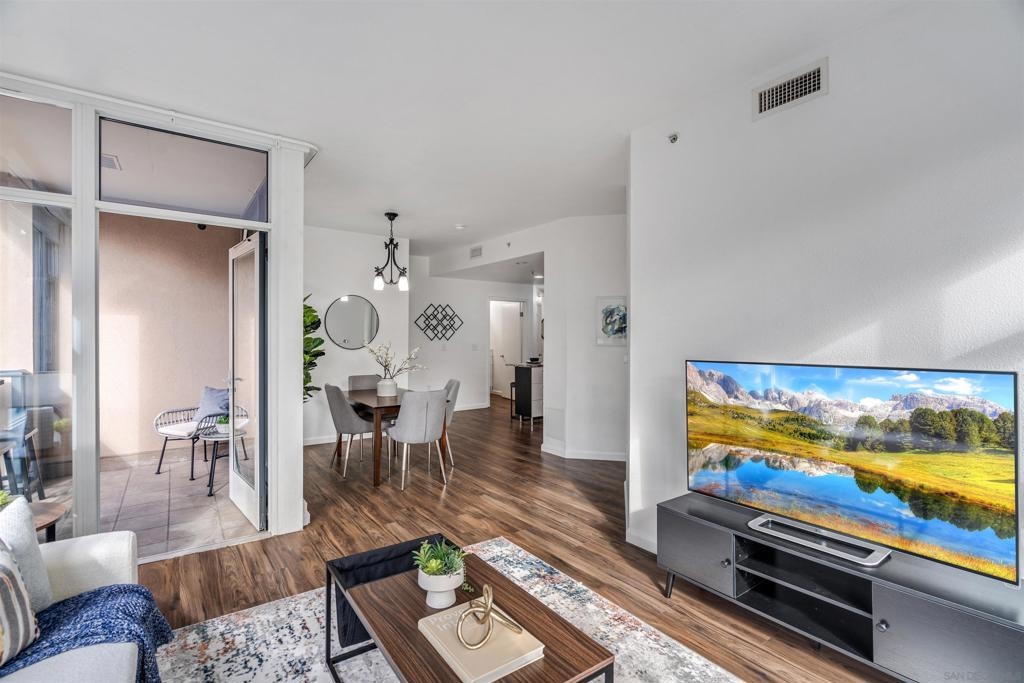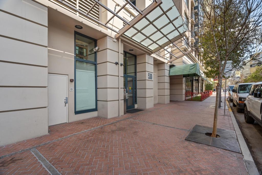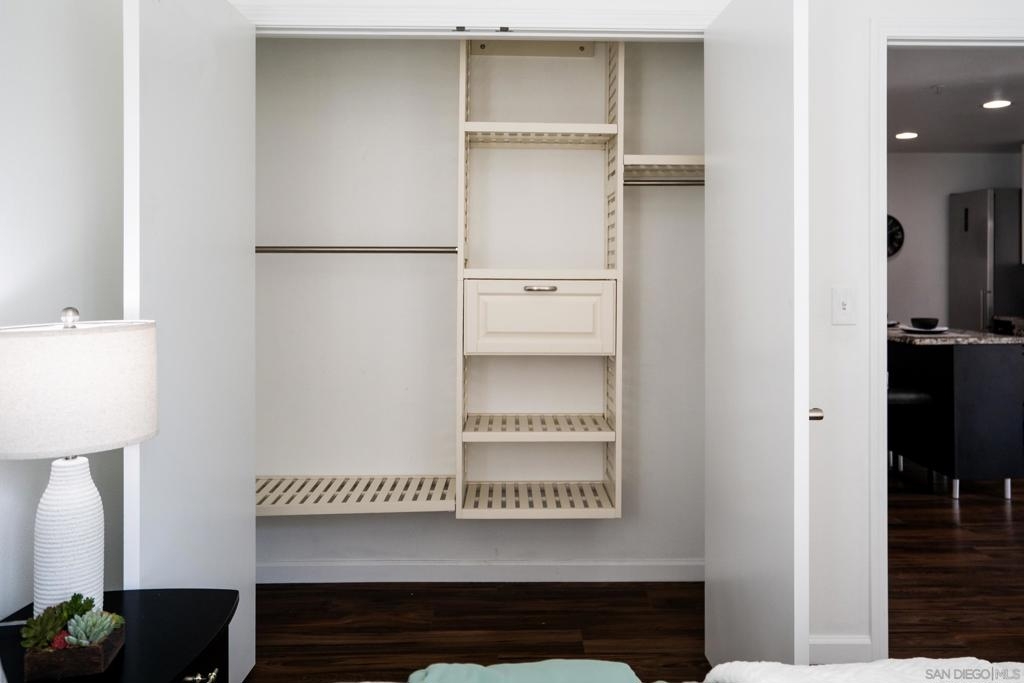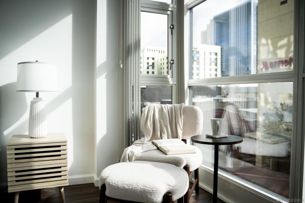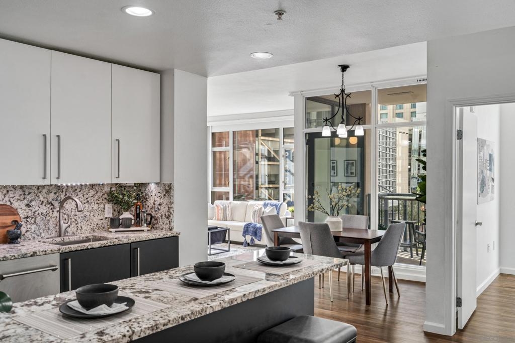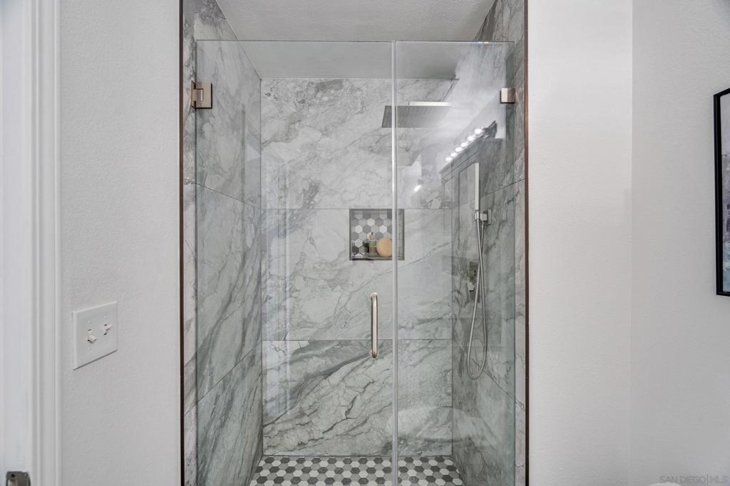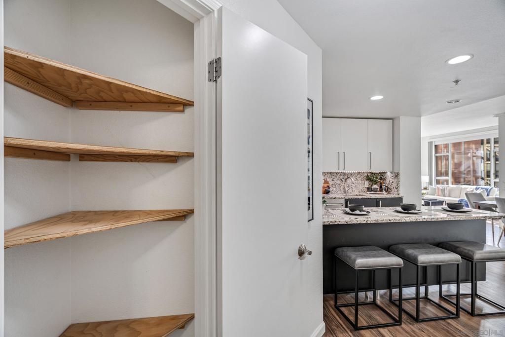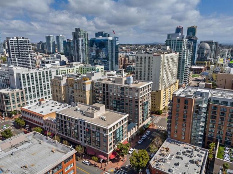 Experience a sophisticated and effortless downtown lifestyle from this perfectly positioned southeast corner residence, where abundant natural light and thoughtful design create the ideal lock-and-leave urban retreat. This exceptional two-bedroom condo with a desirable split floor plan offers both privacy and functionality while showcasing stylish, desirable upgrades throughout. Step through the entryway into an open-concept living space featuring views of Petco Park and the iconic right-field jumbotron, creating a dynamic downtown backdrop. The reimagined gourmet kitchen impresses with a newly added island and pantry, luxurious granite countertops with a full-height backsplash, and a suite of upgraded appliances, including a ZLINE range for coveted gas cooking, dishwasher, microwave hood, and refrigerator—perfect for both casual dining and effortless entertaining. The serene primary suite features custom built-in closets and a beautifully renovated bathroom showcasing large-format tile, an elegant Carrera marble vanity, and an oversized mirrored medicine cabinet. The guest bathroom has also been fully remodeled, offering matching finishes and contemporary design. Additional highlights include luxury vinyl flooring throughout, designer paint, custom built-in closets in both bedrooms, two hallway closets with integrated shelving, and a thoughtfully designed layout that maximizes both comfort and livability. Modern urban comforts include in-unit laundry and two side-by-side parking spaces, providing both convenience and functionality. Trellis is a VA-approved community offering exceptional amenities, including weekend evening security, a fully equipped fitness center, rooftop BBQ terraces on the second floor, an interior courtyard seating with a tranquil water feature, Amazon package lockers, a community information display, and a sleek modern lobby entrance. Residents enjoy a prime downtown location close to Petco Park, Gallagher Square, the historic Gaslamp Quarter archway, renowned dining and shopping, bus and trolley transportation, the new Children’s and Dog Park, and the Harbor Drive Pedestrian Bridge, which connects to The Rady Shell, the Convention Center, Seaport Village, Embarcadero Parks, the Coronado Ferry Landing, and San Diego Bay. The very best of the city is just moments from home.