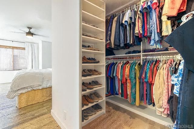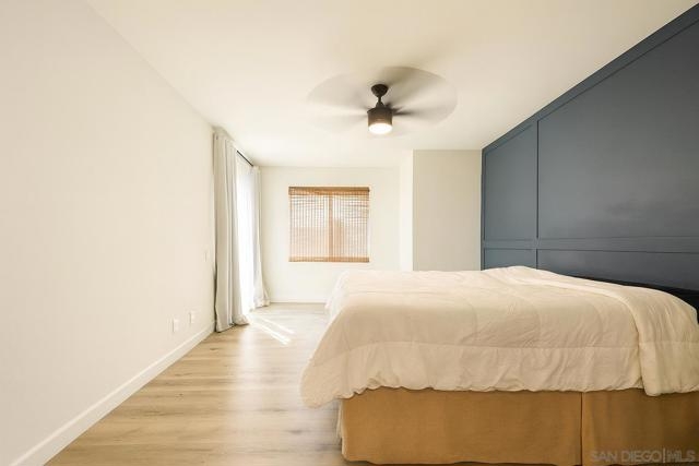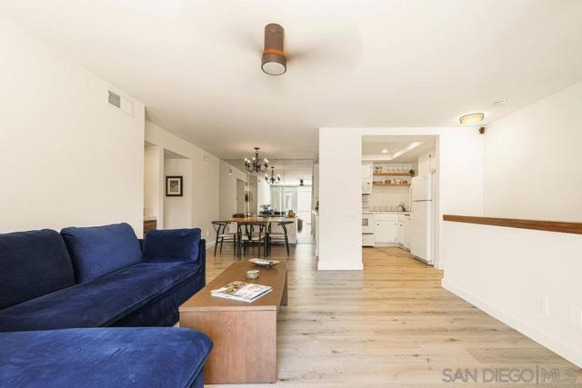 BOM, No fault of the seller. Surrounded by scenic canyons and trails, this move-in-ready condo in Villa Colina, Tierrasanta, offers the perfect balance of nature and convenience. Inside, the spacious open-concept layout features a fireplace, stylish vinyl plank flooring, neutral interior paint, and a ceiling fan for year-round comfort. A remote-controlled blind on the high entryway window, along with blackout drapes in the living room, provides both privacy and light control. Enjoy a private balcony that serves as an extension of your living area, complete with extra storage. The bedroom features its own ceiling fan for added comfort, blackout drapes, and a custom walk-in closet with built-in storage, providing organized space. The bathroom features a modern light fixture, a newer sink faucet, a newer toilet, and a convenient shower/bath combo. A rare, oversized two-car side-by-side garage features an epoxy floor, washer/dryer, and generous storage space, along with space for a home gym and a work/hobby bench, all with direct interior access. Enjoy access to nearby Shepherd Canyon trails, sparkling community pools, breathtaking sunset views, and the tranquility of nature, all within minutes of shopping, dining, and freeway access.