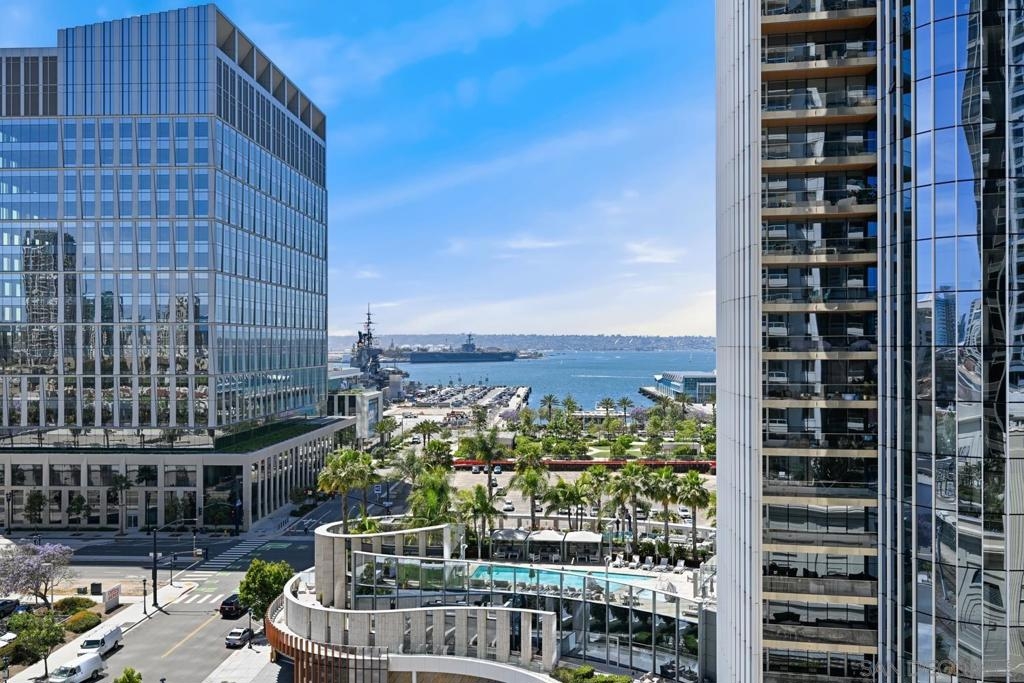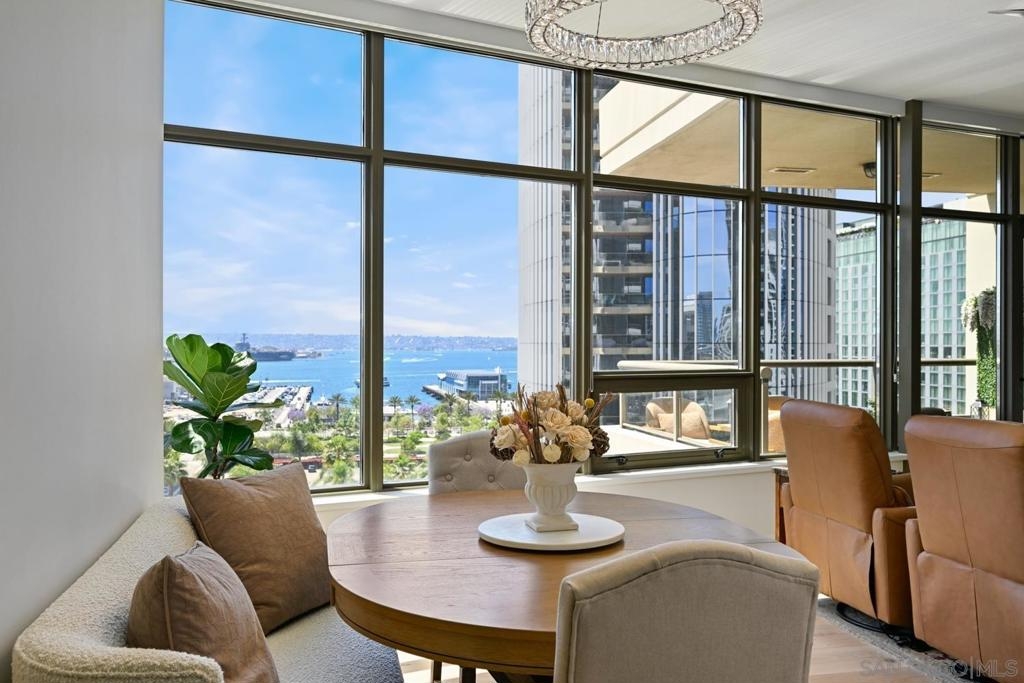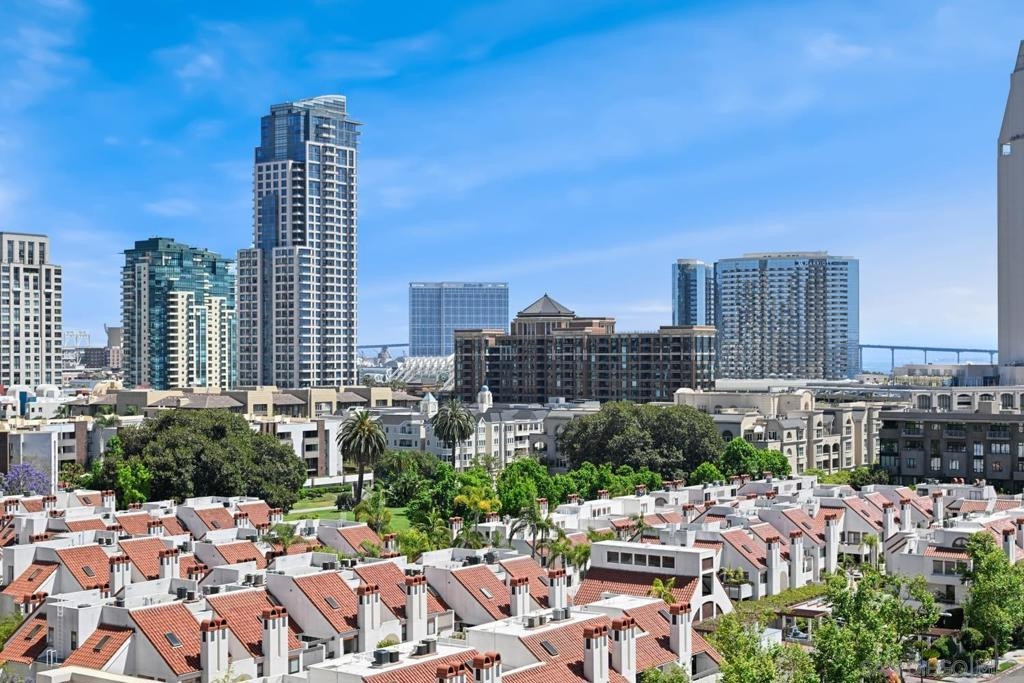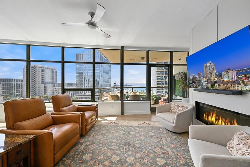 Sophisticated and seldom available, this southwest corner residence in the iconic Electra Building features 2 bedrooms, 2 baths, and a versatile bonus room perfect for a third bedroom or home office—your chance to enjoy the ultimate “corner office” with stunning bay and city views. Thoughtfully redesigned with over $260,000 in upgrades, this bright, open home is wrapped in expansive windows that capture panoramic vistas from every room. A private west-facing terrace provides the perfect setting for sunset skies and vibrant firework displays. The inviting living area is anchored by a cozy fireplace with custom built-ins, blending comfort with refined style. The kitchen is beautifully updated with quartz countertops, bar seating, a custom tile backsplash, and a built-in microwave—ideal for both entertaining and everyday living. The generous primary suite includes dual closets, one being a walk-in, and a luxurious remodeled bath with dual sinks, a walk-in shower, and a separate soaking tub. A full-size stacked washer and dryer adds convenience. Additional features include an oversized assigned parking space—suitable for two compact vehicles—complete with an EV charger, plus dedicated storage on the third floor. Residents enjoy access to the stunning restored historic conservatory with soaring cathedral ceilings, along with premium amenities such as 24-hour concierge service, a pool, spa, sauna, steam room, a fully renovated TechnoGym fitness center, and outdoor BBQ and dining areas. Come and experience upscale urban living in the heart of Downtown San Diego! Ideally located in the heart of Downtown, you are surrounded by all that makes living in San Diego great - Petco Park, bustling cafes, bars, boutiques, Balboa Park, the waterfront, Coronado Island, Little Italy, Gaslamp District and so much more!