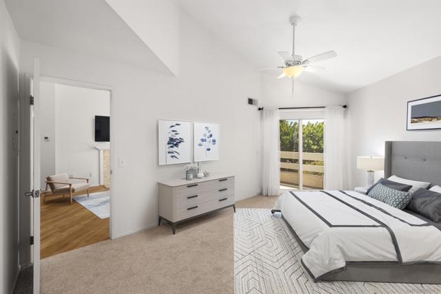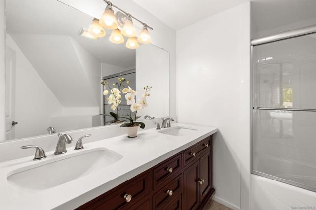 This stunning top-floor, end-unit condo offers the perfect blend of comfort, style, and convenience. With two spacious bedrooms, two full bathrooms, and a generous loft, the open layout is enhanced by soaring vaulted ceilings that flood the home with natural light. Thoughtfully updated throughout, the interior features an updated kitchen with stainless steel appliances and extended granite countertop, renovated bathrooms, energy-efficient dual-pane windows, and luxury vinyl plank flooring with cork backing. The home also includes a newer furnace (installed in 2023) and an upgraded water heater (2017). Step outside to your private balcony—an ideal spot for morning coffee or evening relaxation. This home also includes a two-car detached tandem garage for added convenience. Located in the sought-after City Scene community, residents enjoy access to a sparkling saltwater pool, a fully equipped fitness center, and BBQ areas for outdoor gatherings. With close proximity to USD, SDSU, Fashion Valley Mall, and major freeways, this beautifully upgraded condo offers both serenity and accessibility. Don’t miss your opportunity to own this light-filled top-floor retreat!
