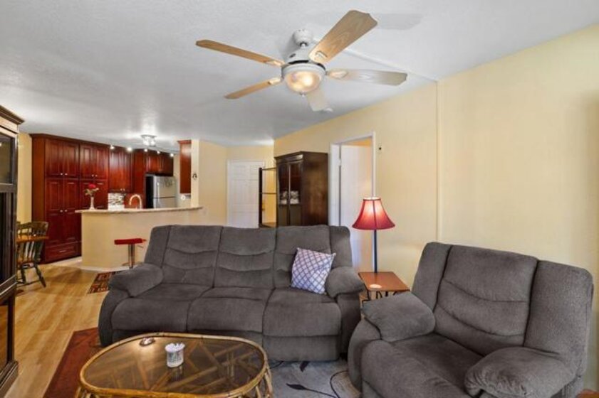 Charming Fashion Valley condo offering comfort, convenience, and RARE NO STAIRS ACCESS. Enjoy direct entry from the parking area with a tandem garage located just across the hall—an exceptional feature for easy everyday living. The thoughtful split-bedroom floor plan provides privacy, making it ideal for guests or roommates. The kitchen features beautiful cherry wood cabinetry extending to the ceiling, granite countertops, and ample storage. Bathrooms have been tastefully updated, including a spacious walk-in shower with seating and glass enclosure. Additional highlights include laminate and carpet flooring, indoor stackable laundry, a cozy fireplace, and a shaded private patio perfect for relaxation. Recent upgrades include a newer furnace, air conditioning, and water heater. The well-maintained community offers a heated saltwater pool and a fully equipped fitness center. Centrally located just minutes to Fashion Valley Mall, dining, beaches, and downtown San Diego. Optional purchase: Home may be sold fully furnished with linens, housewares, and décor—truly turnkey. Property Highlights Charming Fashion Valley condo designed for comfortable, low-maintenance living Rare no-stairs access with direct entry from the parking area — tandem garage located just across the hall Smart, well-designed floor plan with separate bedrooms and bathrooms, ideal for privacy, guests, or roommates Beautiful cherry wood kitchen cabinetry extending to the ceiling, complemented by granite countertops Updated bathrooms featuring a spacious walk-in shower with seating and glass enclosure Combination of laminate and carpet flooring throughout Convenient indoor stackable laundry Cozy fireplace and a shaded private patio, perfect for relaxing or enjoying morning coffee Recently updated furnace, air conditioning, and water heater Community amenities include a heated saltwater pool and a fully equipped fitness center Prime central location just minutes to Fashion Valley Mall, dining, beaches, and downtown San Diego Optional purchase: Home may be sold fully furnished with linens, housewares, and décor — a truly turnkey opportunity