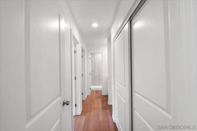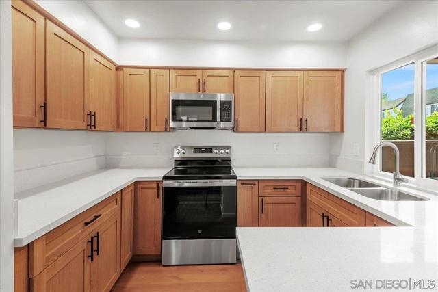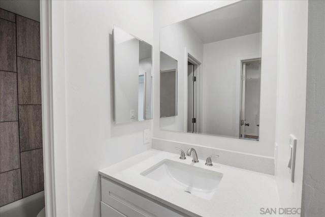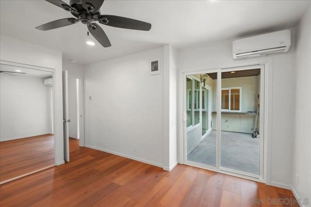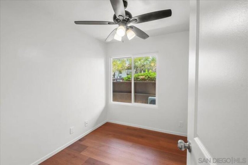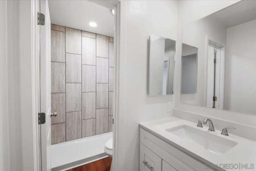Welcome to your Mission Valley retreat! Step inside this bright and airy updated condo featuring an open floor plan, warm flooring, and a private outdoor patio—perfect for relaxing or entertaining. The living room opens seamlessly to the dining area and remodeled kitchen, complete with beautiful cabinetry, recessed lighting, and a breakfast bar ideal for morning coffee or casual meals. The primary suite offers direct patio access and a ceiling fan for year-round comfort. An optional second bedroom makes the perfect home office, nursery, or guest space. The modern bathroom features crisp white cabinetry and a sleek walk-in shower with tile accents. Outside your door, enjoy resort-style amenities—sparkling pool & spa, BBQ area, clubhouse, gated entry, and on-site laundry. One assigned covered parking space is included. Conveniently located just minutes from Fashion Valley, USD, the San Diego River Trail, and quick freeway access to Downtown and the beaches.